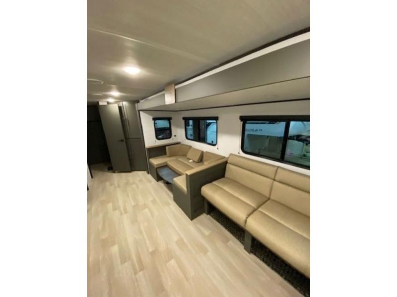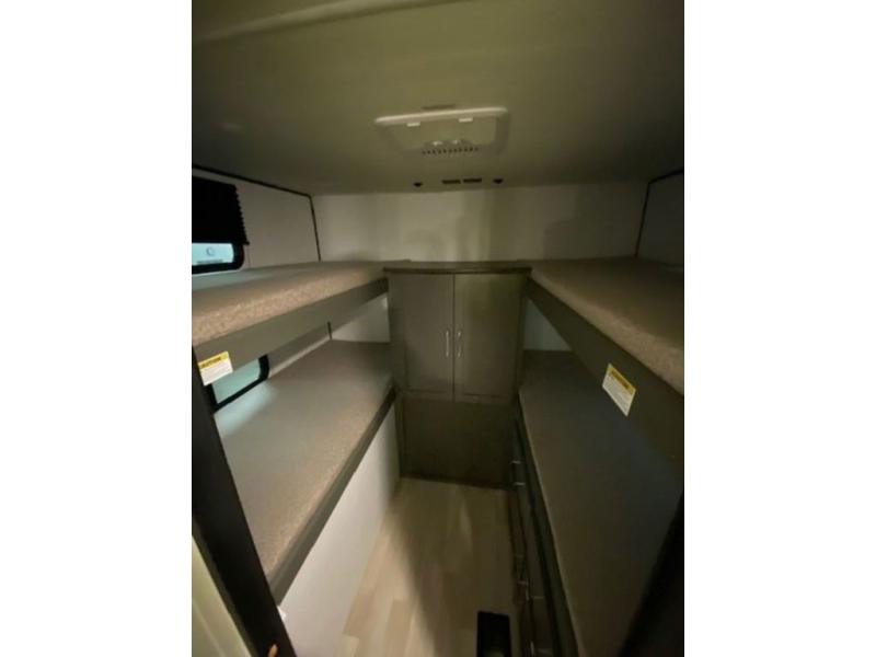 Perfect for epic road trips, serene camping excursions, or rejuvenating getaways! The trailer features four plush bunk beds, providing a cozy and inviting sleeping spot for kids or guests. A generous wardrobe offers ample storage for clothes and personal items. The full bathroom is impeccably designed and equipped with everything you need. Further, the spacious U-shaped dinette provides a warm and welcoming spot for meals and snacks, while the comfortable jackknife sofa offers a relaxing seating area that can be converted into a luxurious sleeping space. The high-performance 12V refrigerator keeps drinks and snacks perfectly chilled, and the rapid-cooking microwave provides quick reheating. Finally, after a long day of adventures, relax in the front bedroom featuring a sumptuous queen-sized bed with spacious wardrobes and convenient nightstands on each side, providing plenty of storage for your finest attire and personal items.