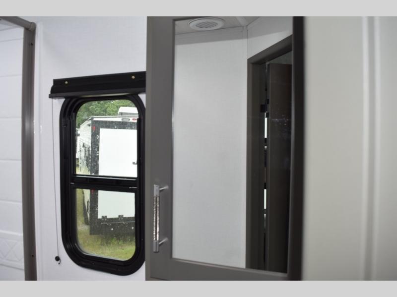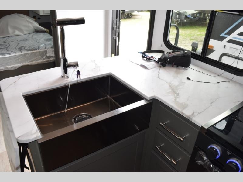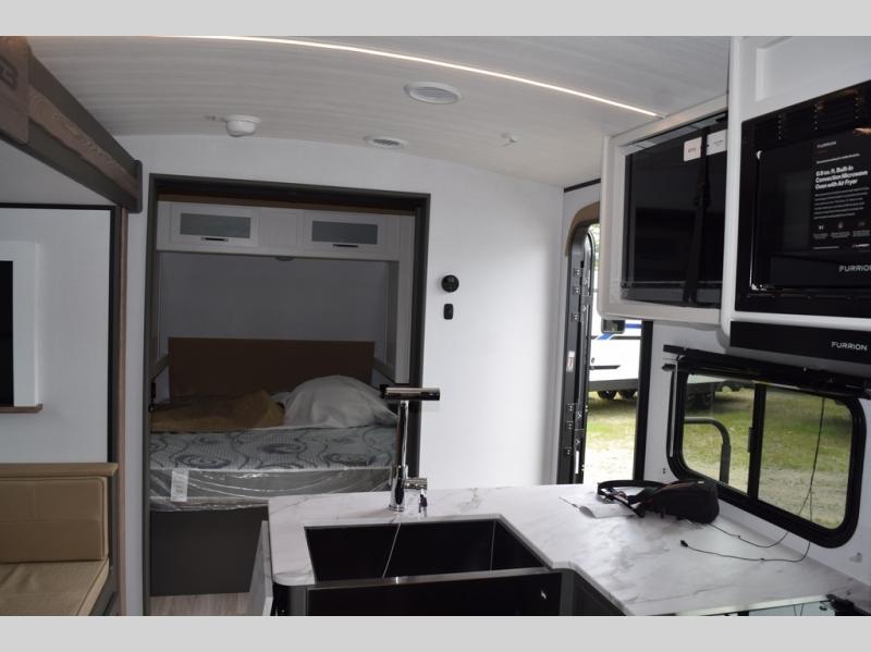 You can easily sleep eight in this travel trailer thanks to the 51" x 74" double-size bunks, the U-shaped Do-More dinette table, and the queen bed in the front bedroom. There is a laundry chute in the bedroom that will go straight to the pass-through storage for convenience. Whip up your best meals on the three burner cooktop, or use the microwave oven. You can dine around the dinette, or take your plate outdoors to sit under the 15' awning, plus there is an outdoor kitchen with a griddle, mini fridge and shelf.