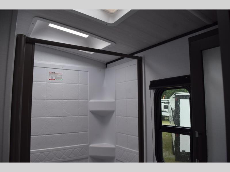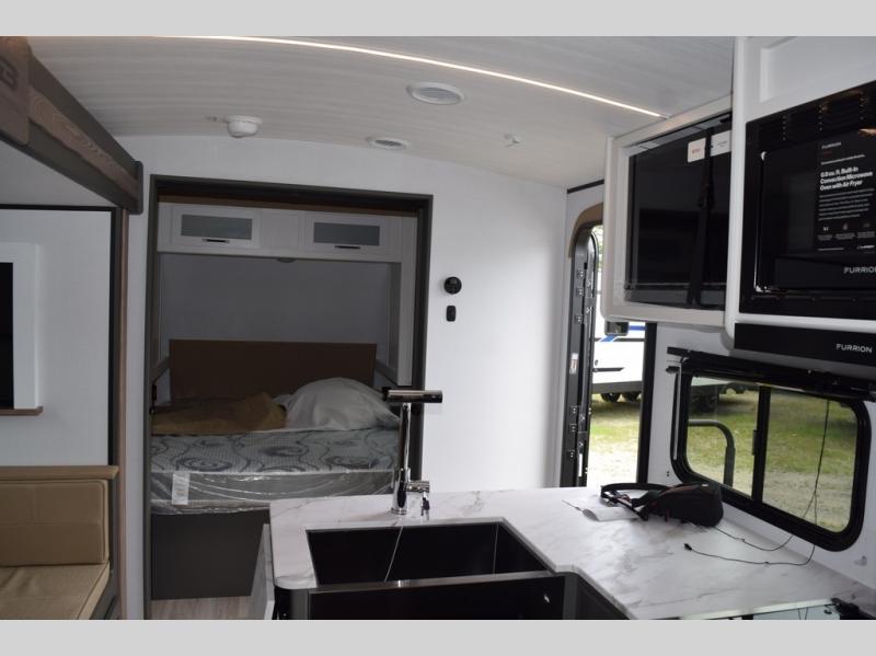You can easily sleep eight in this travel trailer thanks to the 51" x 74" double-size bunks, the U-shaped Do-More dinette table, and the queen bed in the front bedroom. There is a laundry chute in the bedroom that will go straight to the pass-through storage for convenience. Whip up your best meals on the three burner cooktop, or use the microwave oven. You can dine around the dinette, or take your plate outdoors to sit under the 15' awning, plus there is an outdoor kitchen with a griddle, mini fridge and shelf.