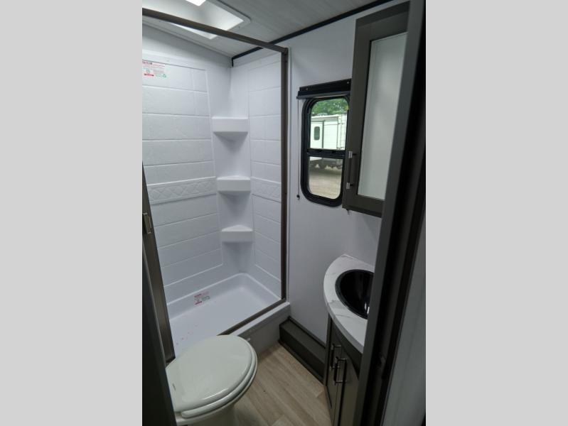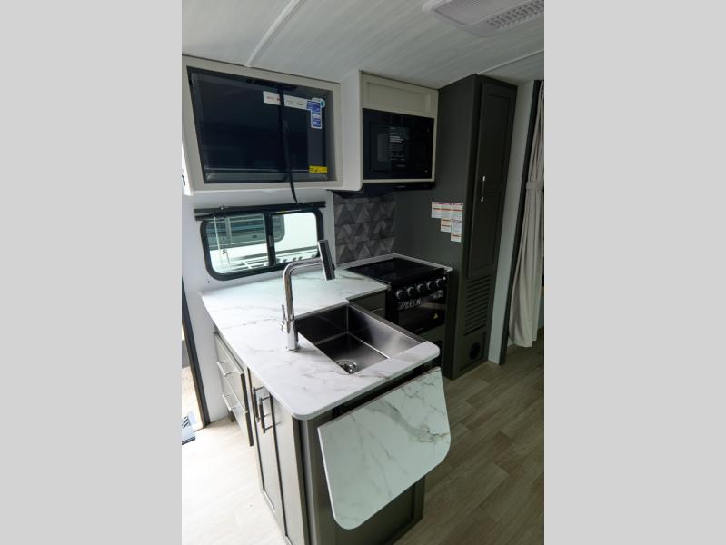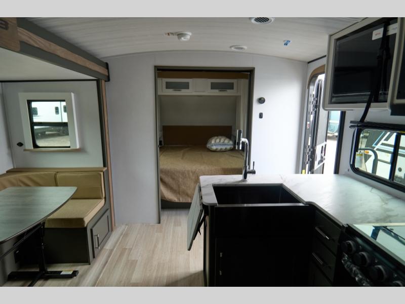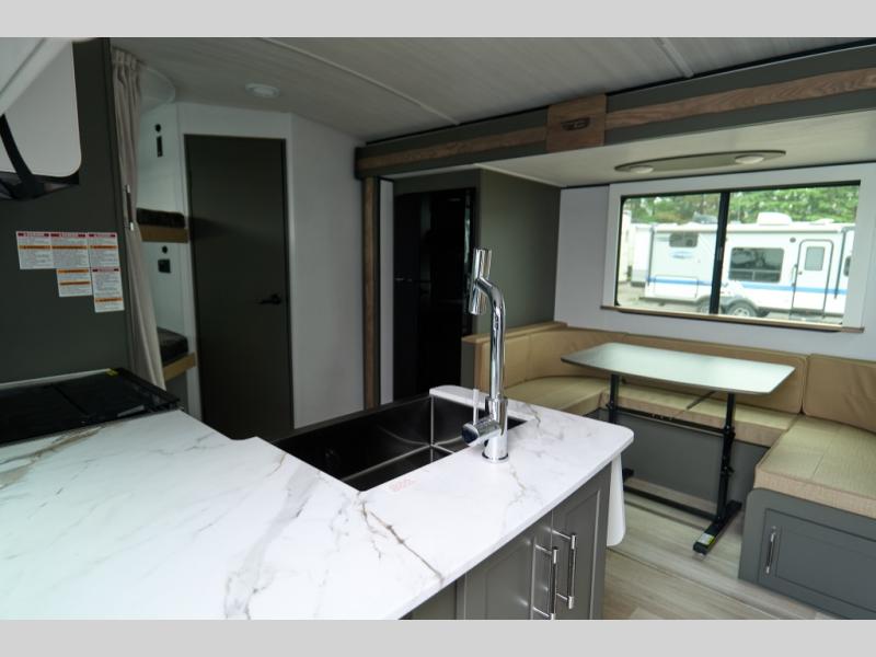 The Bullet Crossfire by Keystone are the perfect lightweight travel travel for rookie campers to seasoned RVers! Each one is built with a one-piece polypropylene underbelly, a fully walkable roof, and a high impact thermoset resin painted front cap for added durability. There is also a Dexter Torsion axle rubber ride suspension and Goodyear Endurance tires for a smooth tow plus a power tongue jack and power stabilizer jacks for easy set up. The interior will have you feeling right at home with deluxe night shades, updated Tranquil Timber decor, residential Beauflor vinyl flooring, and seamless kitchen countertops.