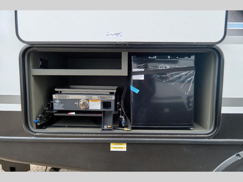 You can easily sleep eight in this travel trailer thanks to the 51" x 74" double-size bunks, the U-shaped Do-More dinette table, and the queen bed in the front bedroom. There is a laundry chute in the bedroom that will go straight to the pass-through storage for convenience. Whip up your best meals on the three burner cooktop, or use the microwave oven. You can dine around the dinette, or take your plate outdoors to sit under the 15' awning, plus there is an outdoor kitchen with a pull-out griddle and refrigerator.