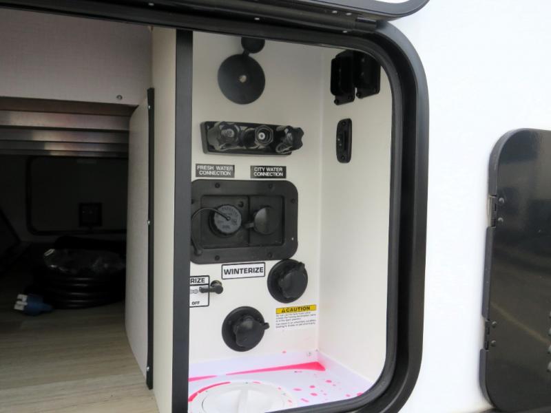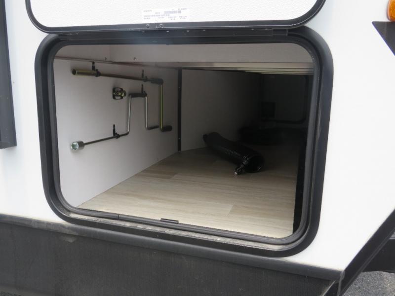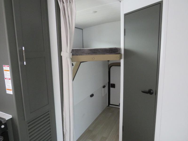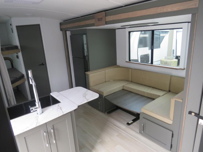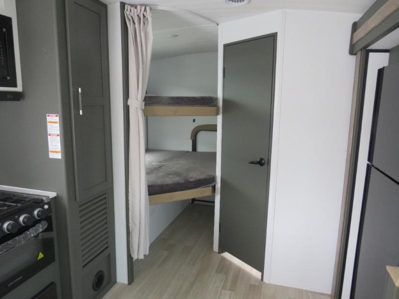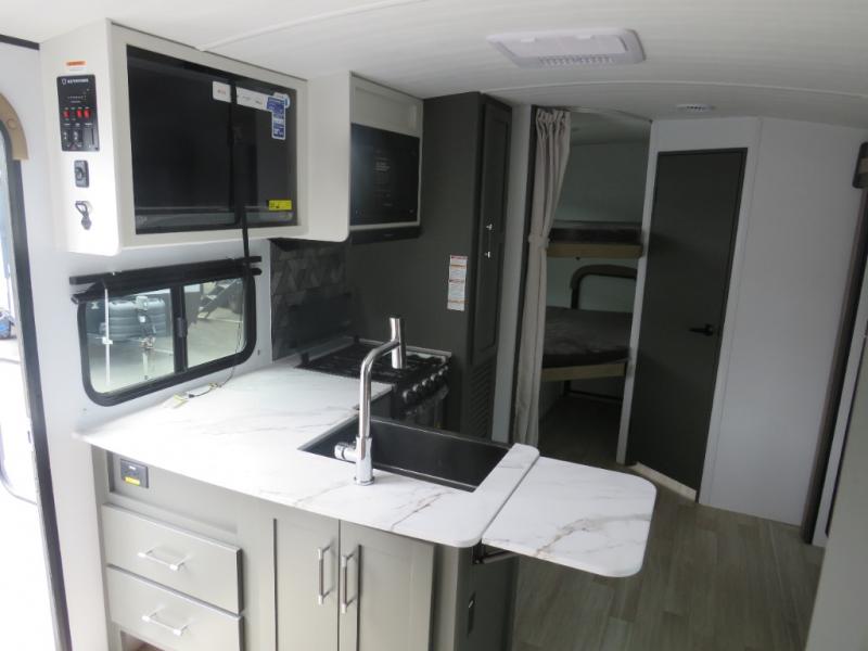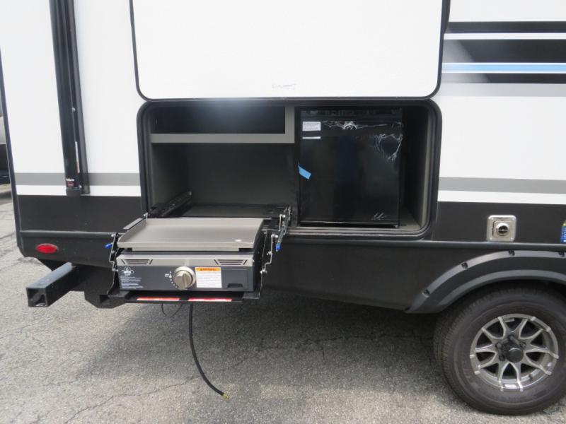 You can easily sleep eight in this travel trailer thanks to the 51" x 74" double-size bunks, the U-shaped Do-More dinette table, and the queen bed in the front bedroom. There is a laundry chute in the bedroom that will go straight to the pass-through storage for convenience. Whip up your best meals on the three burner cooktop, or use the microwave oven. You can dine around the dinette, or take your plate outdoors to sit under the 15' awning, plus there is an outdoor kitchen with a griddle, mini fridge and shelf.