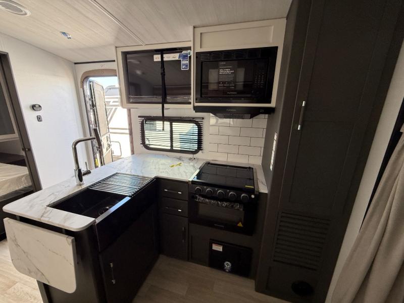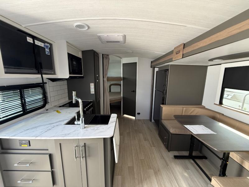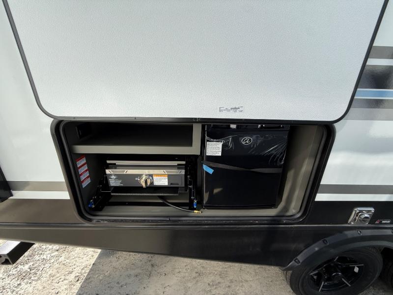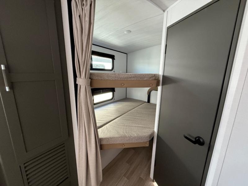 You can easily sleep eight in this travel trailer thanks to the 51" x 74" double-size bunks, the U-shaped Do-More dinette table, and the queen bed in the front bedroom. There is a laundry chute in the bedroom that will go straight to the pass-through storage for convenience. Whip up your best meals on the three burner cooktop, or use the microwave oven. You can dine around the dinette, or take your plate outdoors to sit under the 15' awning, plus there is an outdoor kitchen with a griddle, mini fridge and shelf.