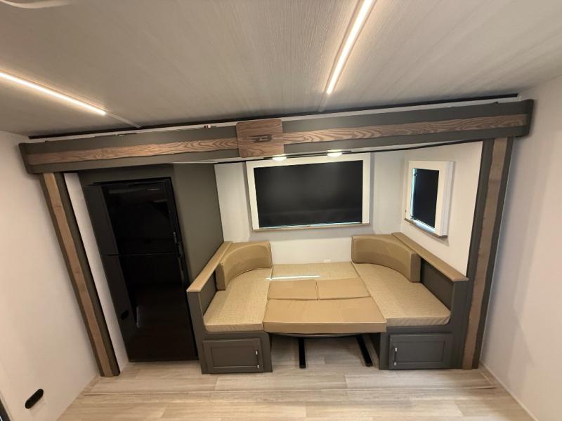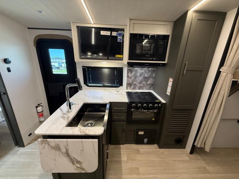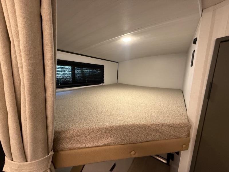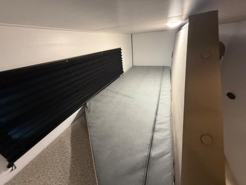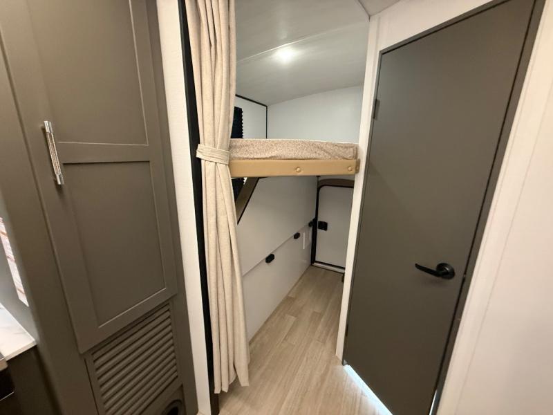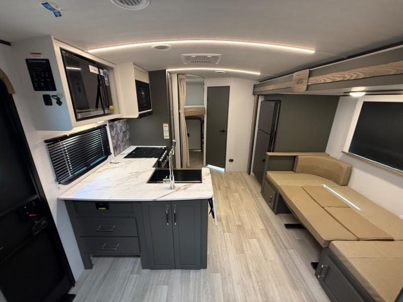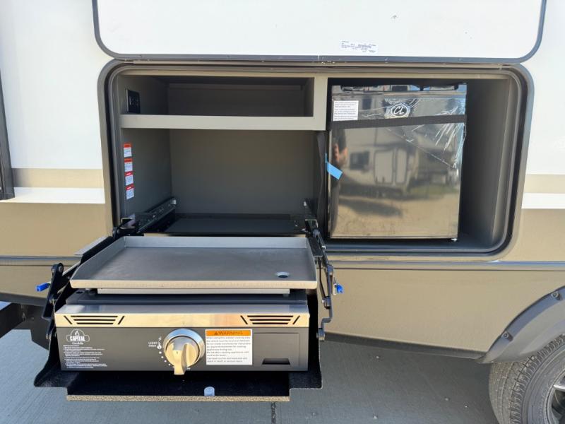 You can easily sleep eight in this travel trailer thanks to the 51" x 74" double-size bunks, the U-shaped Do-More dinette table, and the queen bed in the front bedroom. There is a laundry chute in the bedroom that will go straight to the pass-through storage for convenience. Whip up your best meals on the three burner cooktop, or use the microwave oven. You can dine around the dinette, or take your plate outdoors to sit under the 15' awning, plus there is an outdoor kitchen with a griddle, mini fridge and shelf.
