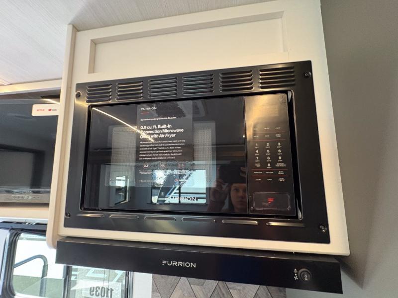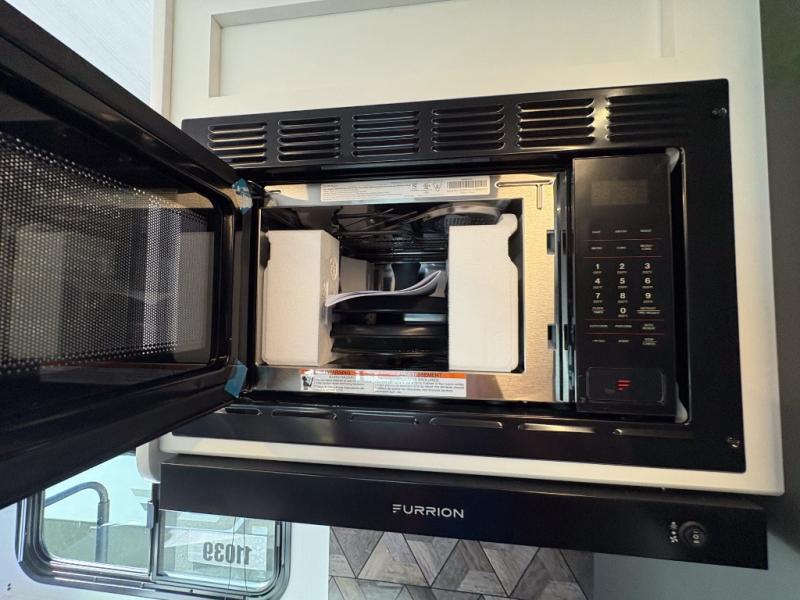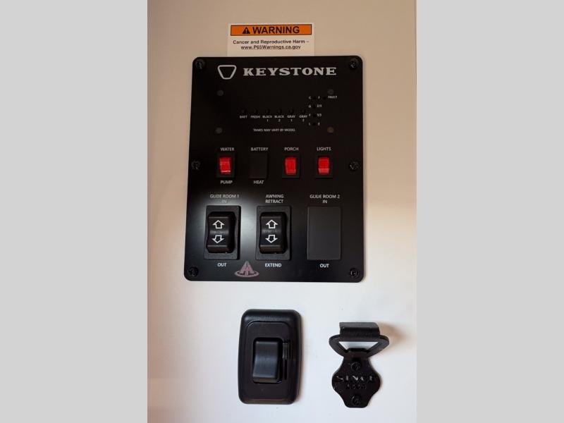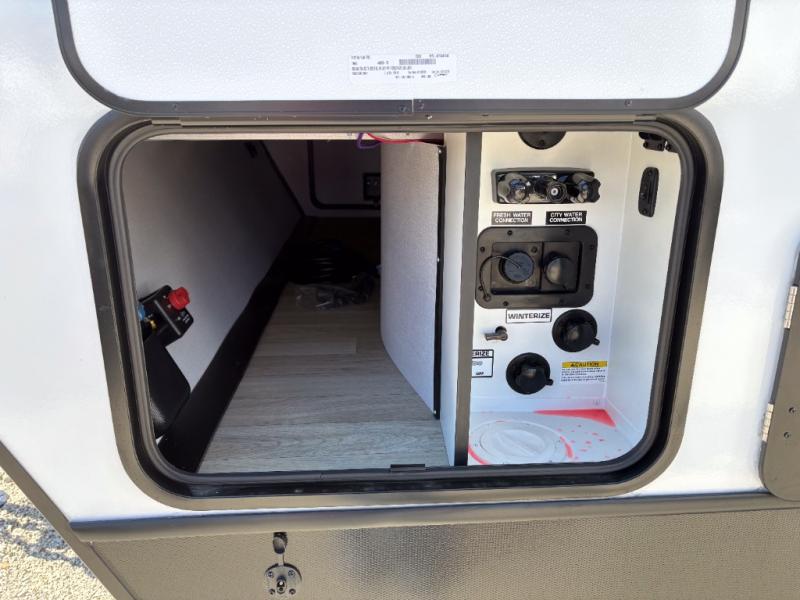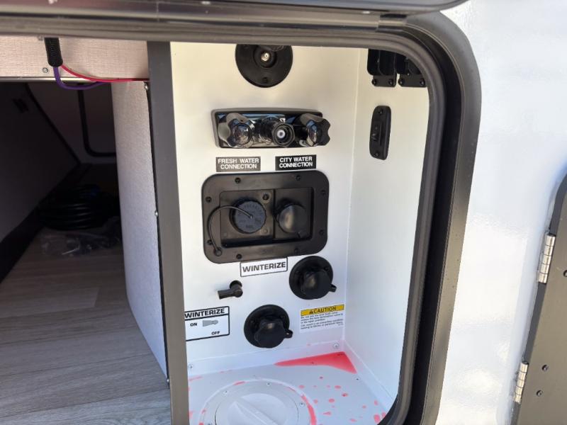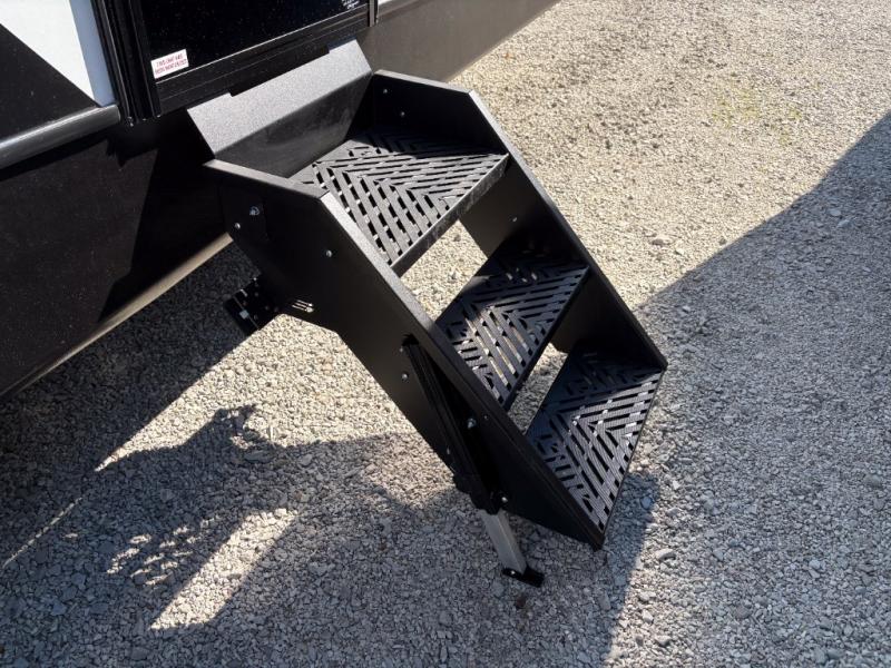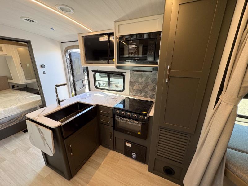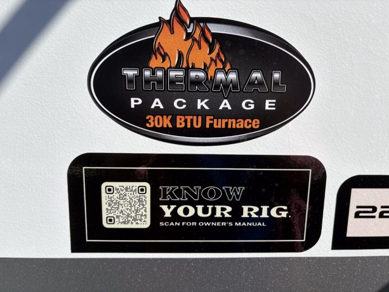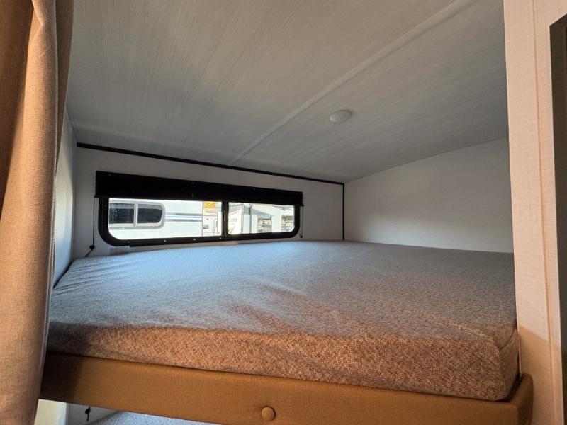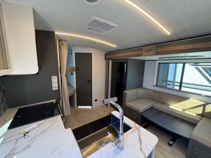You can easily sleep eight in this travel trailer thanks to the 51" x 74" double-size bunks, the U-shaped Do-More dinette table, and the queen bed in the front bedroom. There is a laundry chute in the bedroom that will go straight to the pass-through storage for convenience. Whip up your best meals on the three burner cooktop, or use the microwave oven. You can dine around the dinette, or take your plate outdoors to sit under the 15' awning, plus there is an outdoor kitchen with a griddle, mini fridge and shelf.
