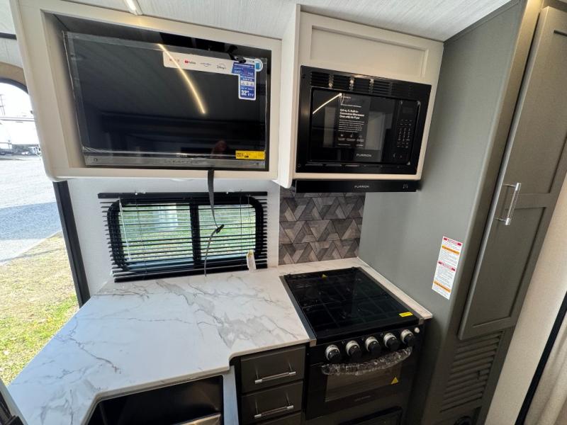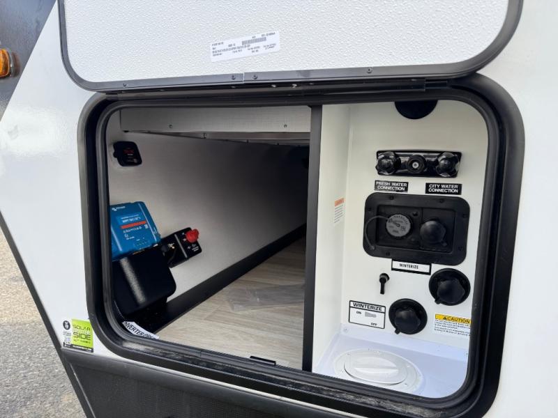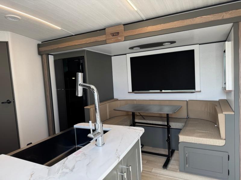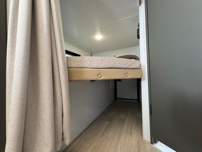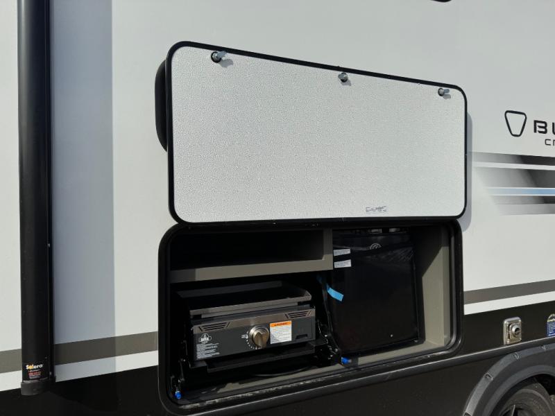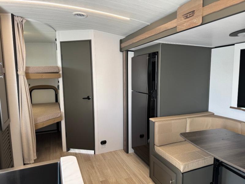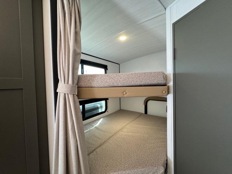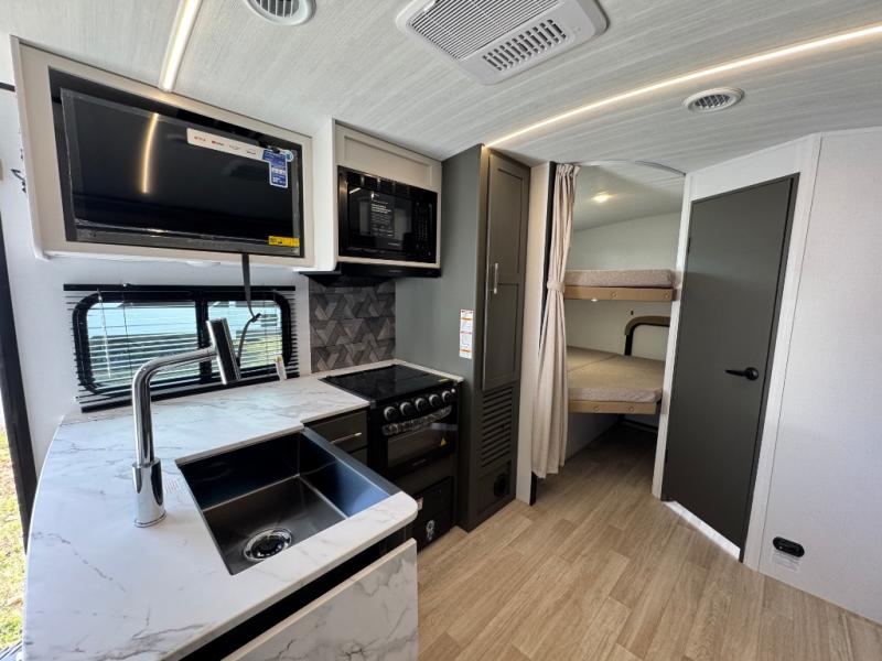 You can easily sleep eight in this travel trailer thanks to the 51" x 74" double-size bunks, the U-shaped Do-More dinette table, and the queen bed in the front bedroom. There is a laundry chute in the bedroom that will go straight to the pass-through storage for convenience. Whip up your best meals on the three burner cooktop, or use the microwave oven. You can dine around the dinette, or take your plate outdoors to sit under the 15' awning, plus there is an outdoor kitchen with a griddle, mini fridge and shelf.
