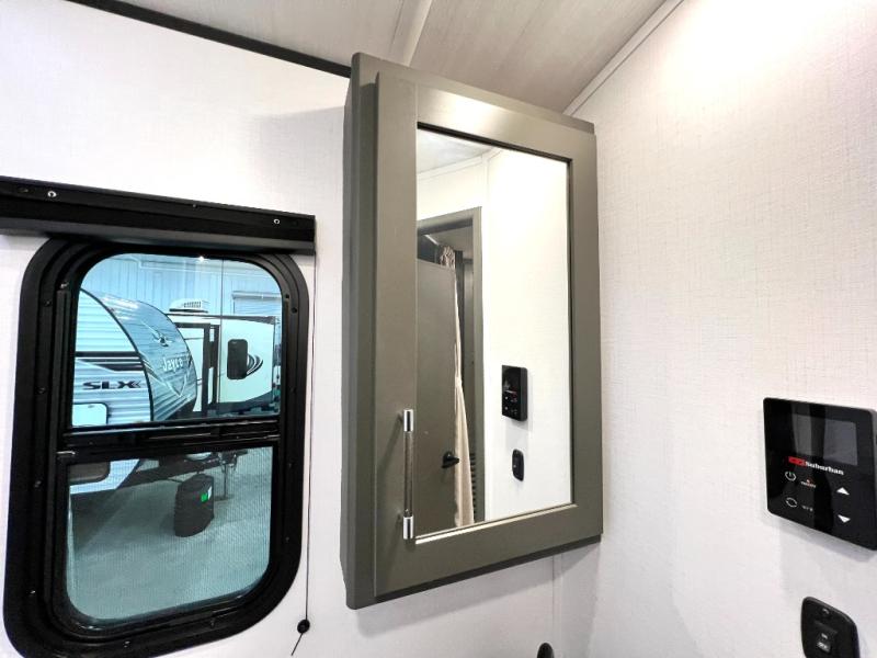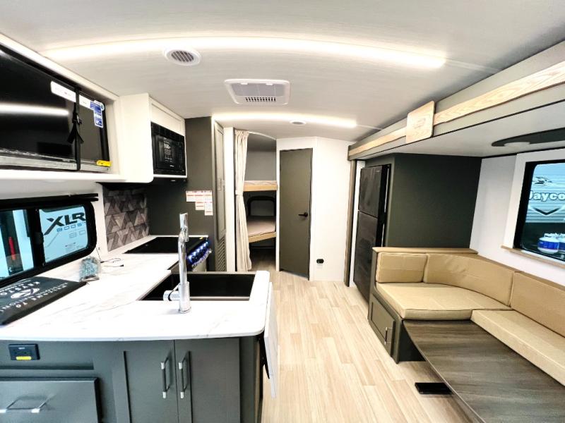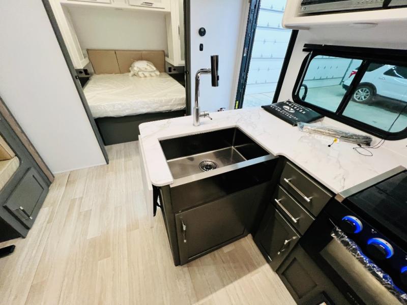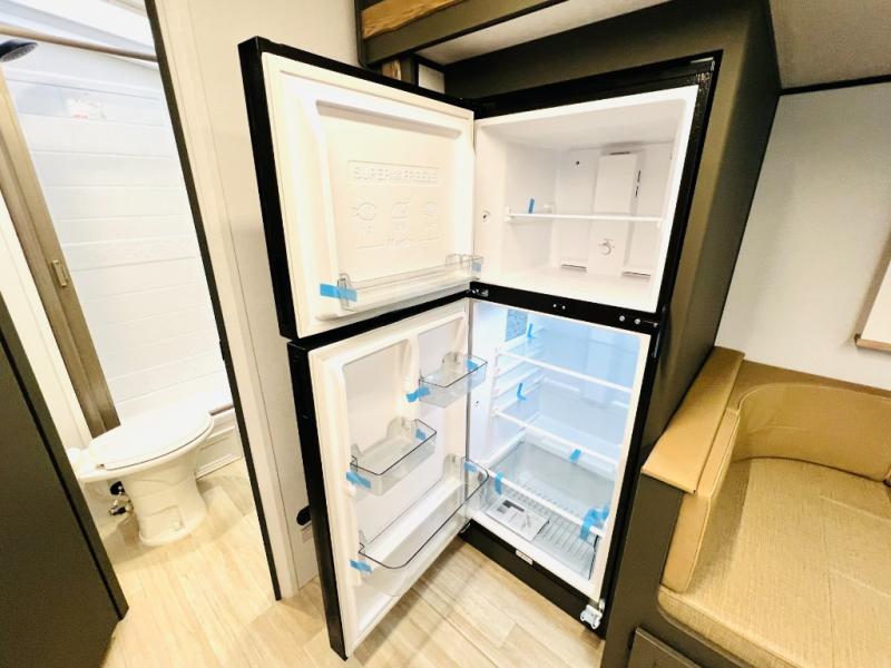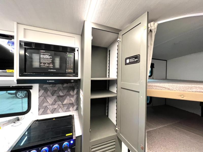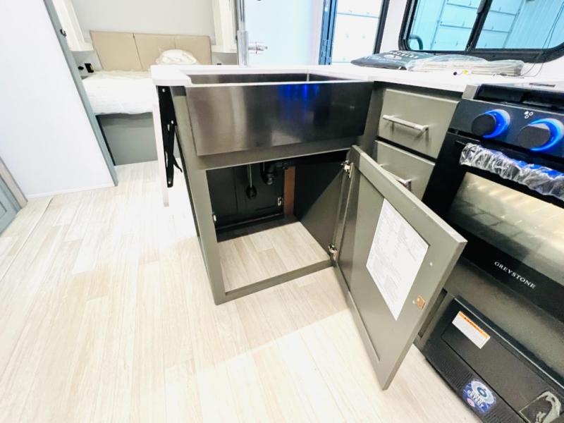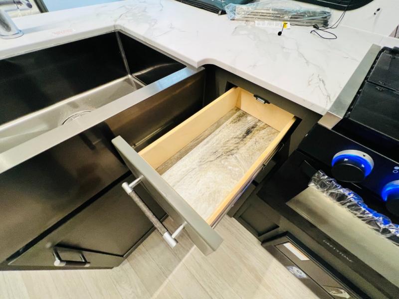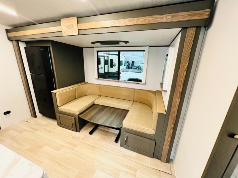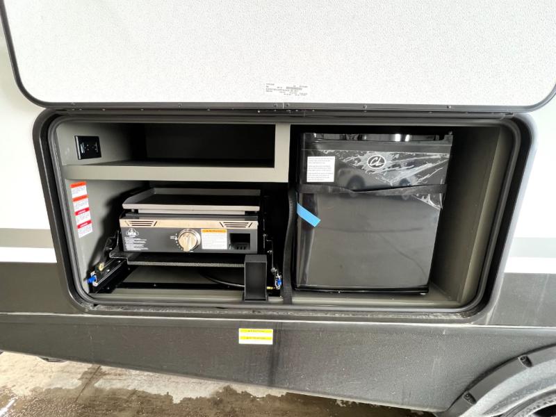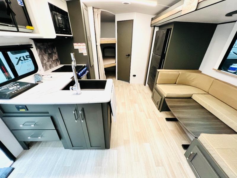 You can easily sleep eight in this travel trailer thanks to the 51" x 74" double-size bunks, the U-shaped Do-More dinette table, and the queen bed in the front bedroom. There is a laundry chute in the bedroom that will go straight to the pass-through storage for convenience. Whip up your best meals on the three burner cooktop, or use the microwave oven. You can dine around the dinette, or take your plate outdoors to sit under the 15' awning, plus there is an outdoor kitchen with a griddle, mini fridge and shelf.