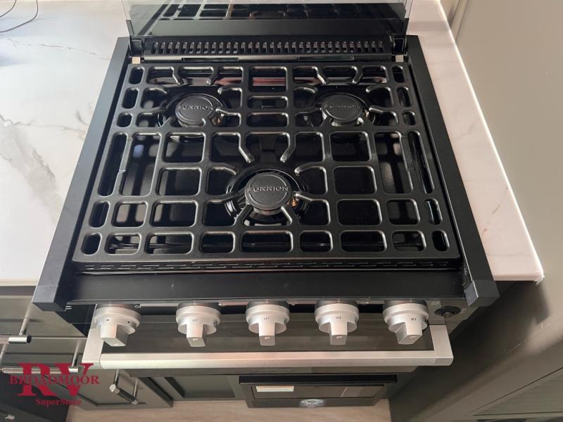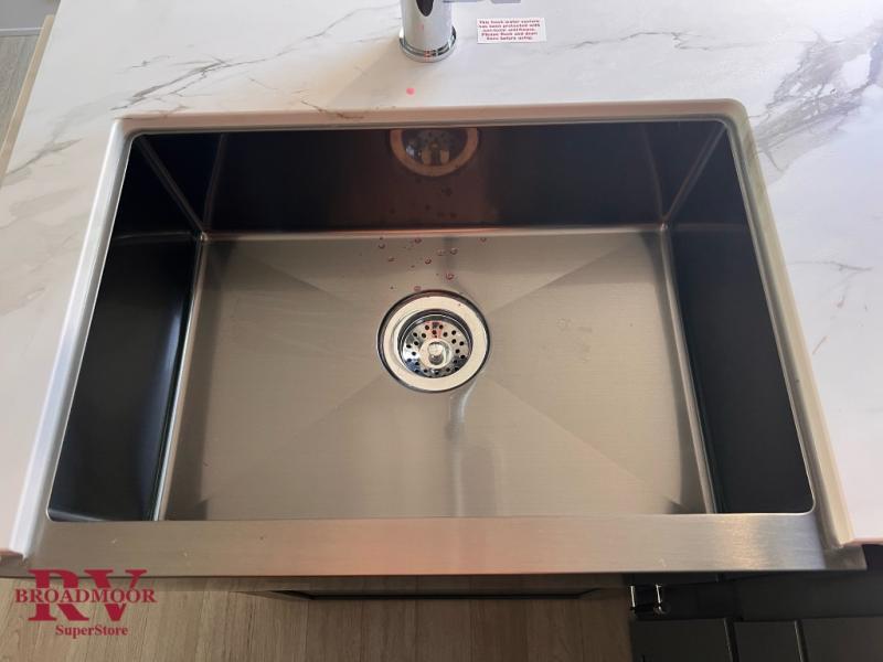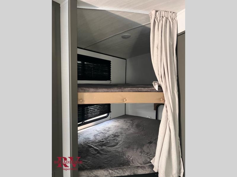 You can easily sleep eight in this travel trailer thanks to the 51" x 74" double-size bunks, the U-shaped Do-More dinette table, and the queen bed in the front bedroom. Whip up your best meals on the three burner cooktop, or use the microwave oven. You can dine around the dinette, or take your plate outdoors to sit under the 15' awning, plus there is an outdoor kitchen with a griddle, mini fridge and shelf!
