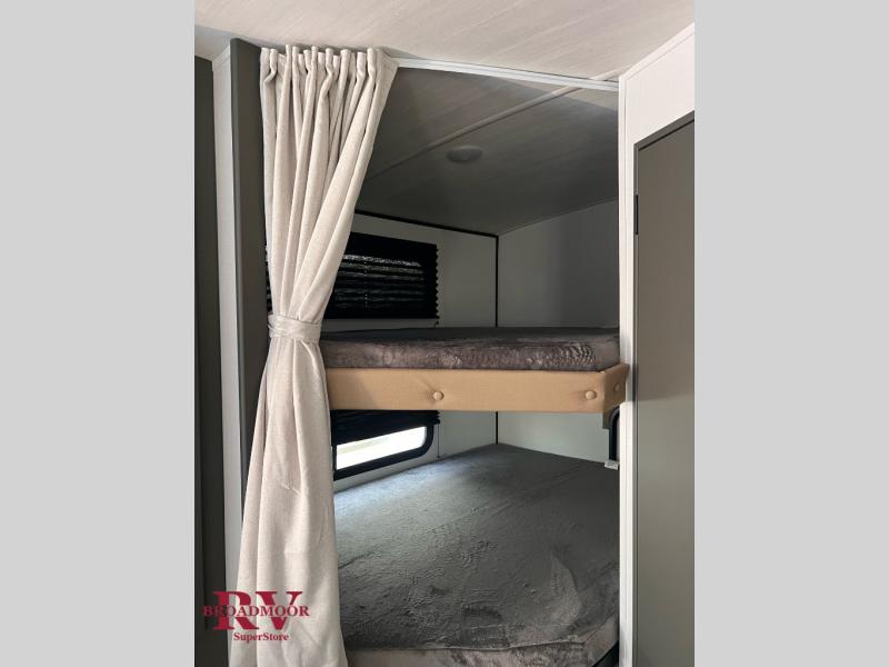You can easily sleep eight in this travel trailer thanks to the 51" x 74" double-size bunks, the U-shaped Do-More dinette table, and the queen bed in the front bedroom. Whip up your best meals on the three burner cooktop, or use the microwave oven. You can dine around the dinette, or take your plate outdoors to sit under the 15' awning, plus there is an outdoor kitchen with a griddle, mini fridge and shelf!
