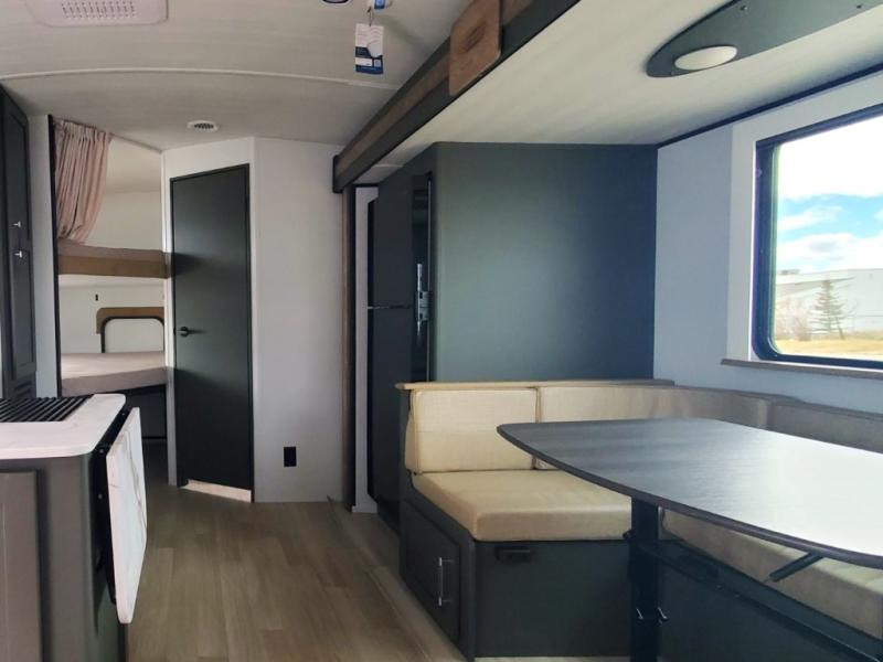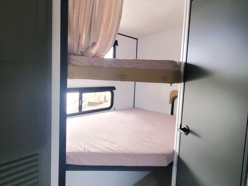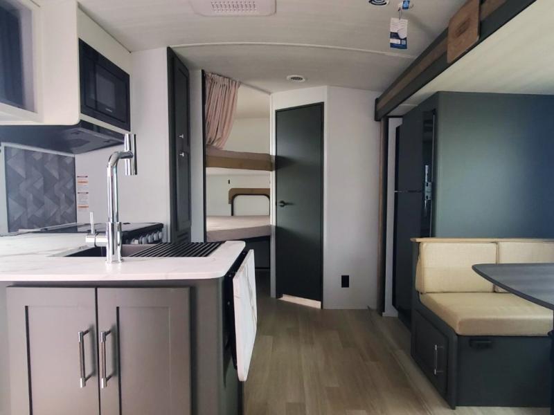 You can easily sleep eight in this travel trailer thanks to the 51" x 74" double-size bunks, the U-shaped Do-More dinette table, and the queen bed in the front bedroom. Whip up your best meals on the three burner cooktop, or use the microwave oven. You can dine around the dinette, or take your plate outdoors to sit under the 15' awning, plus there is an outdoor kitchen with a griddle, mini fridge and shelf!