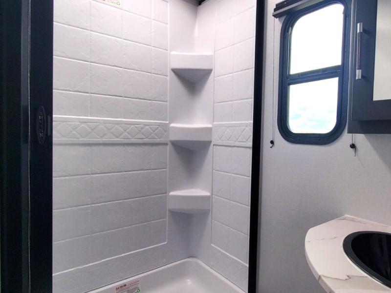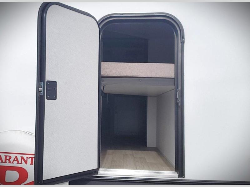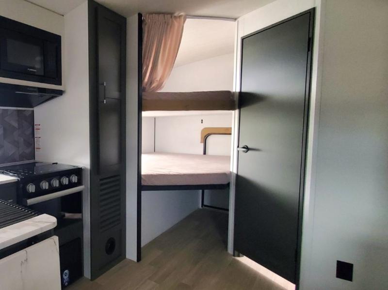 You can easily sleep eight in this travel trailer thanks to the 51" x 74" double-size bunks, the U-shaped Do-More dinette table, and the queen bed in the front bedroom. Whip up your best meals on the three burner cooktop, or use the microwave oven. You can dine around the dinette, or take your plate outdoors to sit under the 15' awning, plus there is an outdoor kitchen with a griddle, mini fridge and shelf!