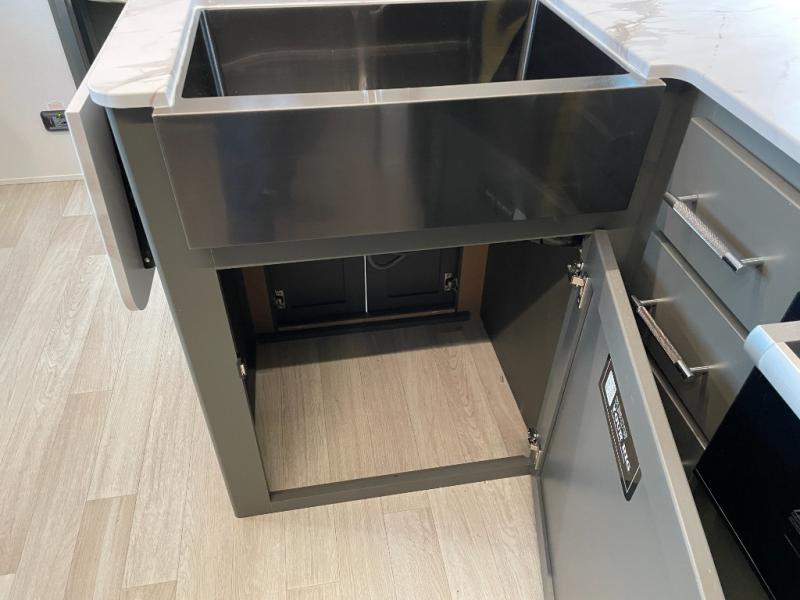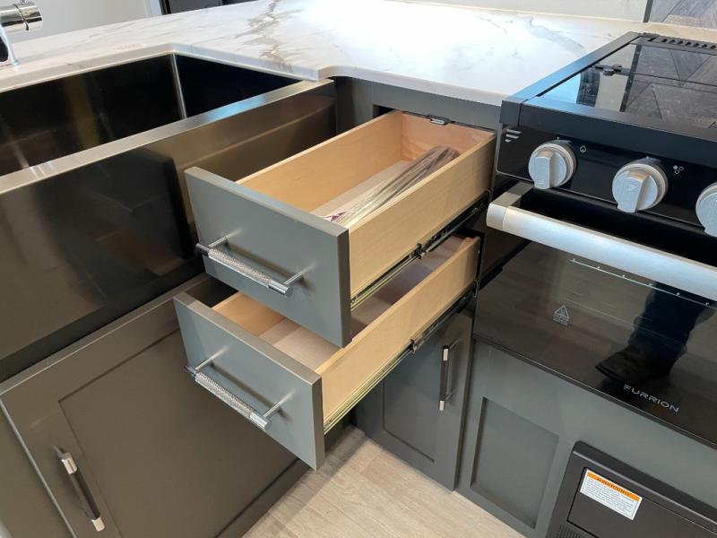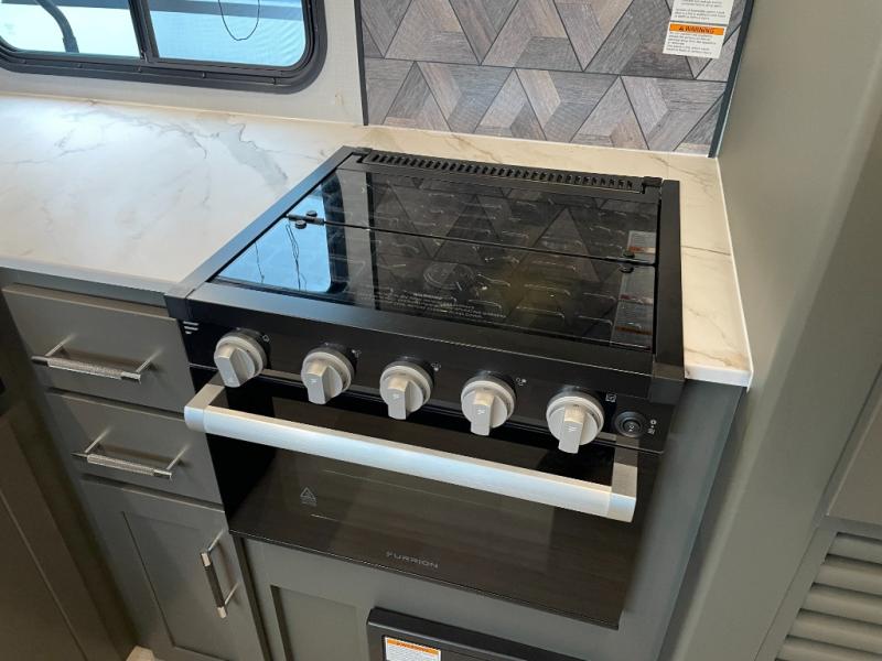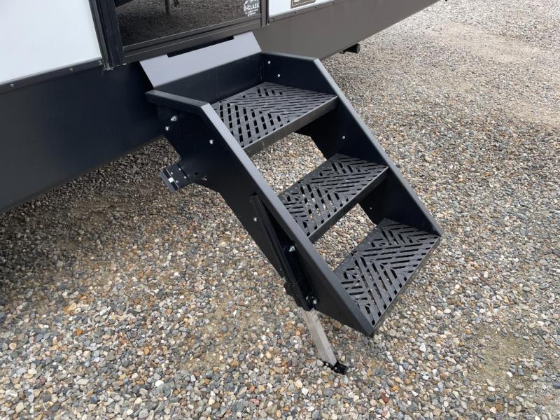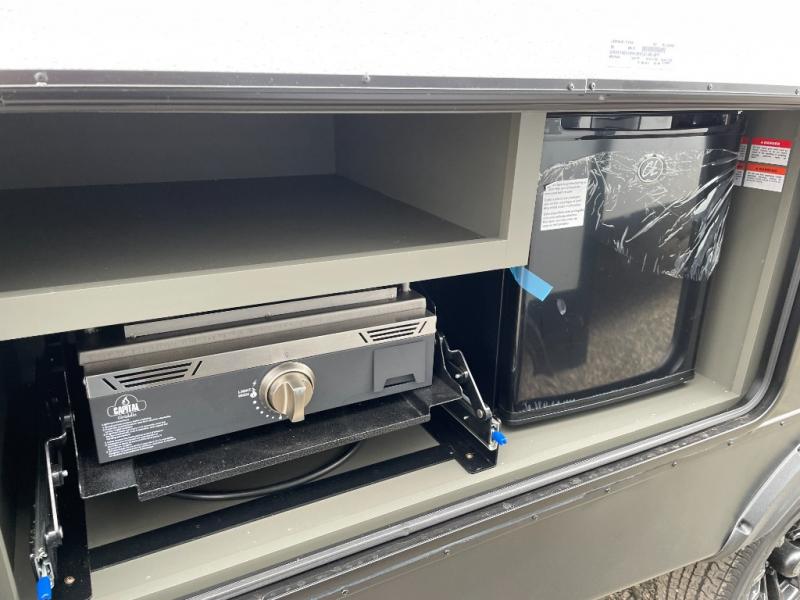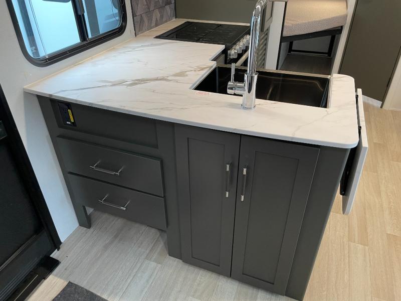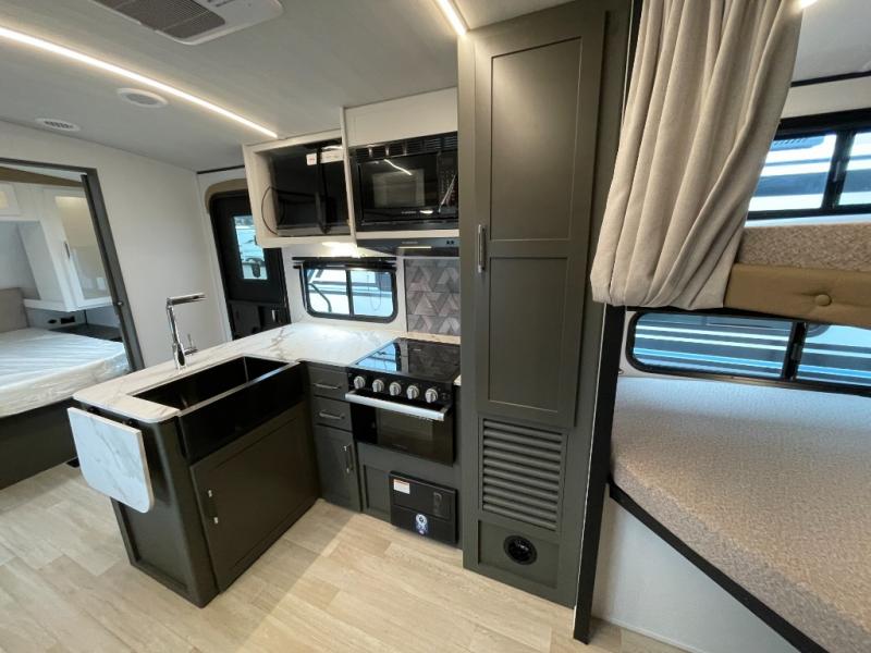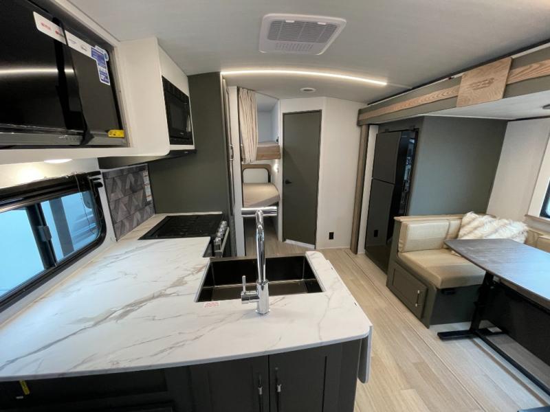 You can easily sleep eight in this travel trailer thanks to the 51" x 74" double-size bunks, the U-shaped Do-More dinette table, and the queen bed in the front bedroom. Whip up your best meals on the three burner cooktop, or use the microwave oven. You can dine around the dinette, or take your plate outdoors to sit under the 15' awning, plus there is an outdoor kitchen with a griddle, mini fridge and shelf!