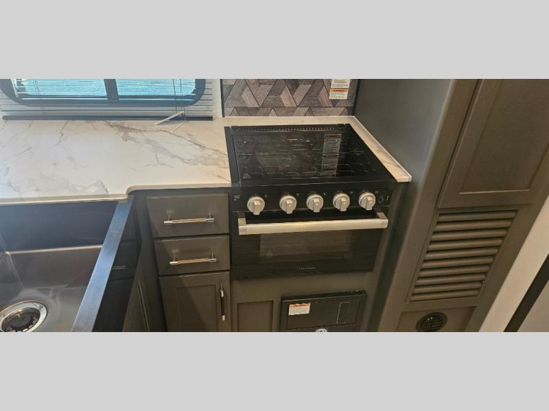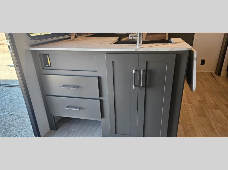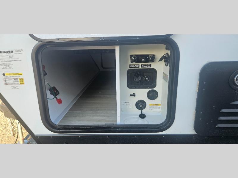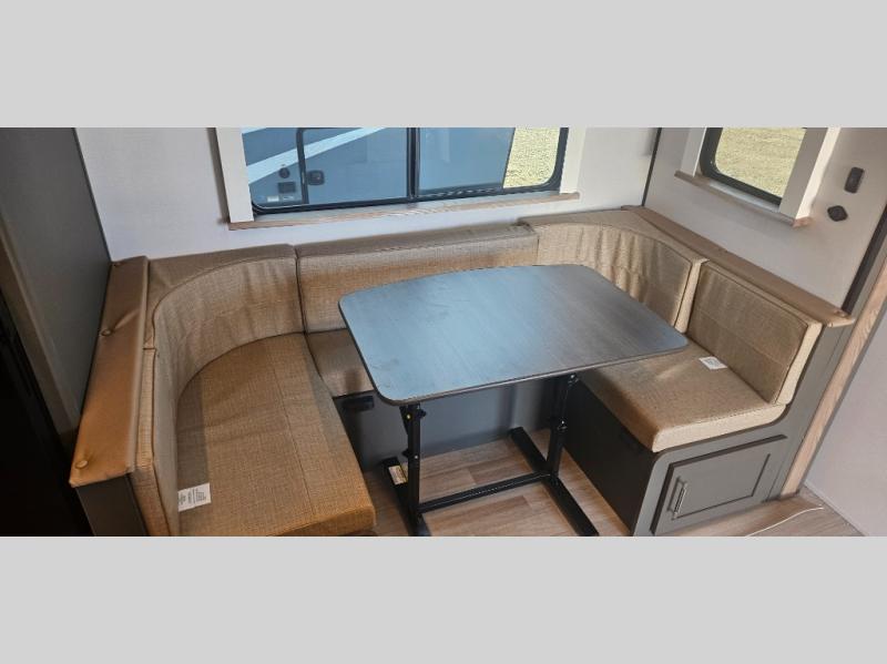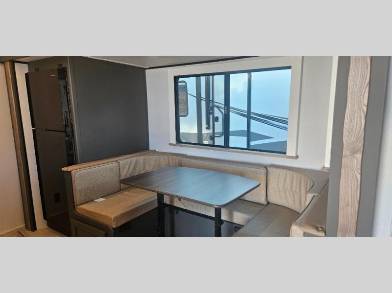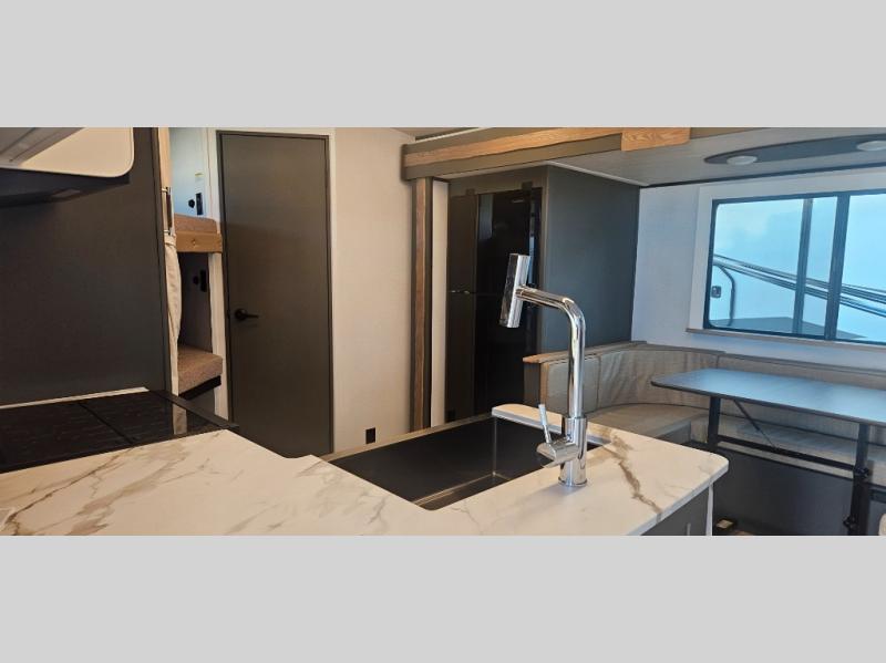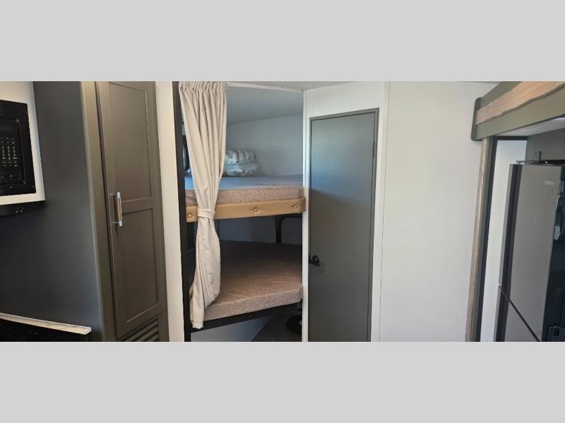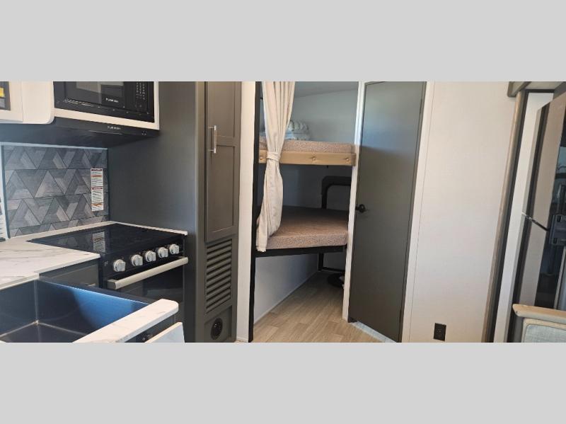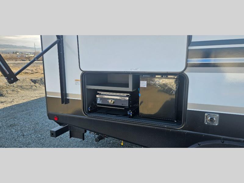 You can easily sleep eight in this travel trailer thanks to the 51" x 74" double-size bunks, the U-shaped Do-More dinette table, and the queen bed in the front bedroom. Whip up your best meals on the three burner cooktop, or use the microwave oven. You can dine around the dinette, or take your plate outdoors to sit under the 15' awning, plus there is an outdoor kitchen with a griddle, mini fridge and shelf!