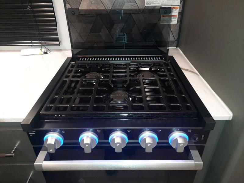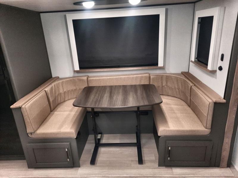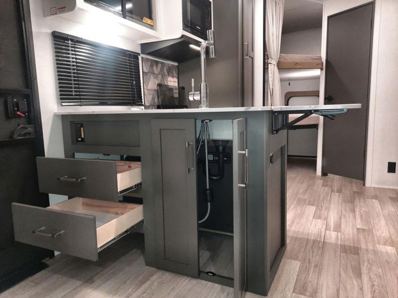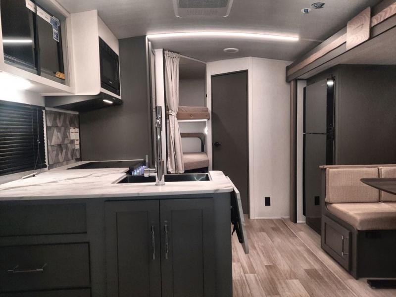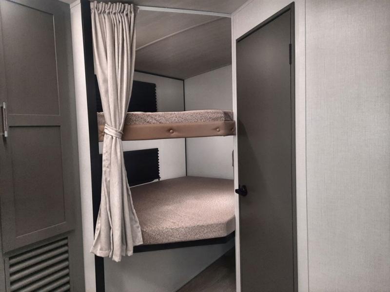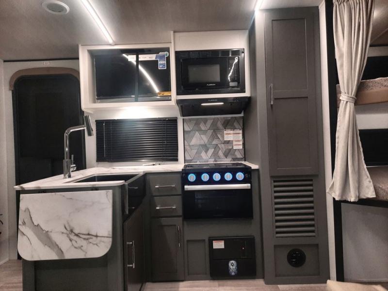 You can easily sleep eight in this travel trailer thanks to the 51" x 74" double-size bunks, the U-shaped Do-More dinette table, and the queen bed in the front bedroom. Whip up your best meals on the three burner cooktop, or use the microwave oven. You can dine around the dinette, or take your plate outdoors to sit under the 15' awning, plus there is an outdoor kitchen with a griddle, mini fridge and shelf!