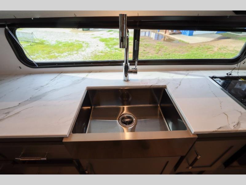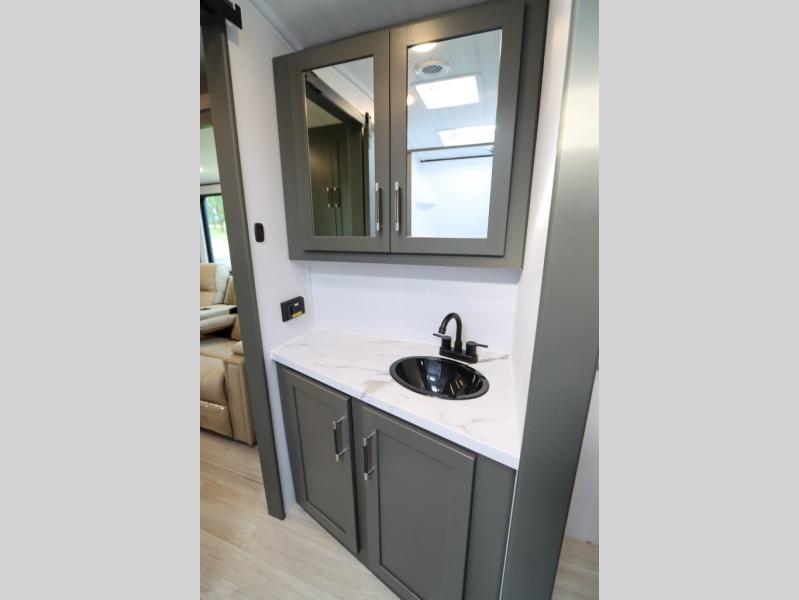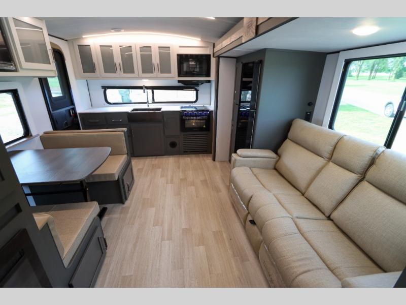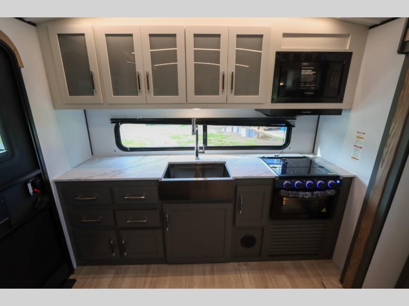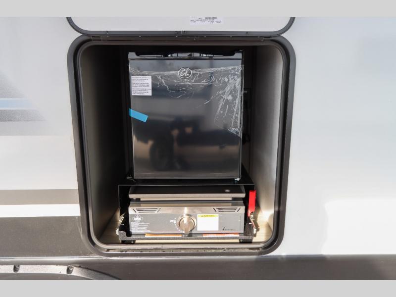 One step inside this dual entry travel trailer and you'll be sold! The rear kitchen features ample counter space to prep meals, and the booth dinette provides a place to dine together. There is also an outdoor kitchen with a griddle and mini fridge plus a 19' awning if you want to cook and eat outdoors. Two pantries and a 12V refrigerator will let you keep food stocked, and the tri-fold sofa slide provides sleeping space for guests. A walk-thru bath will create a front master bedroom you are sure to love, complete with a queen bed plus dual nightstands and dual wardrobes to keep everything tidy!