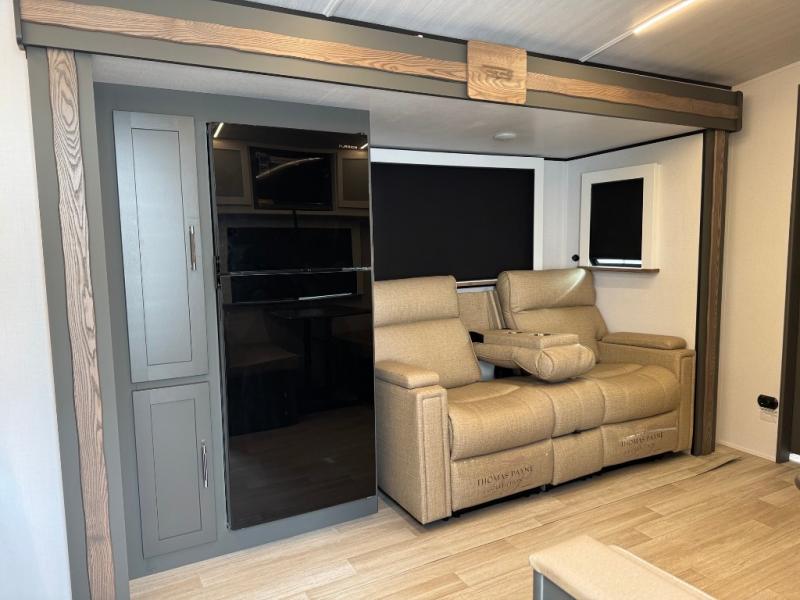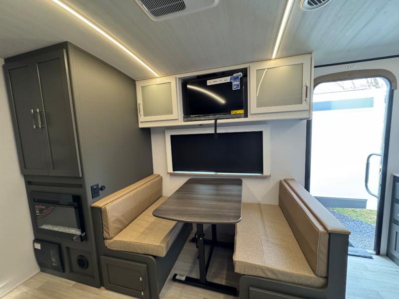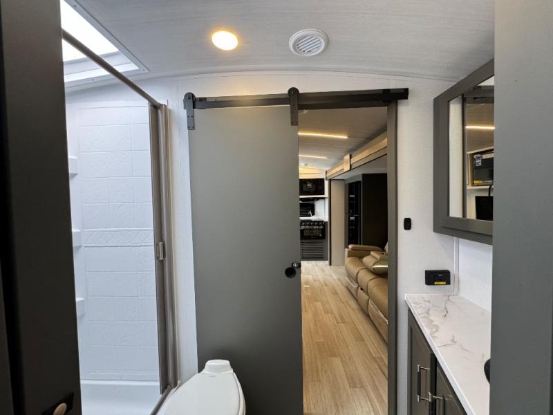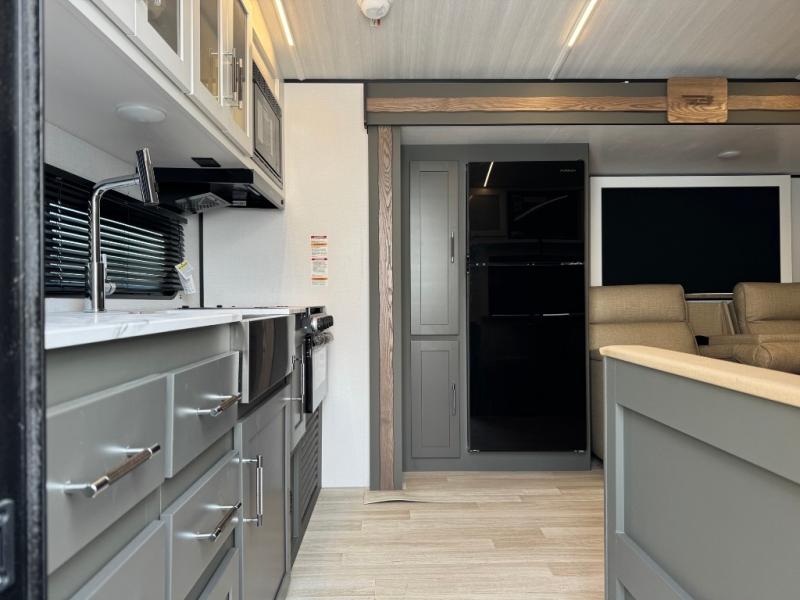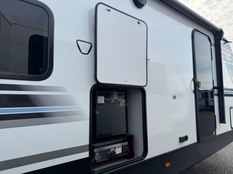 One step inside this dual entry travel trailer and you'll be sold! The rear kitchen features ample counter space to prep meals, and the do-more dinette table provides a place to dine together. There is also an outdoor kitchen with a griddle and mini fridge plus a 19' awning if you want to cook and eat outdoors. Two pantries and a 12V refrigerator will let you keep food stocked, and the tri-fold sofa slide provides sleeping space for guests. A walk-thru bath will create a front master bedroom you are sure to love, complete with a queen bed plus dual nightstands and dual wardrobes to keep everything tidy!