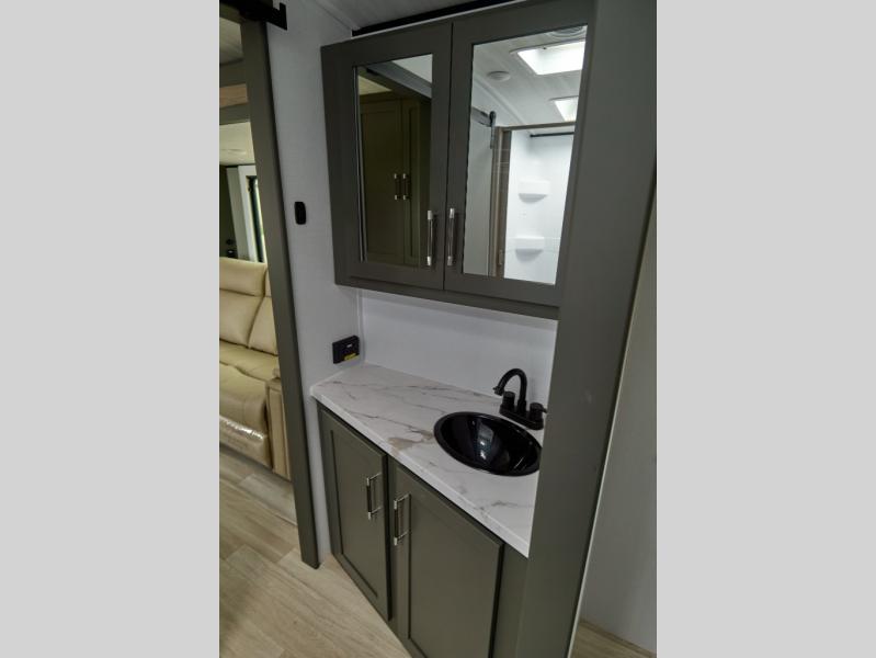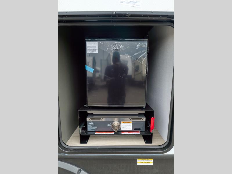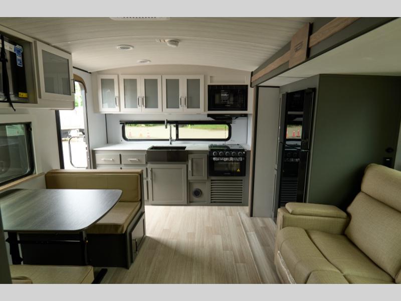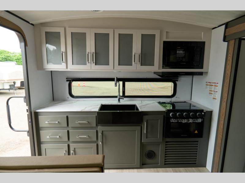 One step inside this dual entry travel trailer and you'll be sold! The rear kitchen features ample counter space to prep meals, and the do-more dinette table provides a place to dine together. There is also an outdoor kitchen with a griddle and mini fridge plus a 19' awning if you want to cook and eat outdoors. Two pantries and a 12V refrigerator will let you keep food stocked, and the tri-fold sofa slide provides sleeping space for guests. A walk-thru bath will create a front master bedroom you are sure to love, complete with a queen bed plus dual nightstands and dual wardrobes to keep everything tidy!