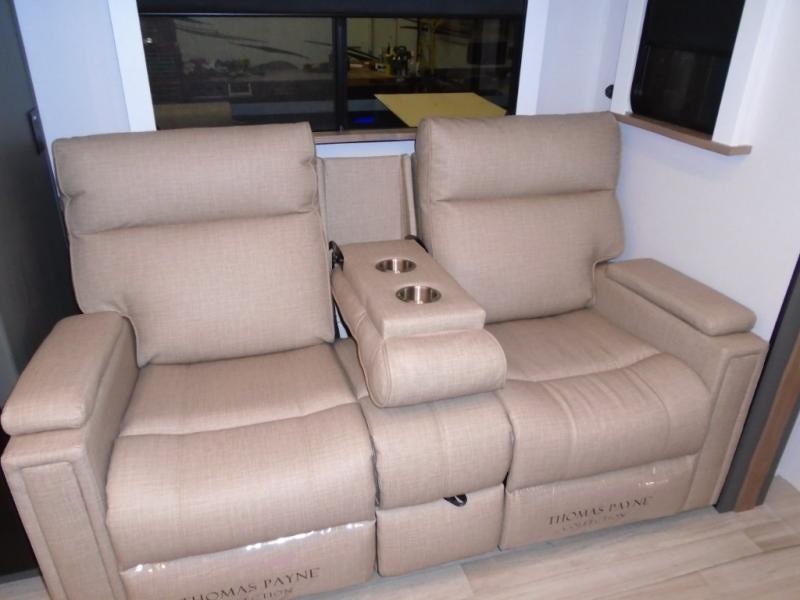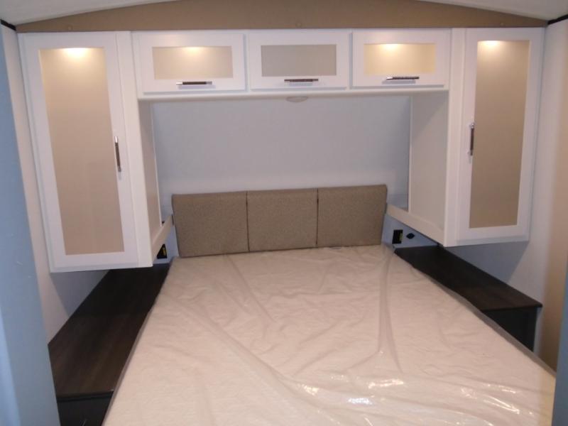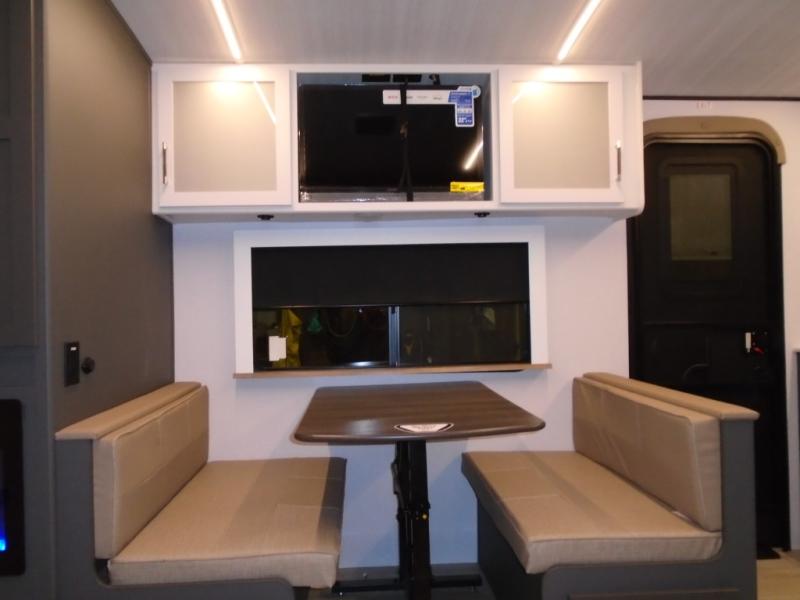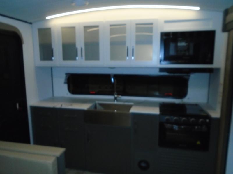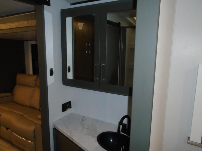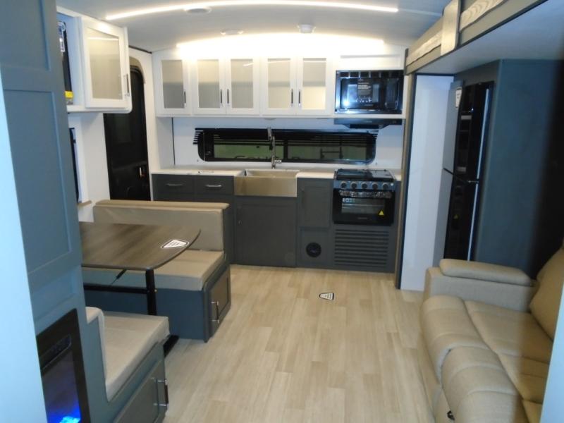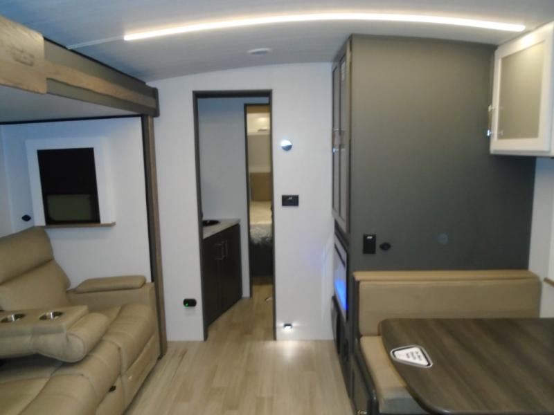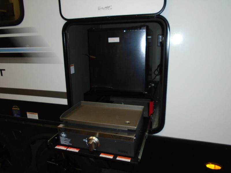 One step inside this dual entry travel trailer and you'll be sold! The rear kitchen features ample counter space to prep meals, and the do-more dinette table provides a place to dine together. There is also an outdoor kitchen with a griddle and mini fridge plus a 19' awning if you want to cook and eat outdoors. Two pantries and a 12V refrigerator will let you keep food stocked, and the tri-fold sofa slide provides sleeping space for guests. A walk-thru bath will create a front master bedroom you are sure to love, complete with a queen bed plus dual nightstands and dual wardrobes to keep everything tidy!