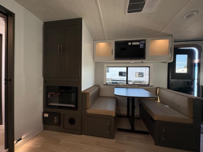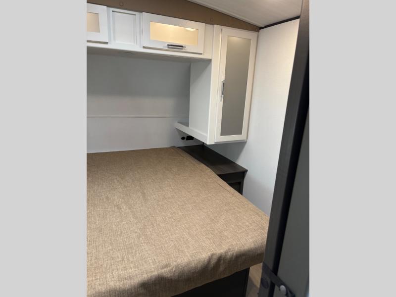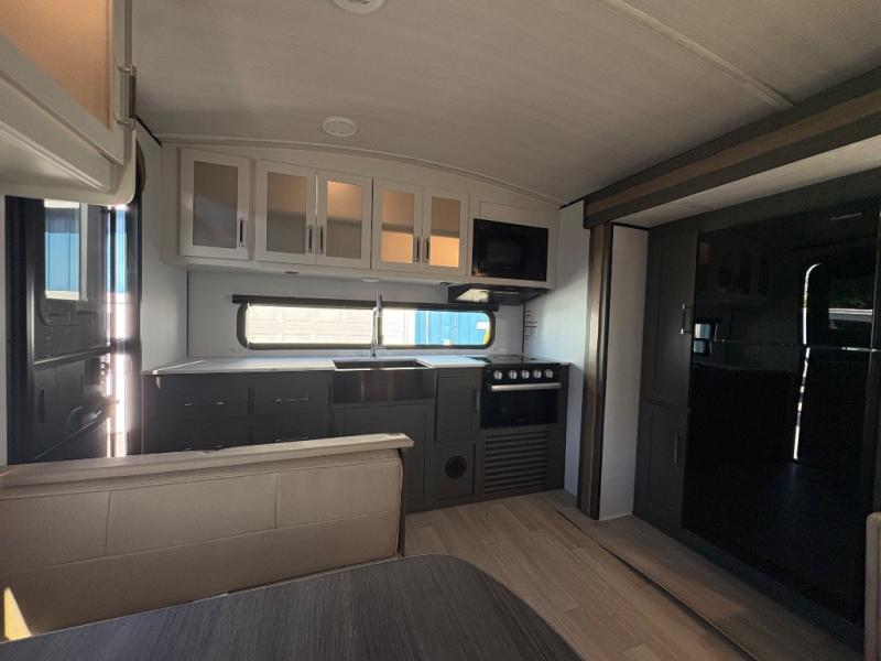 One step inside this dual entry travel trailer and you'll be sold! The rear kitchen features ample counter space to prep meals, and the do-more dinette table provides a place to dine together. There is also an outdoor kitchen with a griddle and mini fridge plus a 19' awning if you want to cook and eat outdoors. Two pantries and a 12V refrigerator will let you keep food stocked, and the tri-fold sofa slide provides sleeping space for guests. A walk-thru bath will create a front master bedroom you are sure to love, complete with a queen bed plus dual nightstands and dual wardrobes to keep everything tidy!