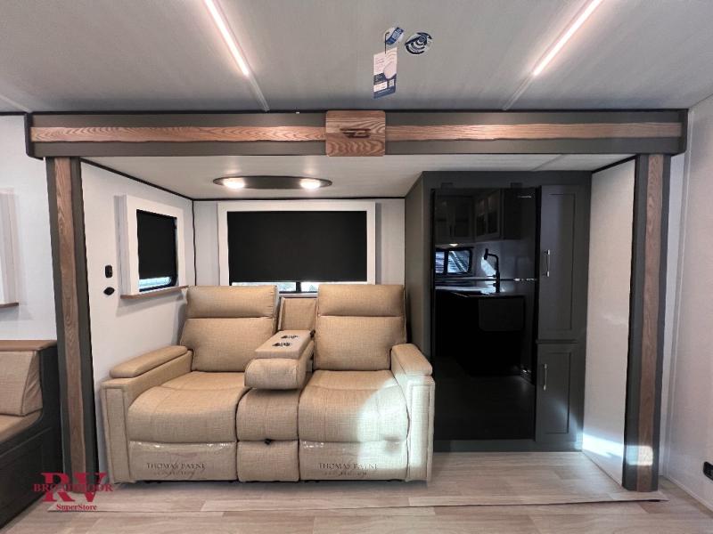 It won't be hard to find comfort in this dual entry travel trailer for six! You can enter in through the front private bedroom or the rear living area, and there is a large slide out for added space to move about. Spend your evenings on the tri-fold sofa across from the TV, around the U-shaped do-more dinette table, or outside under the 19' awning. You might even like to add the optional luxury style cinema theater seating in place of the sofa for more comfort! The walk-through bath will provide easy access for everyone, and the front master bedroom is sure to feel just like home with its queen bed and dual wardrobes!