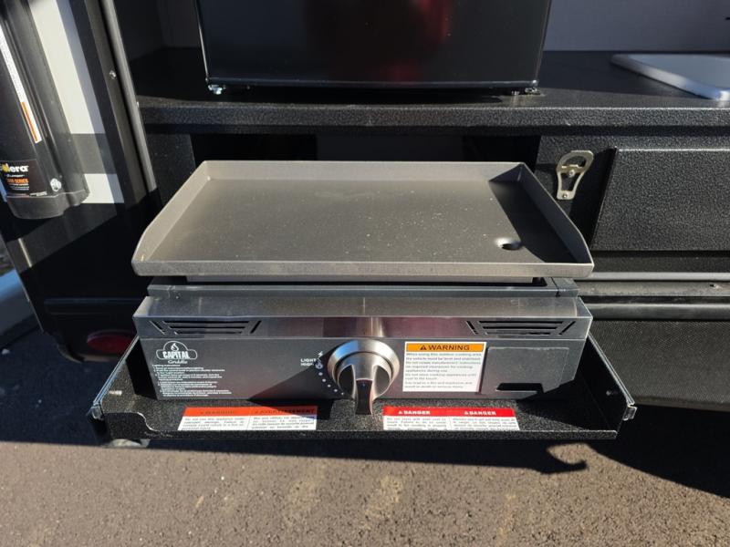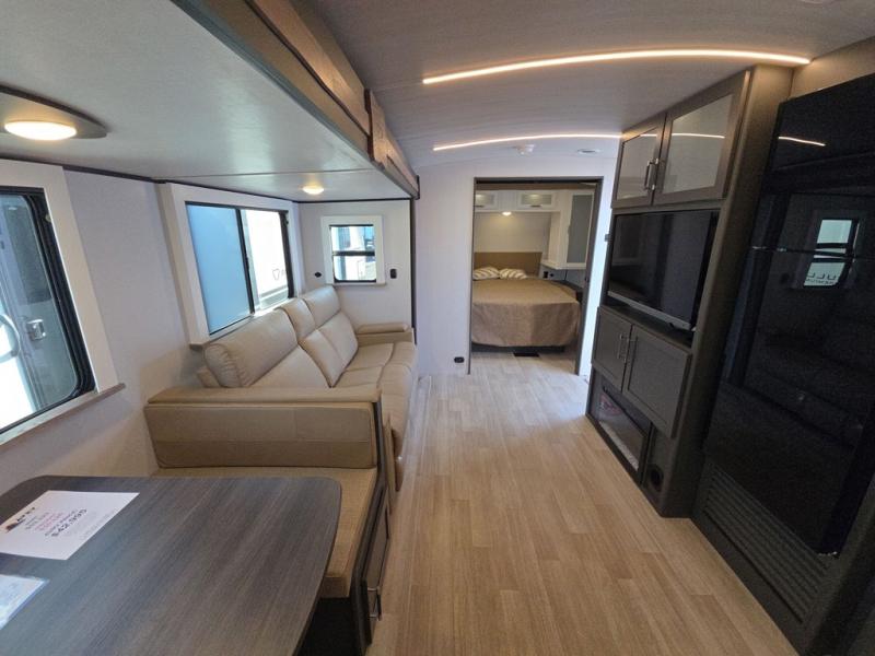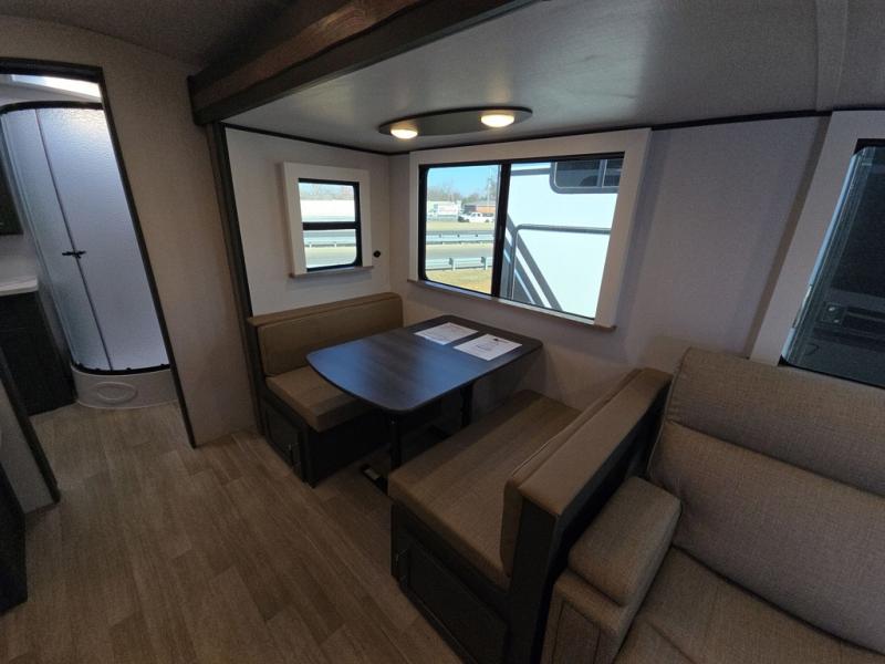 Enjoy camping with your family in this travel trailer that is perfect for a couple or a family of four. You will appreciate the private bedroom with wide entry including space saving sliding doors. The bedroom features a queen bed and wardrobes on either side to keep your clothes tidy. A large slide features a Do-More dinette and tri-fold sofa that is great for relaxing during the day, and can easily be transformed for more sleeping space at night. Or, you could opt. for the free standing dinette with chairs if you do not prefer booth style seating and/or do not need the added option of more sleeping space. A large rear bath features a radius shower and linen storage, plus a vanity with sink and toilet. And, the chef can choose to cook inside or outside with the outdoor kitchen that includes a griddle, small refrigerator as well as a sink all tucked under the patio awning.