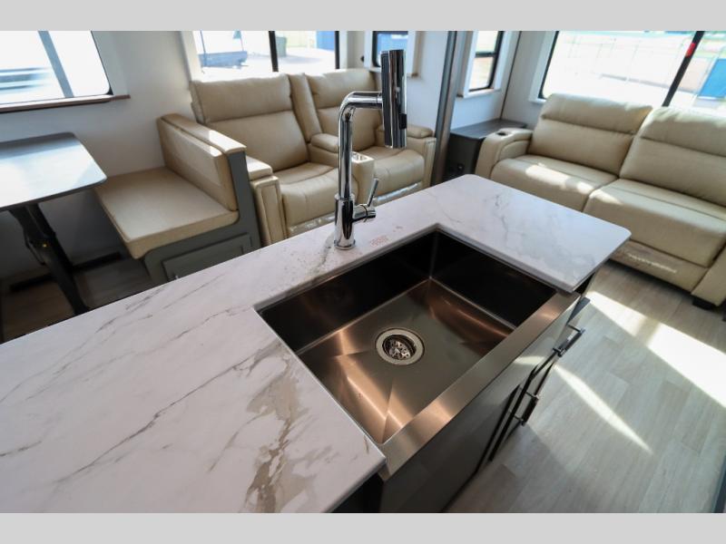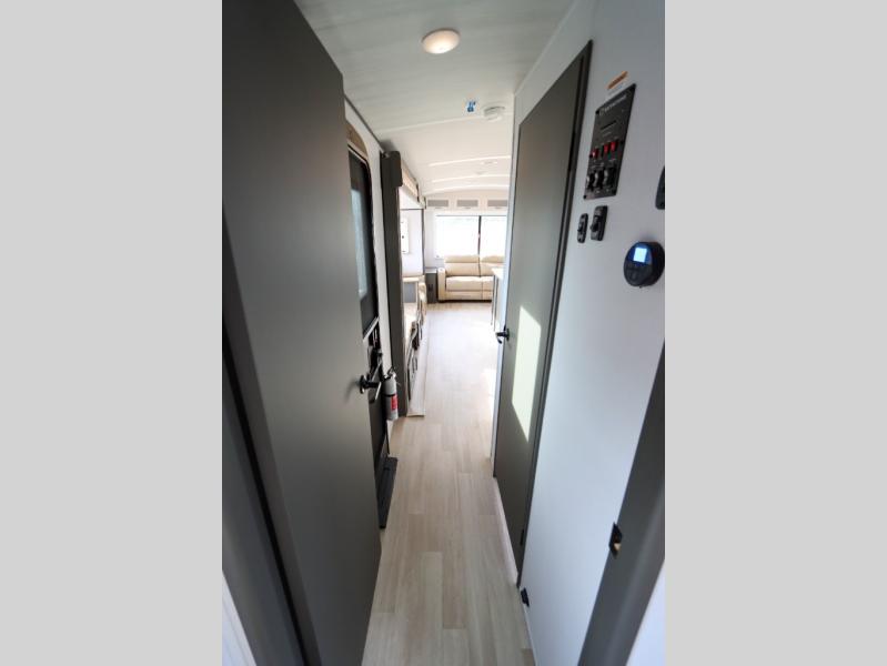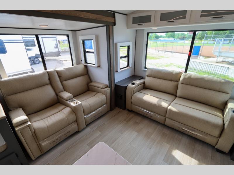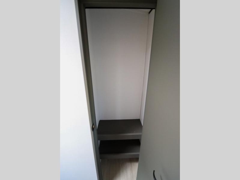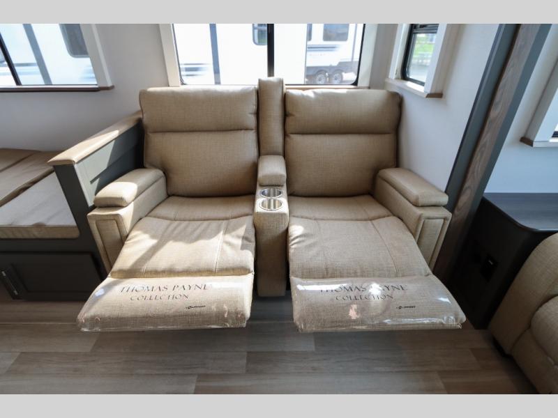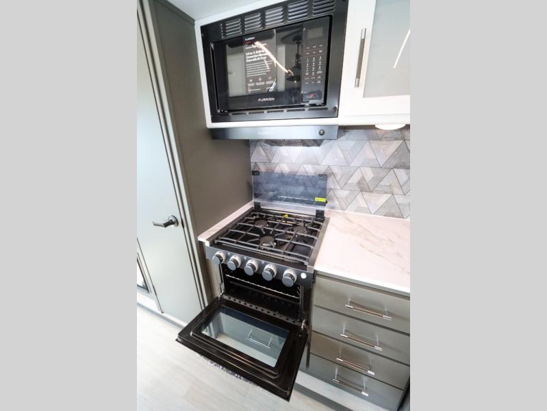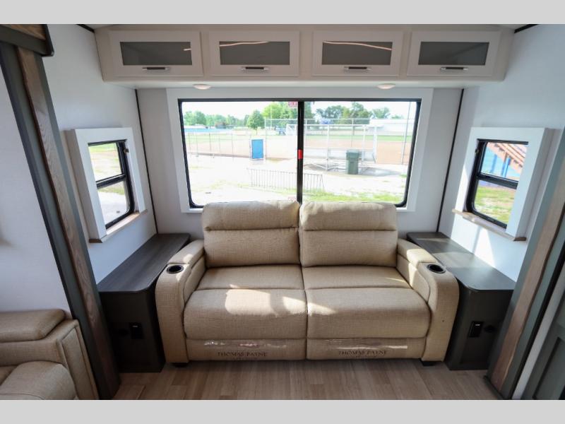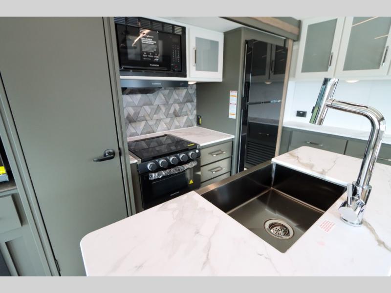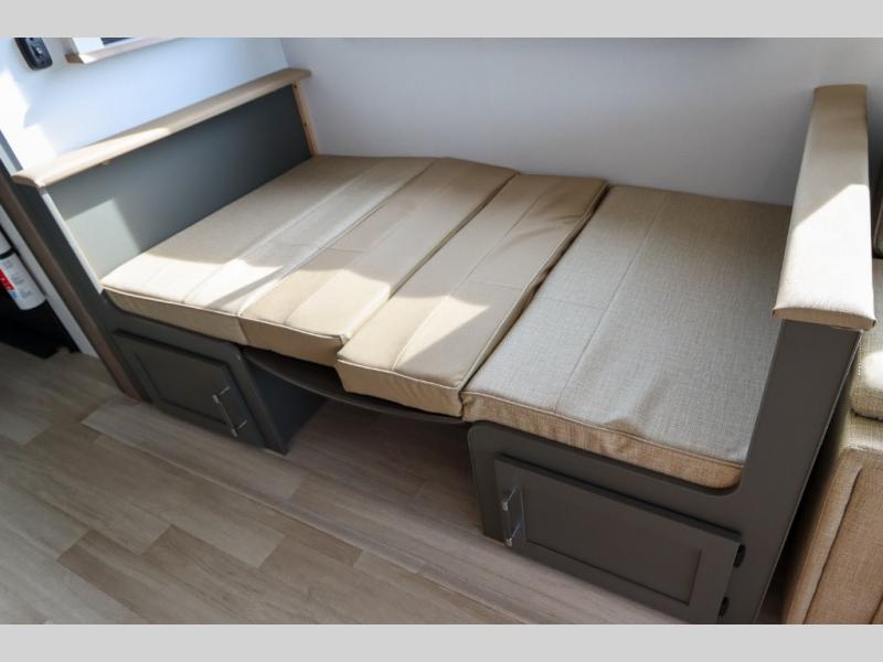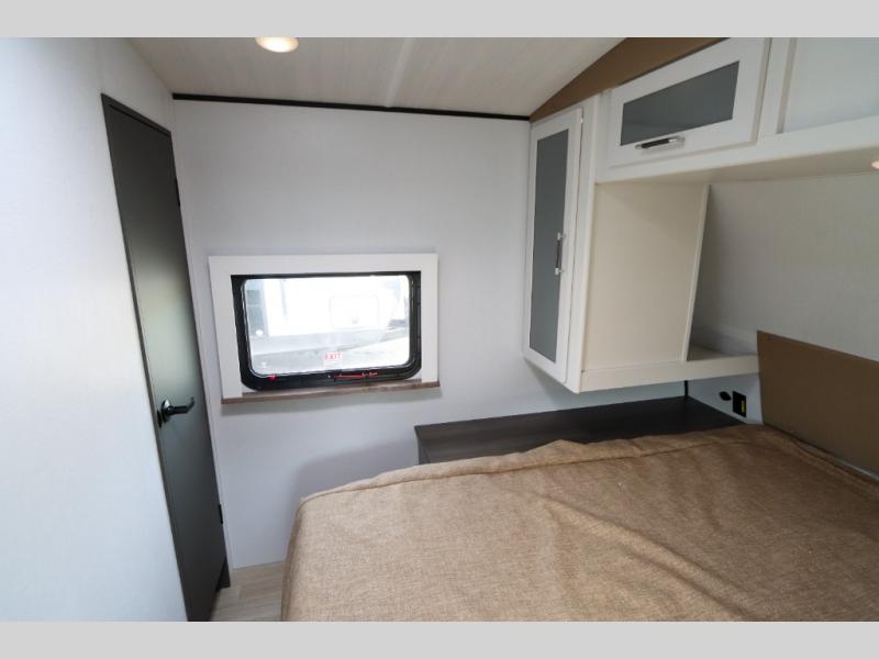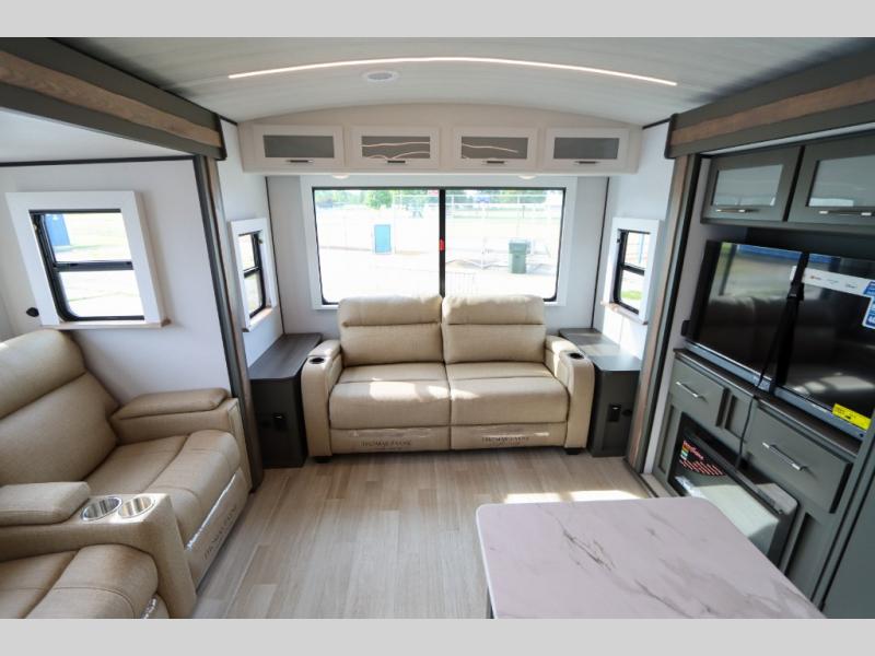 Weekend trips to the campground are made easy in this travel trailer! There are dual opposing slides in the combined kitchen and living area to provide you with ample space to stretch out. A kitchen island will come in handy when prepping meals, plus you'll have all the appliances needed to cook them. You will find comfortable seating on the rear tri-fold sofa sleeper, Do-More dinette table, and theater seats across from the entertainment center and fireplace. When you're ready to call it a night, the front private bedroom with a queen bed will be calling your name, and the full bath onboard will let you freshen up each day!