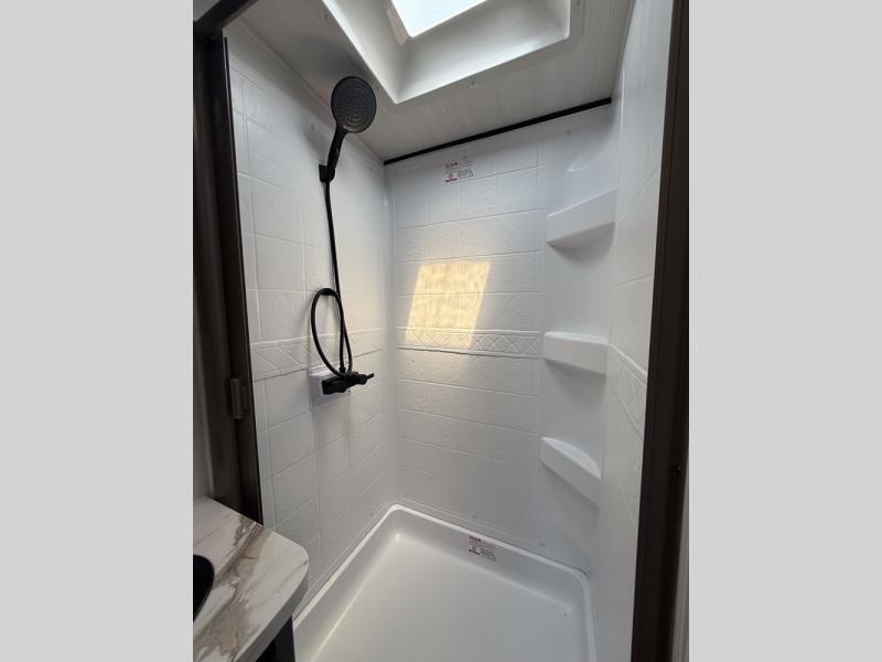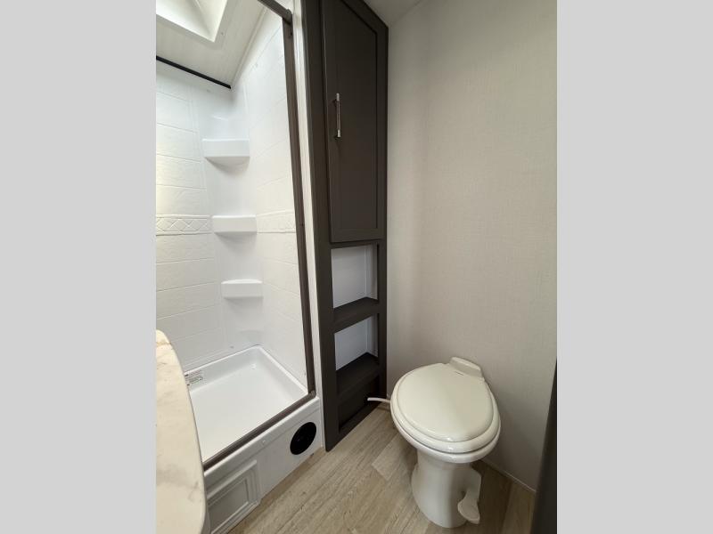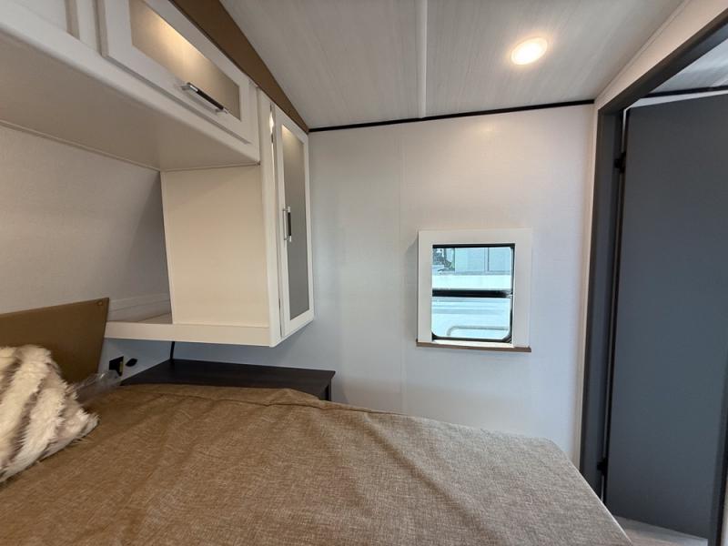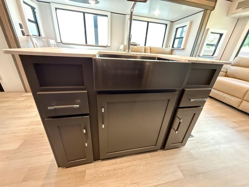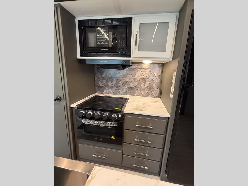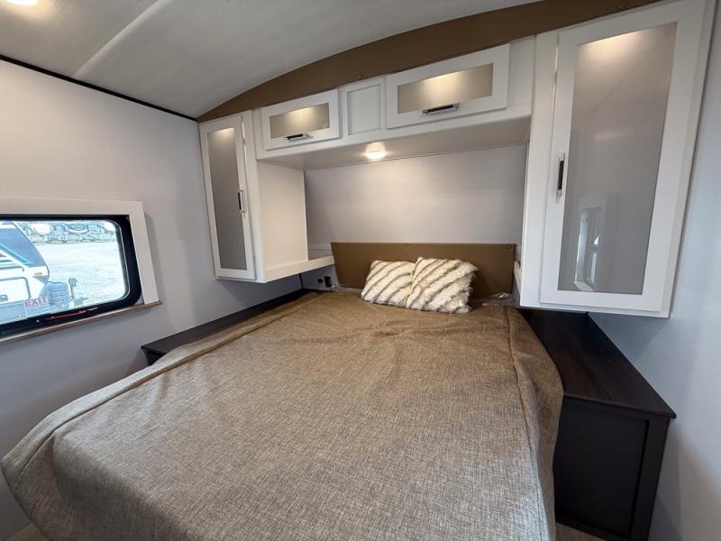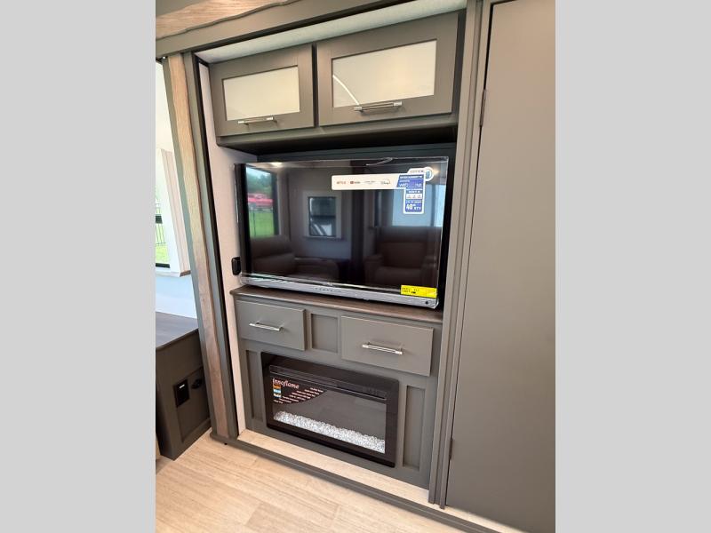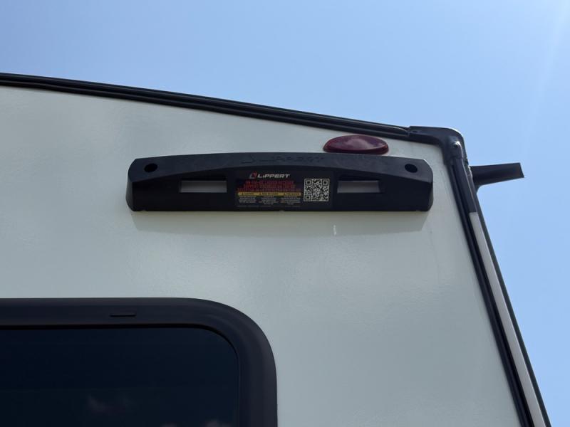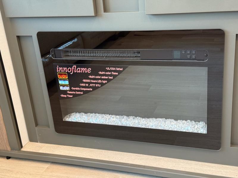Weekend trips to the campground are made easy in this travel trailer! There are dual opposing slides in the combined kitchen and living area to provide you with ample space to stretch out. A kitchen island will come in handy when prepping meals, plus you'll have all the appliances needed to cook them. You will find comfortable seating on the rear tri-fold sofa sleeper, Do-More dinette table, and theater seats across from the entertainment center and fireplace. When you're ready to call it a night, the front private bedroom with a queen bed will be calling your name, and the full bath onboard will let you freshen up each day!