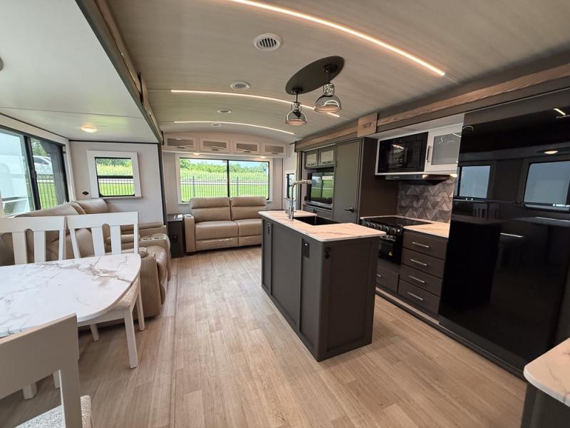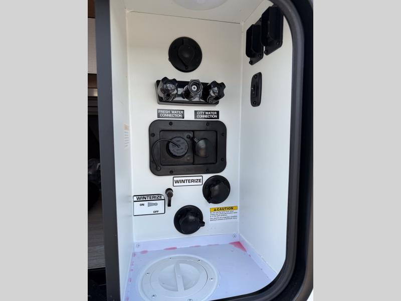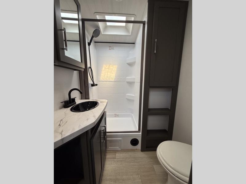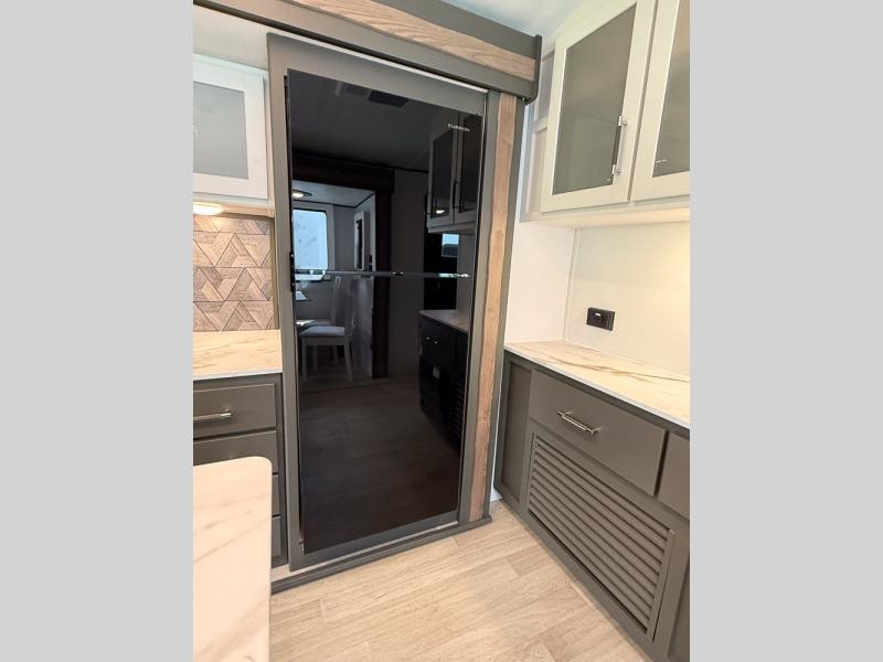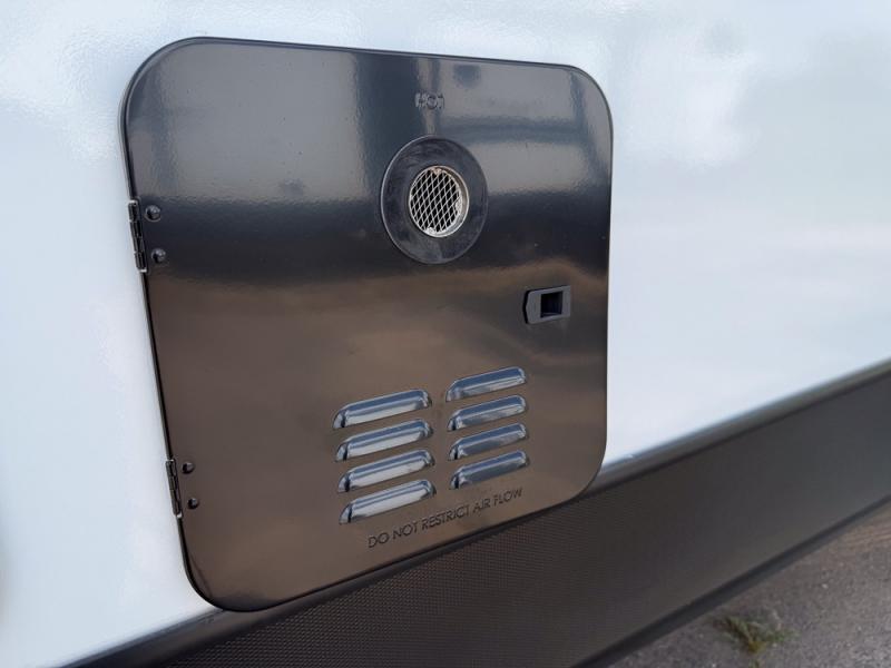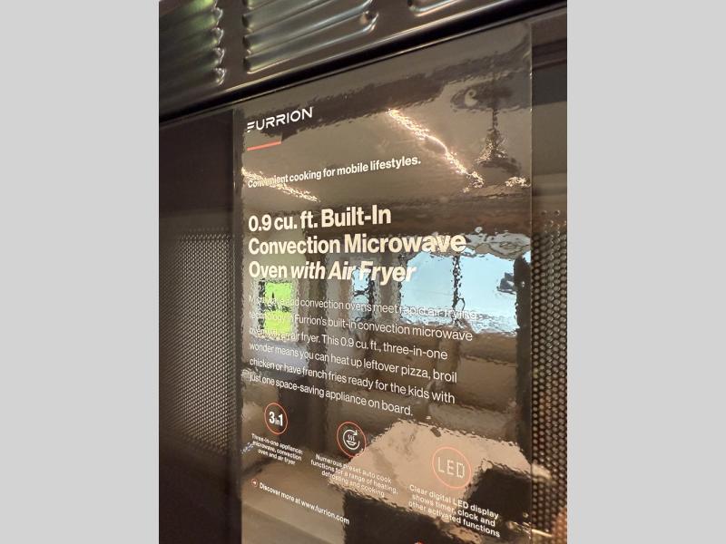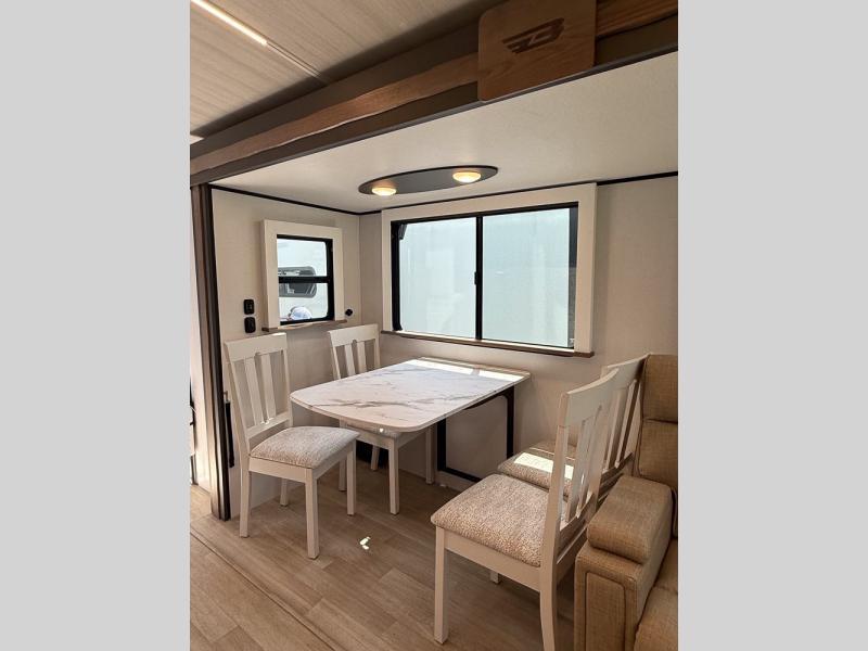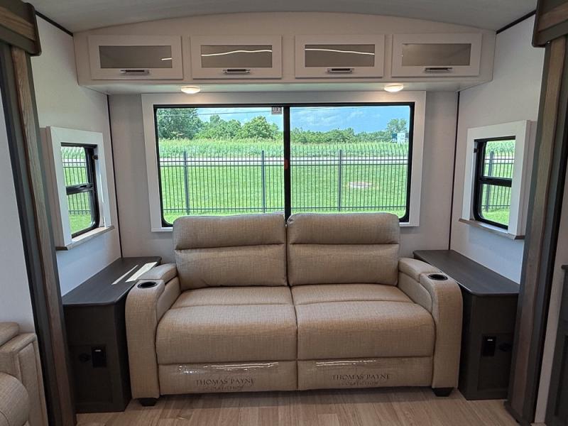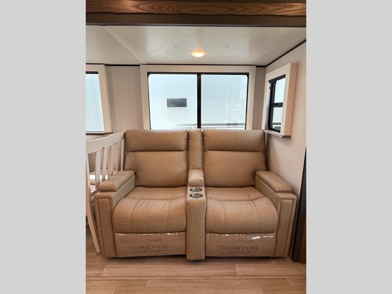 Weekend trips to the campground are made easy in this travel trailer! There are dual opposing slides in the combined kitchen and living area to provide you with ample space to stretch out. A kitchen island will come in handy when prepping meals, plus you'll have all the appliances needed to cook them. You will find comfortable seating on the rear tri-fold sofa sleeper, Do-More dinette table, and theater seats across from the entertainment center and fireplace. When you're ready to call it a night, the front private bedroom with a queen bed will be calling your name, and the full bath onboard will let you freshen up each day!