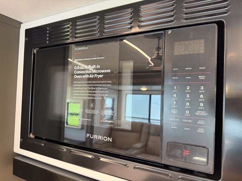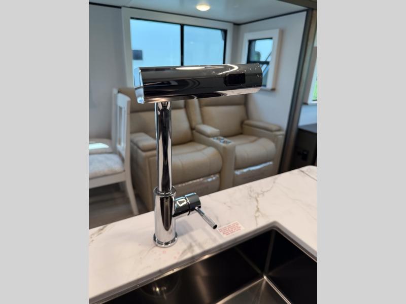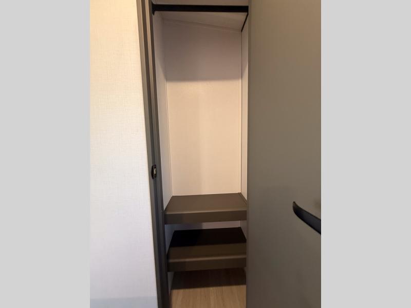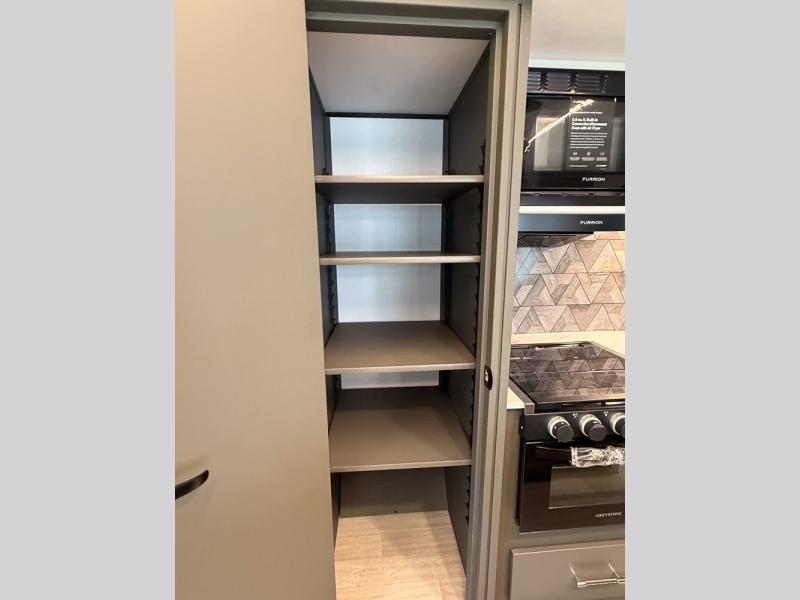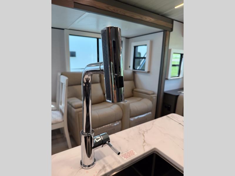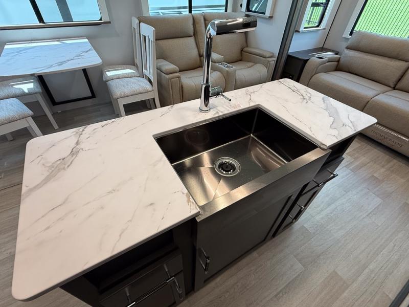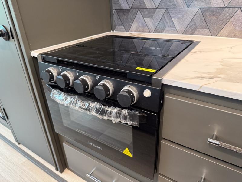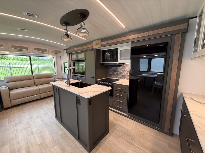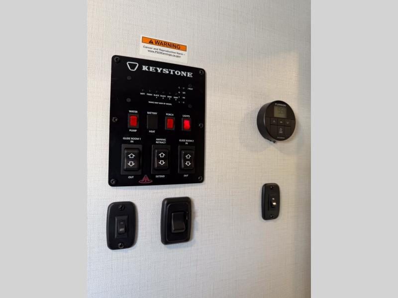 Weekend trips to the campground are made easy in this travel trailer! There are dual opposing slides in the combined kitchen and living area to provide you with ample space to stretch out. A kitchen island will come in handy when prepping meals, plus you'll have all the appliances needed to cook them. You will find comfortable seating on the rear tri-fold sofa sleeper, Do-More dinette table, and theater seats across from the entertainment center and fireplace. When you're ready to call it a night, the front private bedroom with a queen bed will be calling your name, and the full bath onboard will let you freshen up each day!