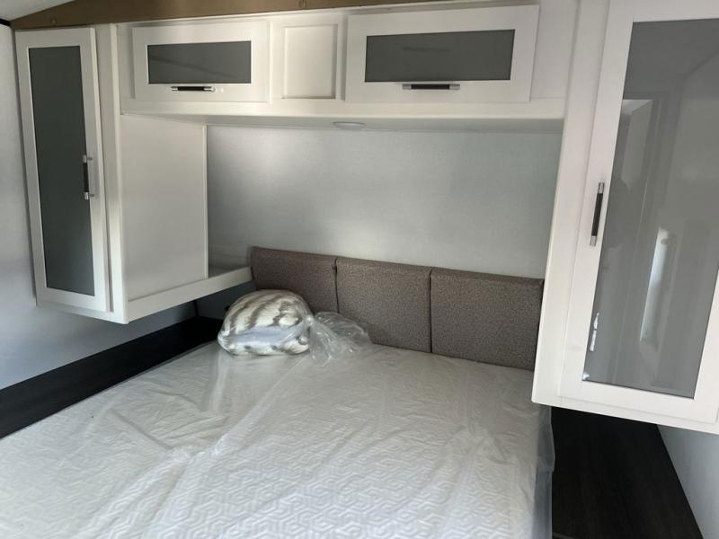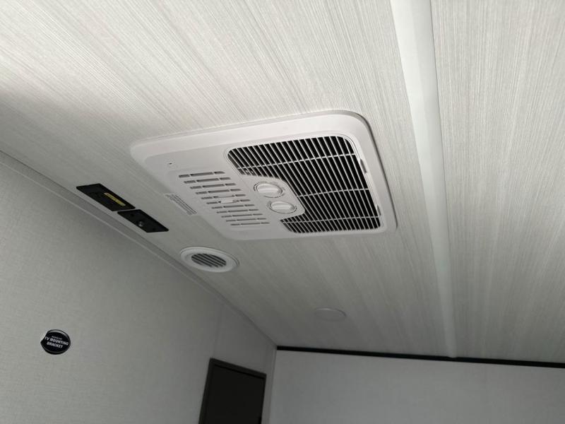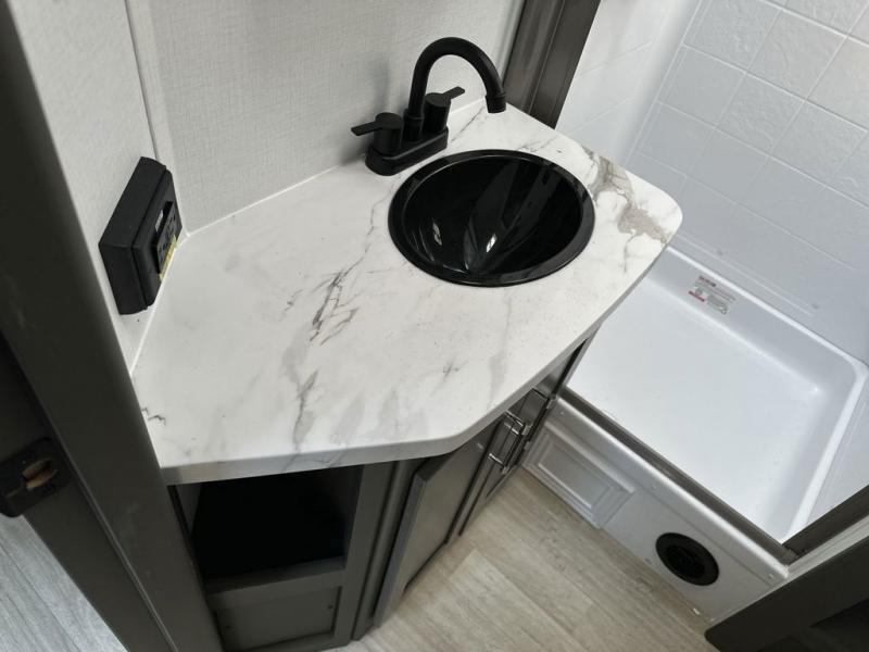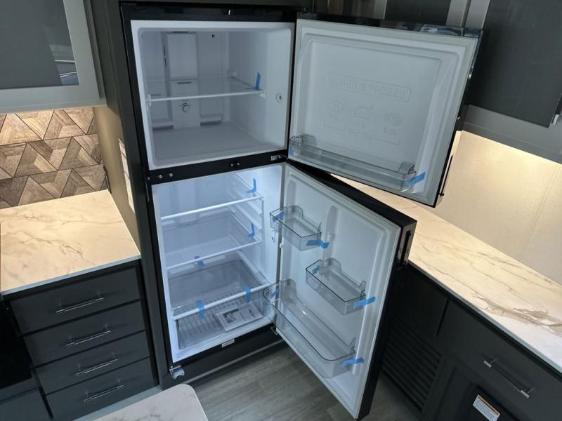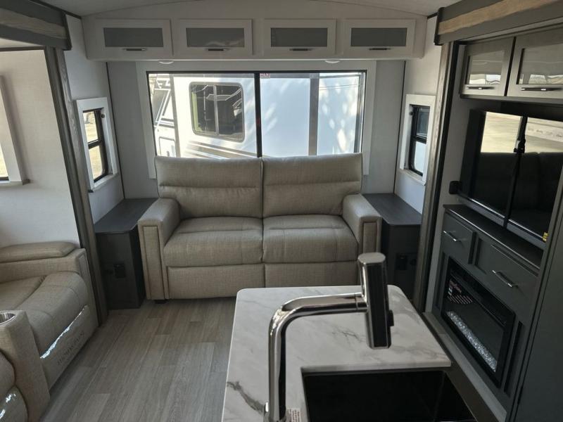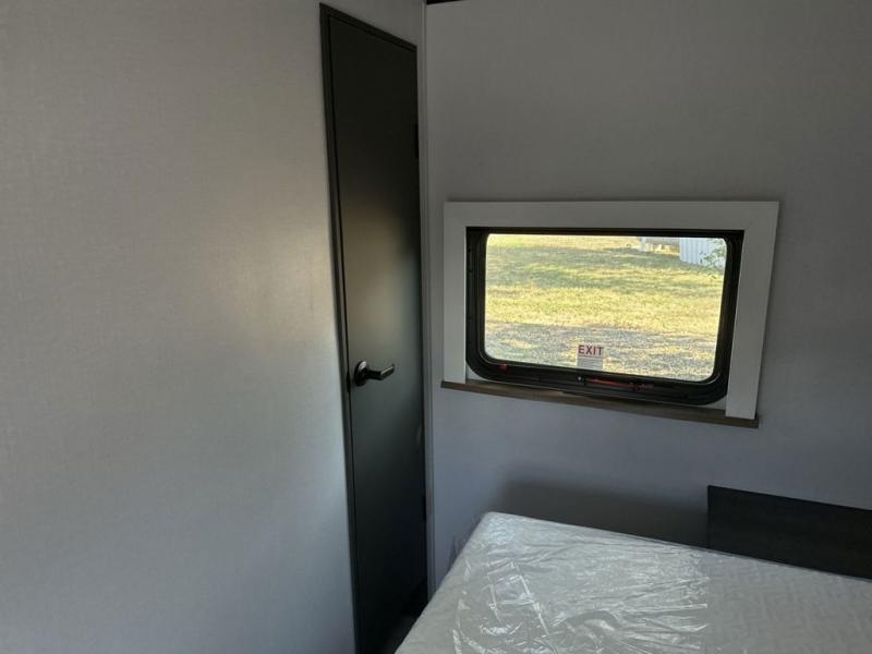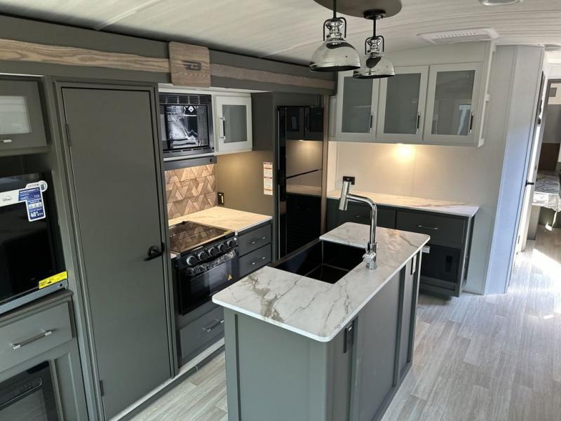 Weekend trips to the campground are made easy in this travel trailer! There are dual opposing slides in the combined kitchen and living area to provide you with ample space to stretch out. A kitchen island will come in handy when prepping meals, plus you'll have all the appliances needed to cook them. You will find comfortable seating on the rear tri-fold sofa sleeper, Do-More dinette table, and theater seats across from the entertainment center and fireplace. When you're ready to call it a night, the front private bedroom with a queen bed will be calling your name, and the full bath onboard will let you freshen up each day!