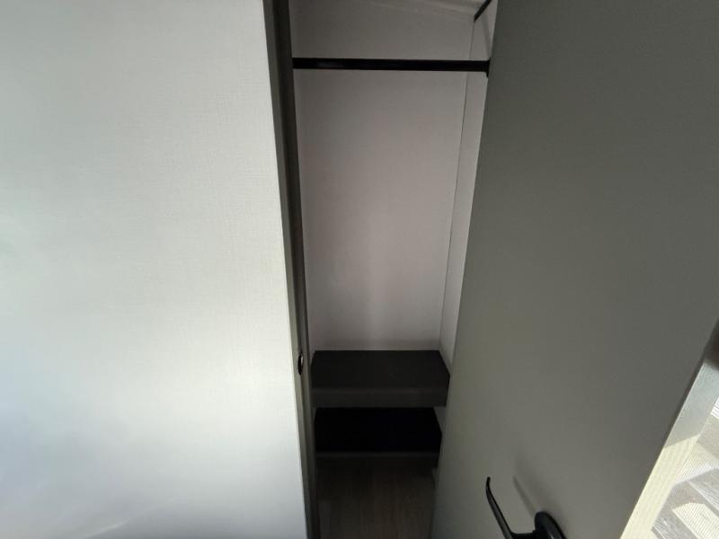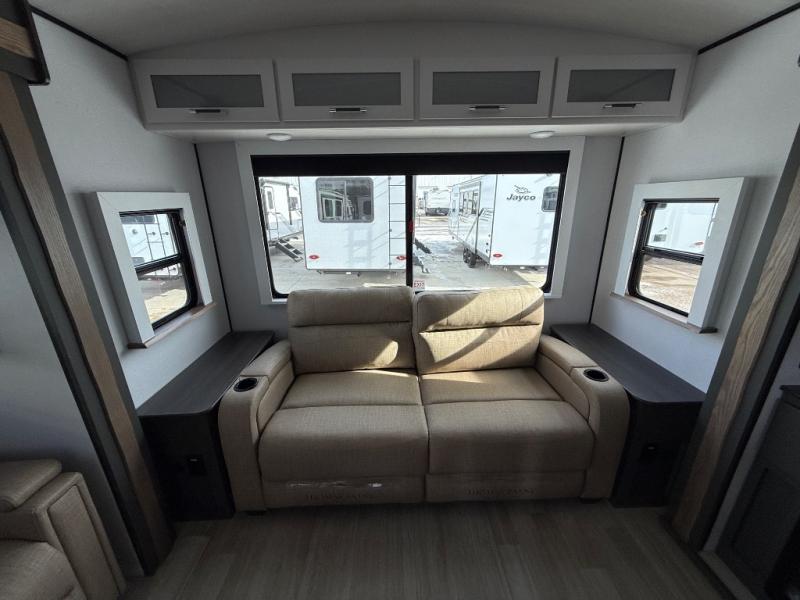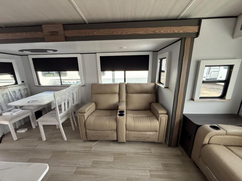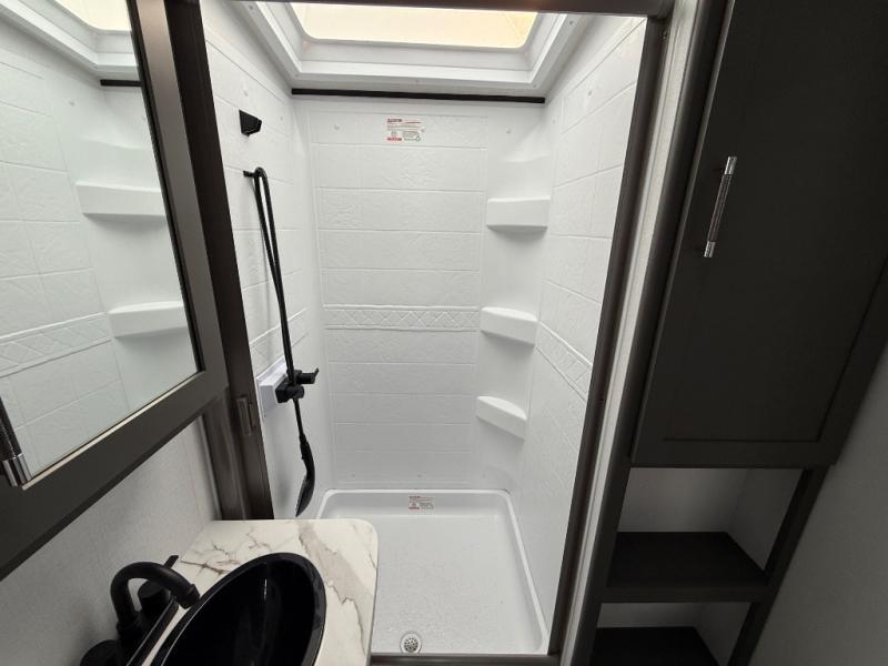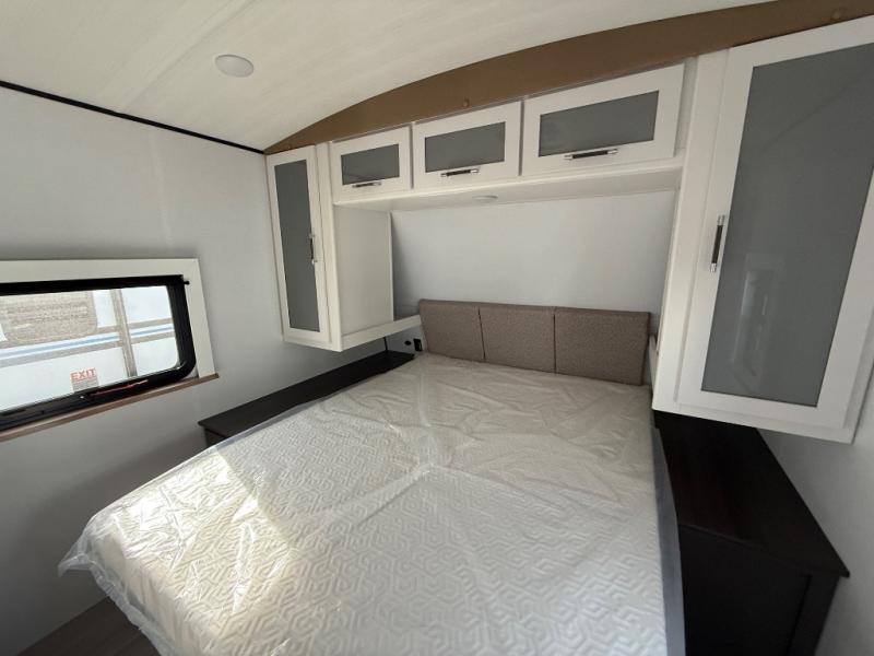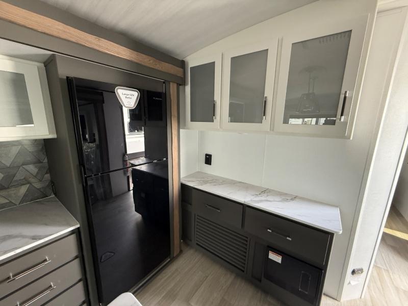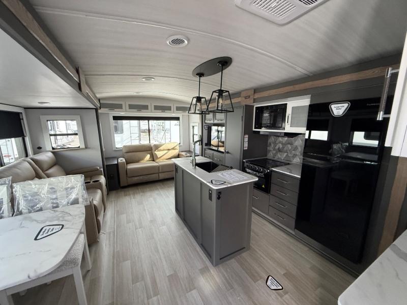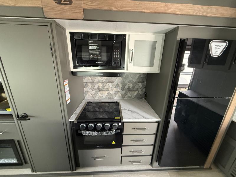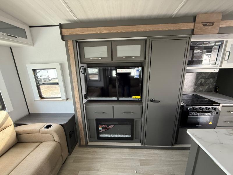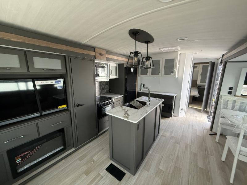 Weekend trips to the campground are made easy in this travel trailer! There are dual opposing slides in the combined kitchen and living area to provide you with ample space to stretch out. A kitchen island will come in handy when prepping meals, plus you'll have all the appliances needed to cook them. You will find comfortable seating on the rear tri-fold sofa sleeper, Do-More dinette table, and theater seats across from the entertainment center and fireplace. When you're ready to call it a night, the front private bedroom with a queen bed will be calling your name, and the full bath onboard will let you freshen up each day!