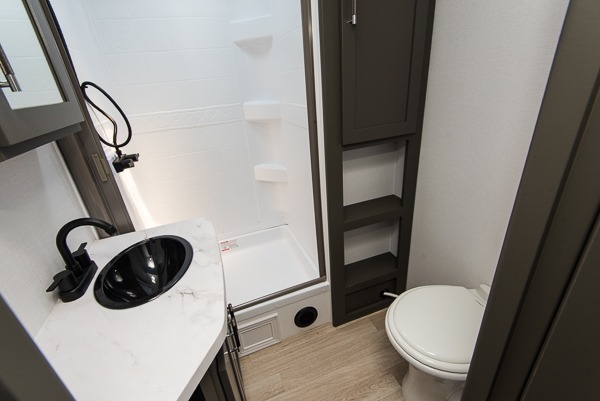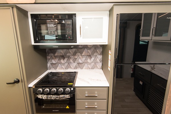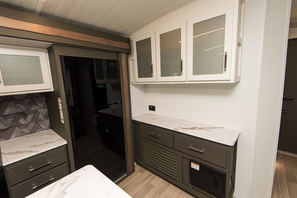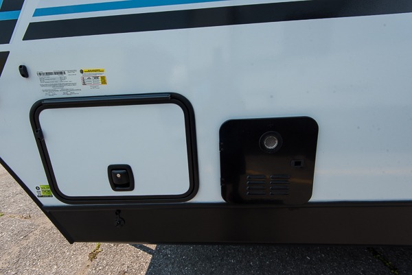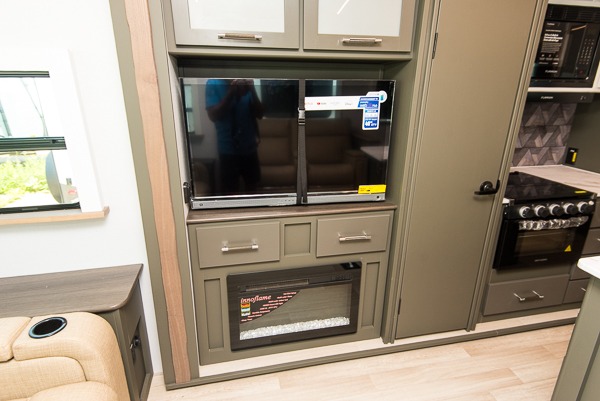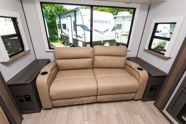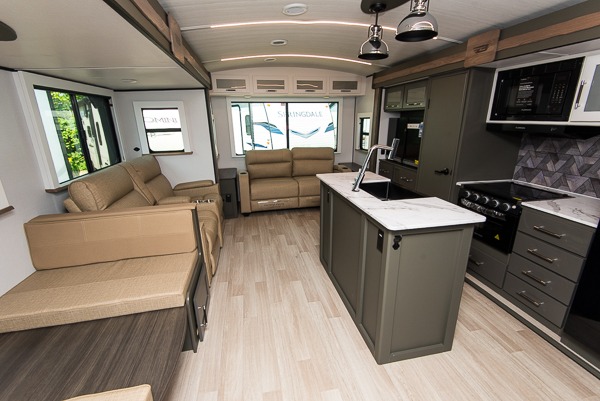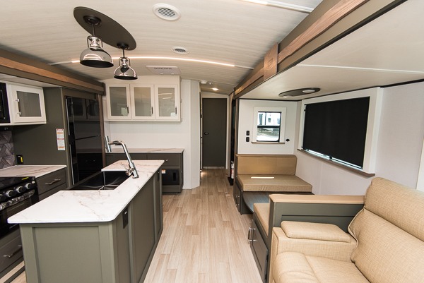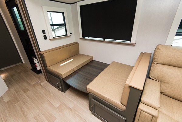 Weekend trips to the campground are made easy in this travel trailer! There are dual opposing slides in the combined kitchen and living area to provide you with ample space to stretch out. A kitchen island will come in handy when prepping meals, plus you'll have all the appliances needed to cook them. You will find comfortable seating on the rear tri-fold sofa sleeper, Do-More dinette table, and theater seats across from the entertainment center and fireplace. When you're ready to call it a night, the front private bedroom with a queen bed will be calling your name, and the full bath onboard will let you freshen up each day!