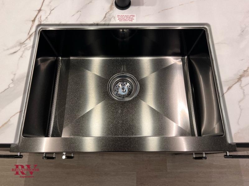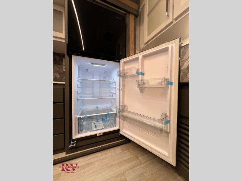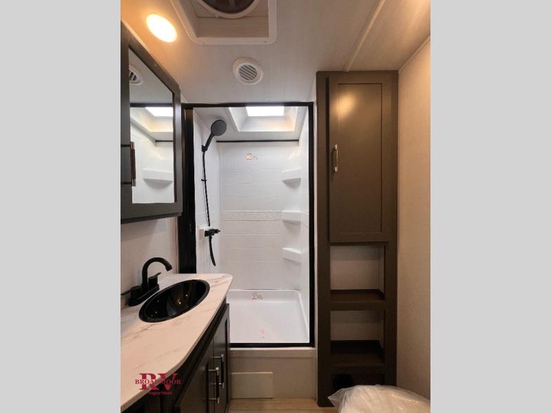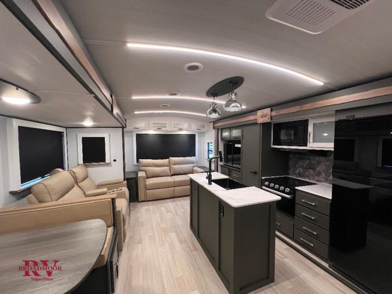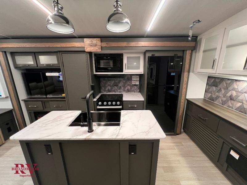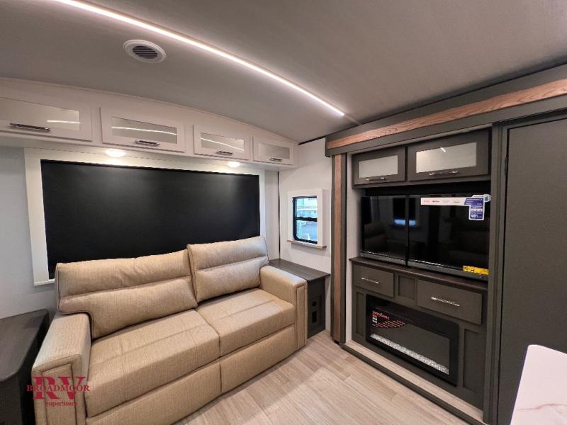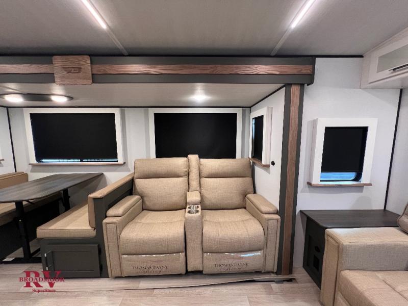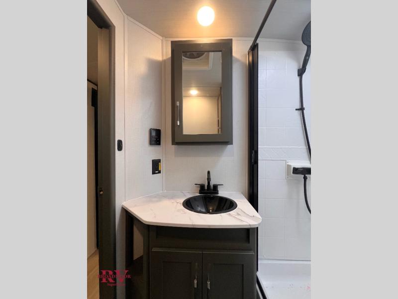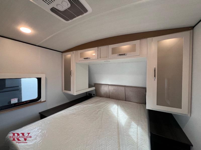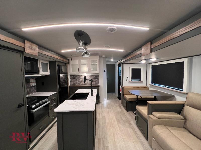 Weekend trips to the campground are made easy in this travel trailer! There are dual opposing slides in the combined kitchen and living area to provide you with ample space to stretch out. A kitchen island will come in handy when prepping meals, plus you'll have all the appliances needed to cook them. You will find comfortable seating on the rear tri-fold sofa sleeper, Do-More dinette table, and theater seats across from the entertainment center and fireplace. When you're ready to call it a night, the front private bedroom with a queen bed will be calling your name, and the full bath onboard will let you freshen up each day!