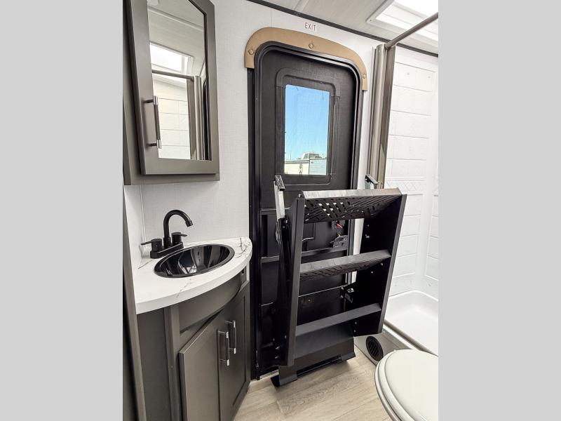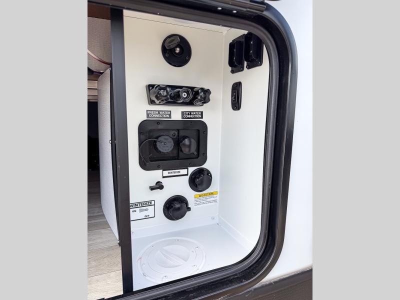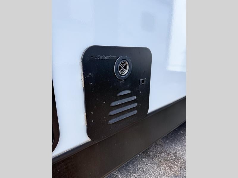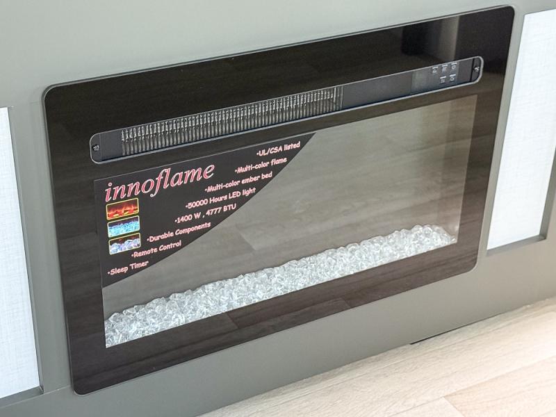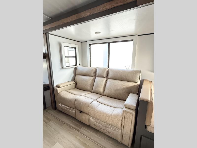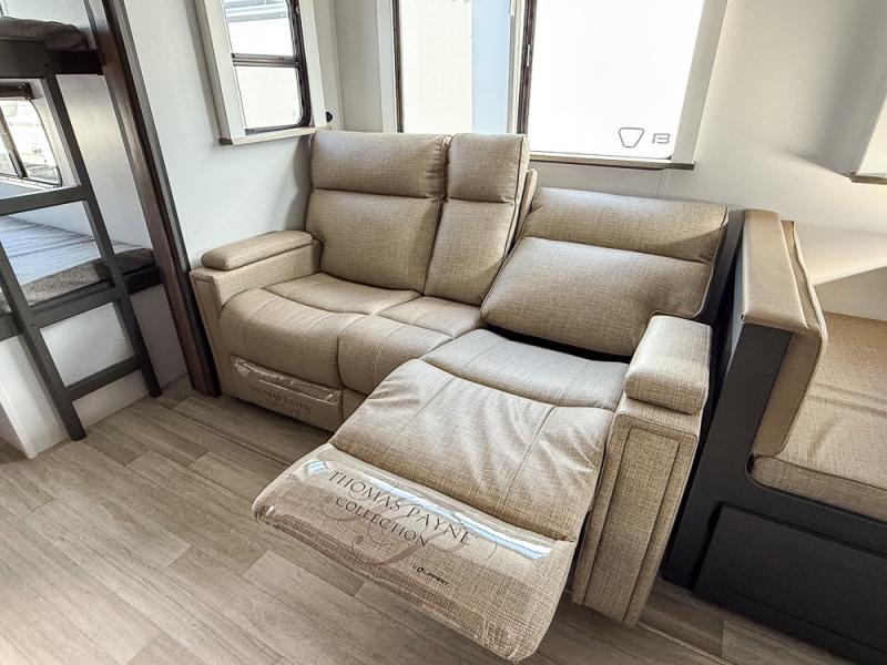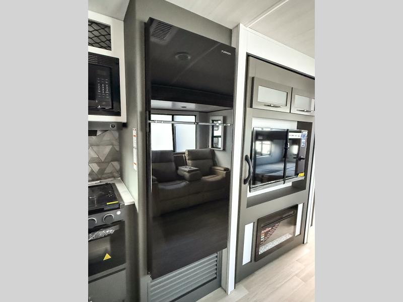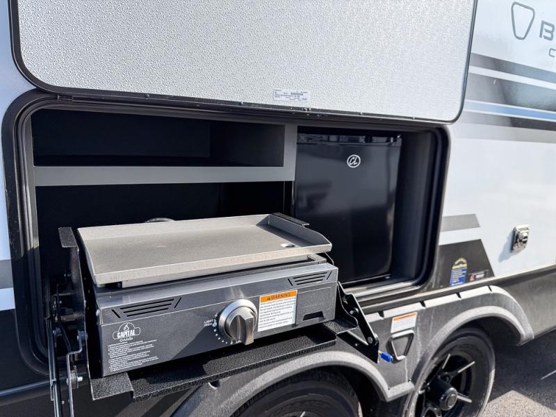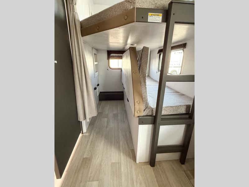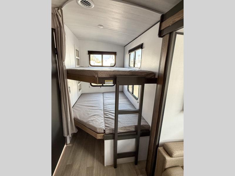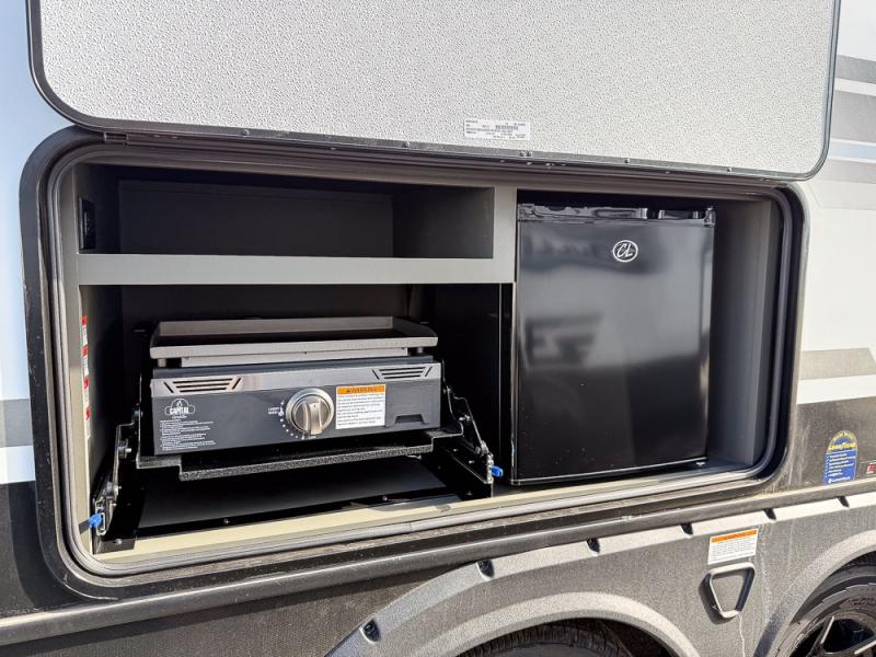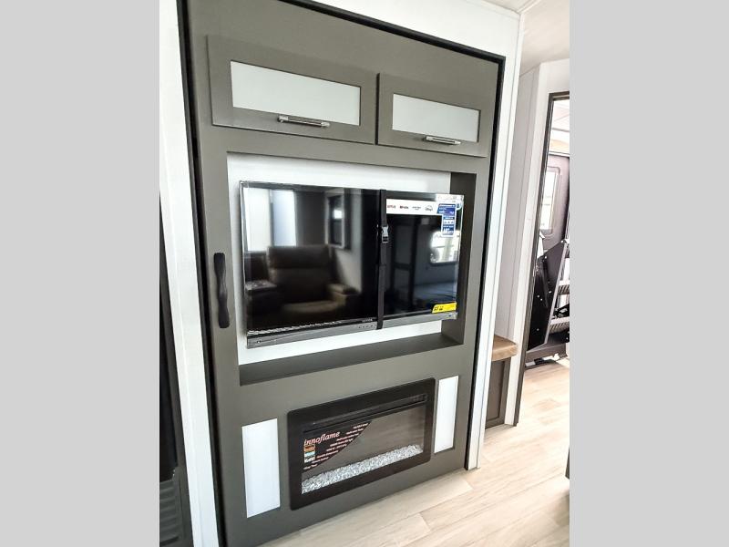 The whole gang will love camping in this travel trailer with double-size bunks, an outdoor kitchen, and a front private bedroom for the owners. You will find plenty of storage throughout, including storage under the flip-up bunk, a kitchen pantry, and an exterior pass-thru storage. Everyone can meet in the main living area to relax on the tri-fold sofa or play a game at the Do-More dinette table. There is even a fireplace across from the sofa for a cozy evening indoors. The chef of your group will have a fully-equipped indoor kitchen plus an outdoor kitchen to cook meals each day. And since there are dual entry doors, you can enter in through the kitchen or full bathroom for convenience!