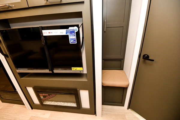 The whole gang will love camping in this travel trailer with double-size bunks, an outdoor kitchen, and a front private bedroom for the owners. You will find plenty of storage throughout, including storage under the flip-up bunk, a kitchen pantry, and an exterior pass-thru storage. Everyone can meet in the main living area to relax on the tri-fold sofa or play a game at the Do-More dinette table. There is even a fireplace across from the sofa for a cozy evening indoors. The chef of your group will have a fully-equipped indoor kitchen plus an outdoor kitchen to cook meals each day. And since there are dual entry doors, you can enter in through the kitchen or full bathroom for convenience!