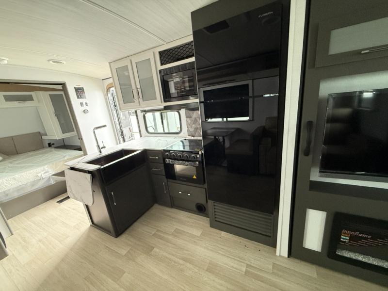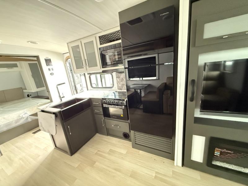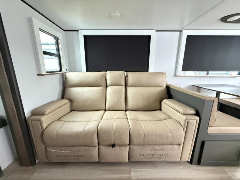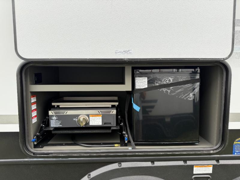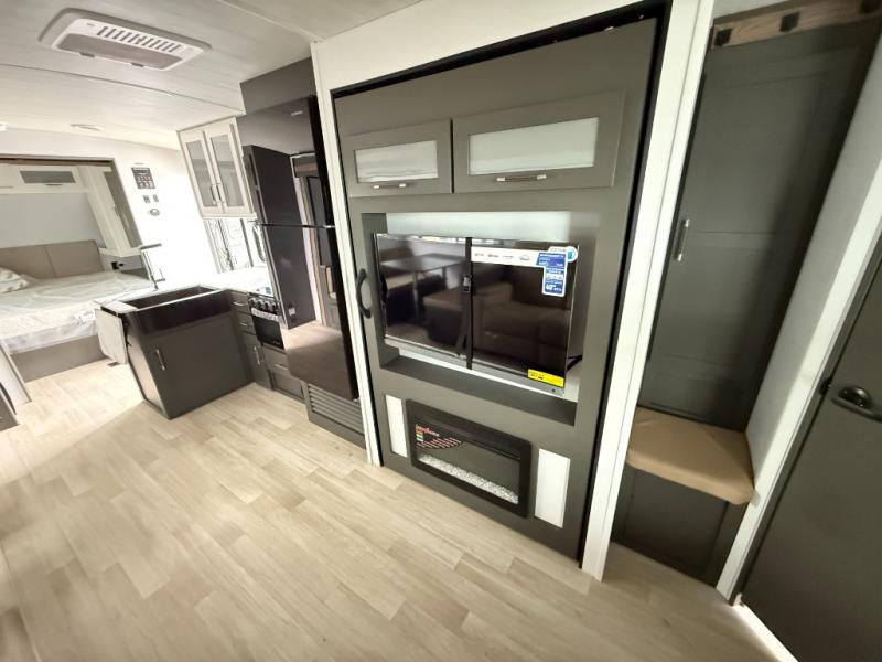 The whole gang will love camping in this travel trailer with double-size bunks, an outdoor kitchen, and a front private bedroom for the owners. You will find plenty of storage throughout, including storage under the flip-up bunk, a kitchen pantry, and an exterior pass-thru storage. Everyone can meet in the main living area to relax on the tri-fold sofa or play a game at the Do-More dinette table. There is even a fireplace across from the sofa for a cozy evening indoors. The chef of your group will have a fully-equipped indoor kitchen plus an outdoor kitchen to cook meals each day. And since there are dual entry doors, you can enter in through the kitchen or full bathroom for convenience!