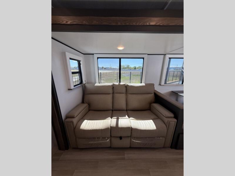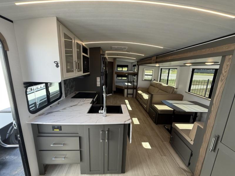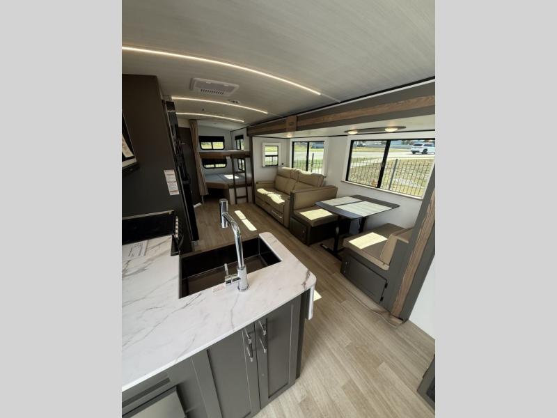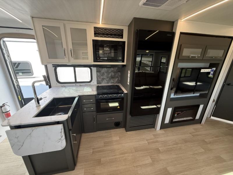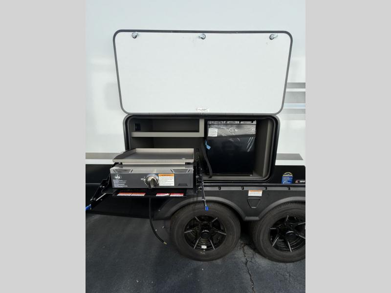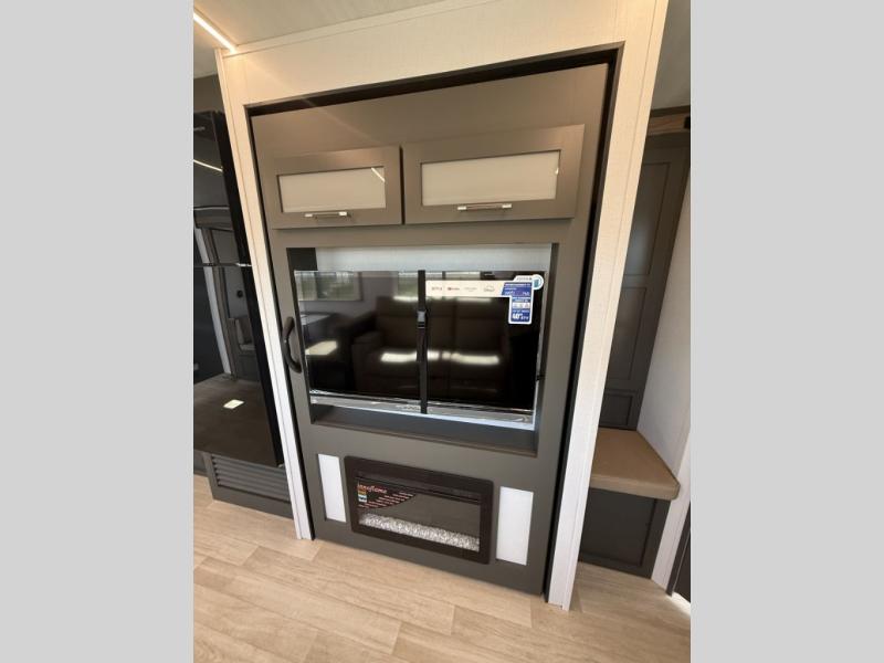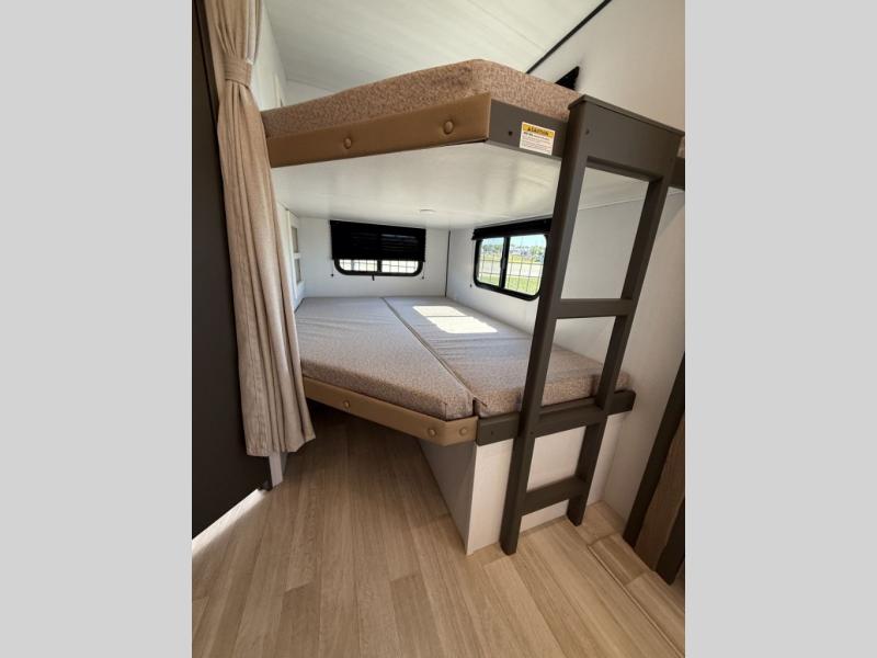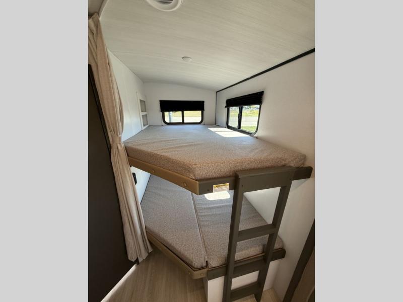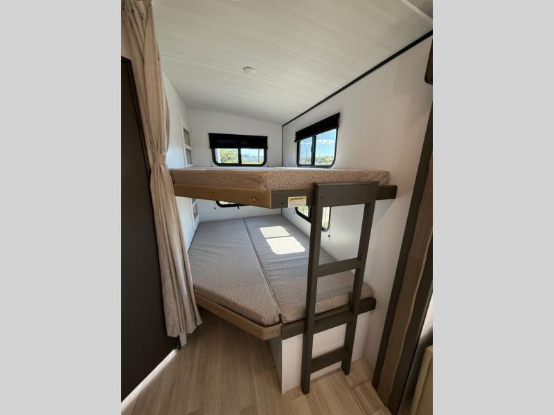 The whole gang will love camping in this travel trailer with double-size bunks, an outdoor kitchen, and a front private bedroom for the owners. You will find plenty of storage throughout, including storage under the flip-up bunk, a kitchen pantry, and an exterior pass-thru storage. Everyone can meet in the main living area to relax on the tri-fold sofa or play a game at the Do-More dinette table. There is even a fireplace across from the sofa for a cozy evening indoors. The chef of your group will have a fully-equipped indoor kitchen plus an outdoor kitchen to cook meals each day. And since there are dual entry doors, you can enter in through the kitchen or full bathroom for convenience!