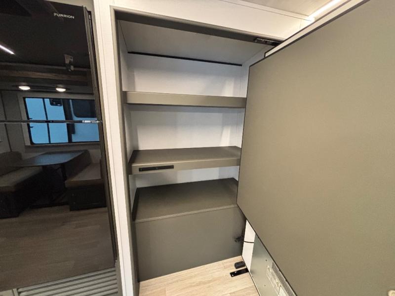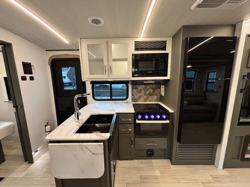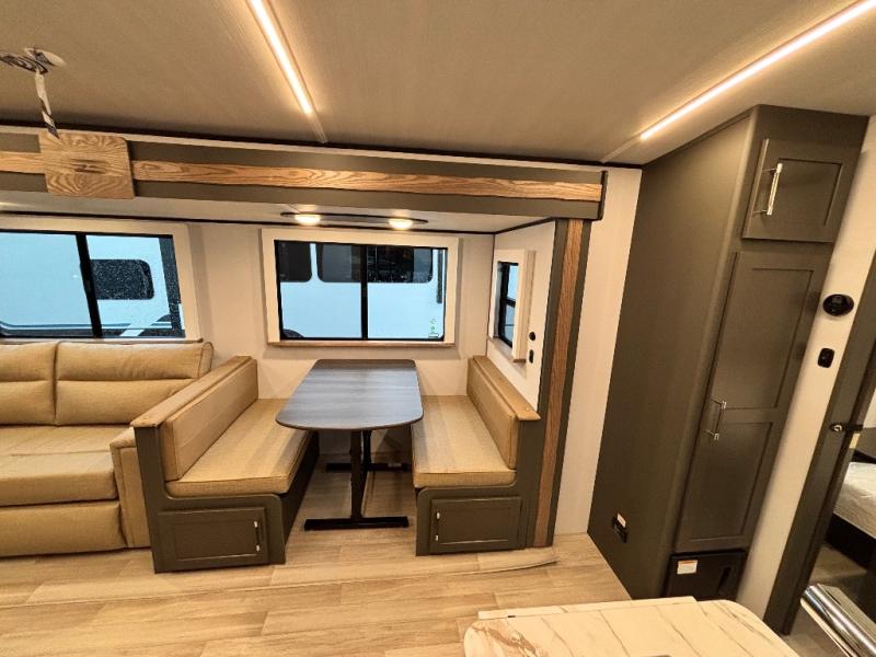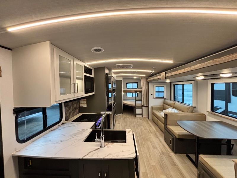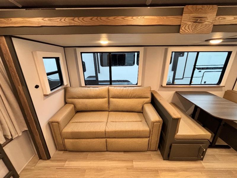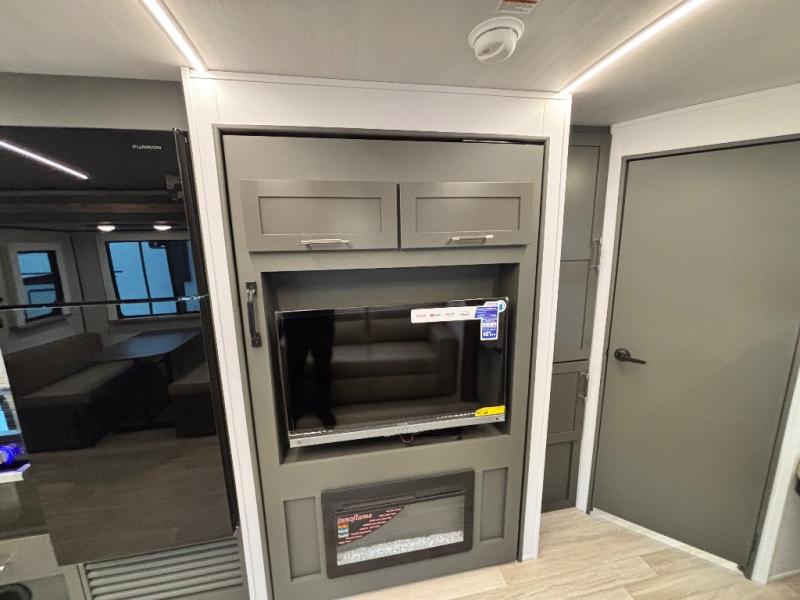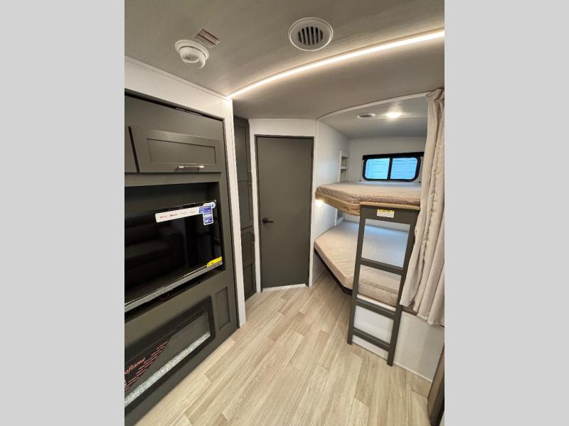 The whole gang will love camping in this travel trailer with double-size bunks, an outdoor kitchen, and a front private bedroom for the owners. You will find plenty of storage throughout, including storage under the flip-up bunk, a kitchen pantry, and an exterior pass-thru storage. Everyone can meet in the main living area to relax on the tri-fold sofa or play a game at the Do-More dinette table. There is even a fireplace across from the sofa for a cozy evening indoors. The chef of your group will have a fully-equipped indoor kitchen plus an outdoor kitchen to cook meals each day. And since there are dual entry doors, you can enter in through the kitchen or full bathroom for convenience!