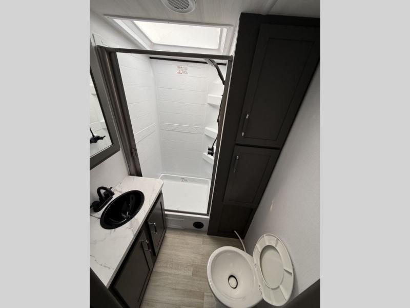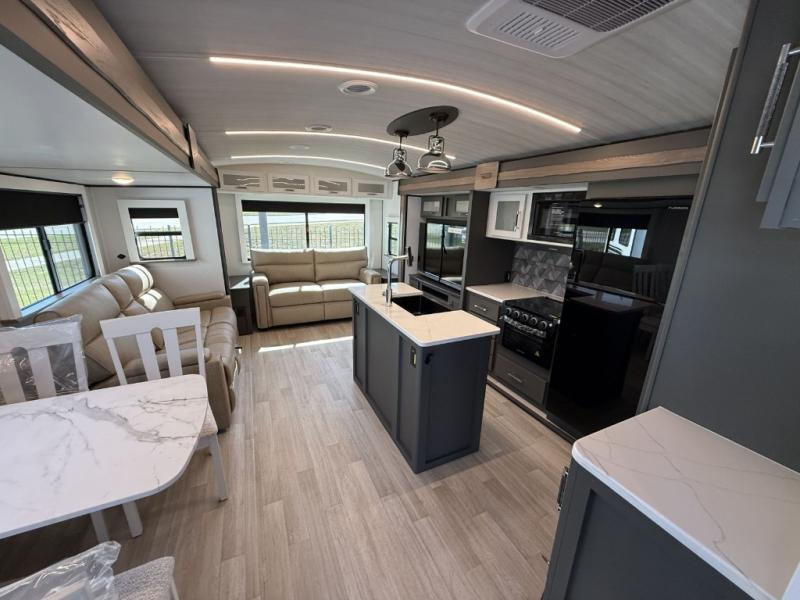 You'll be camping in style with this trailer in tow. You will wake up each morning on a king bed slide out, and there is a closet up front to easily get dressed. A wardrobe with TV prep is also found in the bedroom, along with washer/dryer prep to make wash day easier than ever. If you had guests stay over, they'll be waking up on the tri-fold sofa in the rear living area. Once everyone is ready for the day, you can make breakfast on the three-burner cooktop or in the microwave oven, and there is a 10-cu. ft. refrigerator where milk and eggs can go back in. This Bullet Premium kitchen also includes a kitchen island, a pantry, plus a hutch for ample storage space!