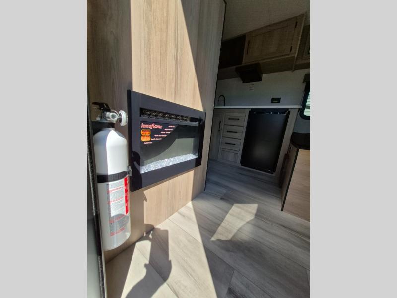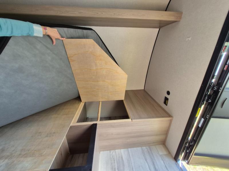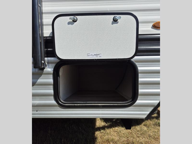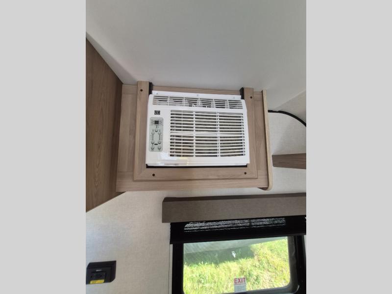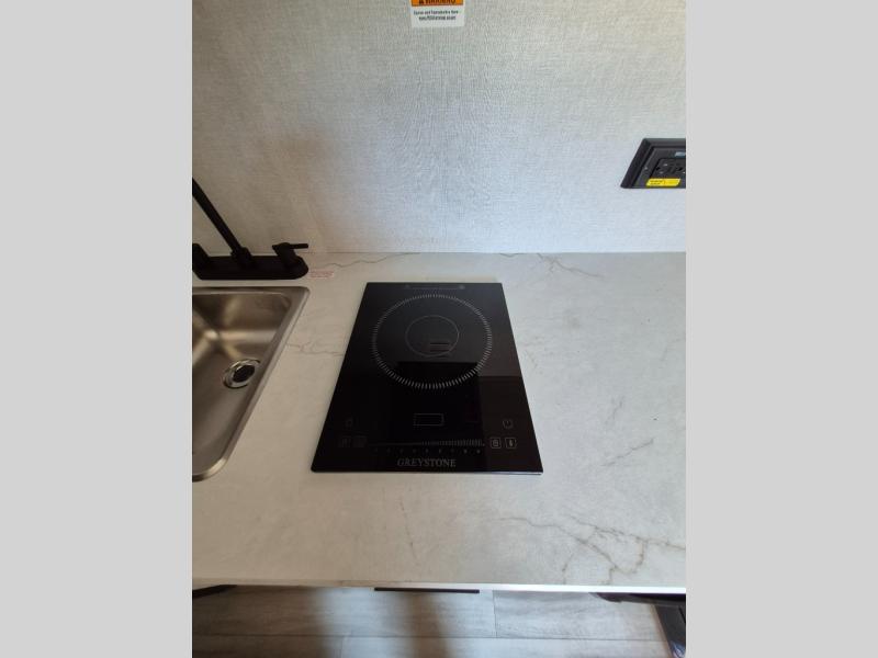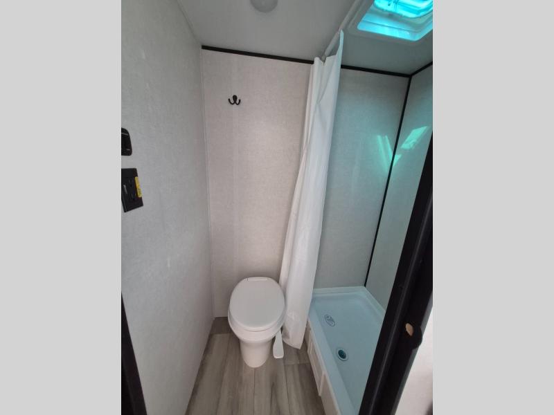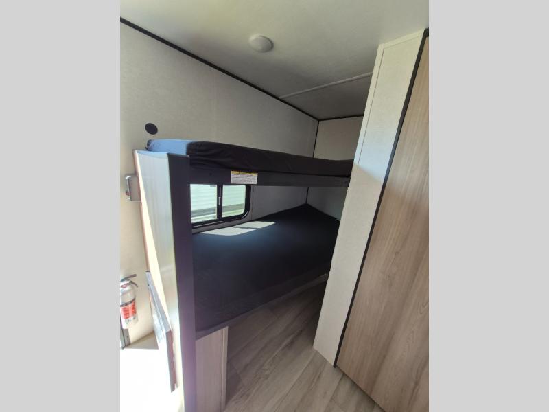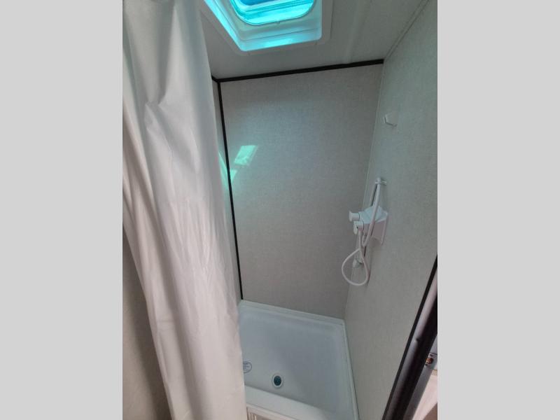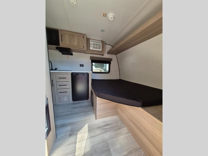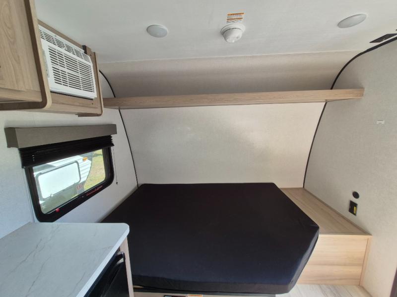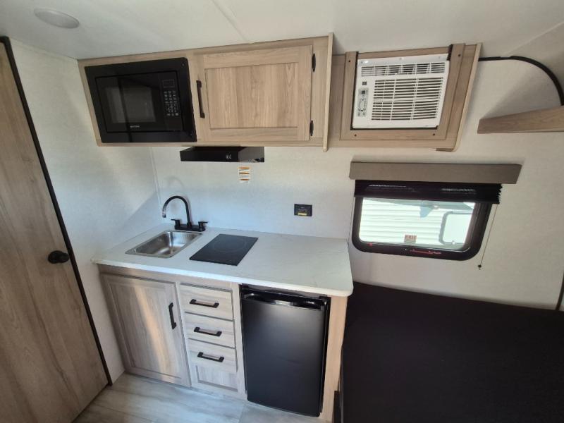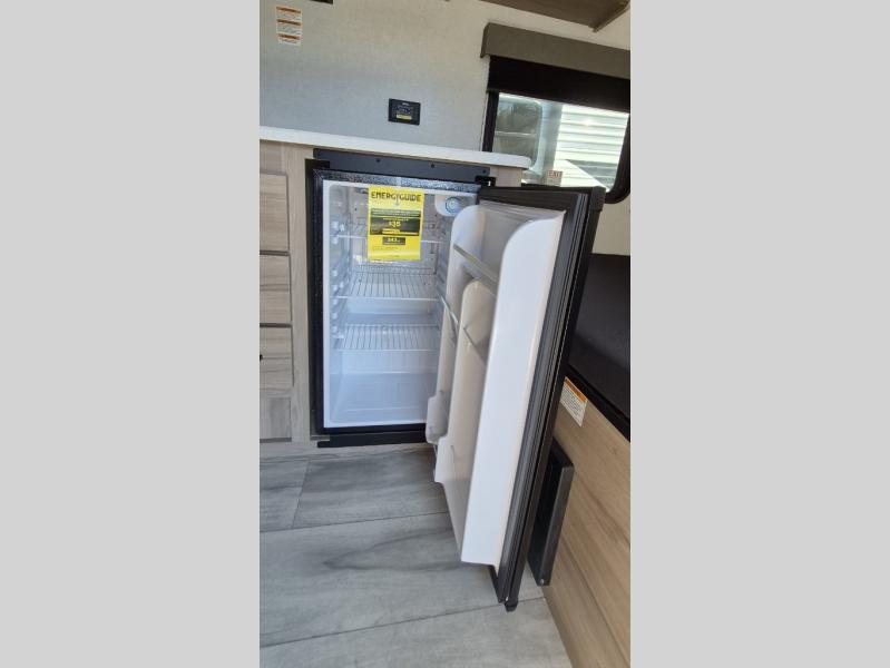 This compact travel trailer lets you camp in comfort at the location of your choice! Since there is a front queen bed, you won't have to sleep on an air mattress, and the shelf above the bed will be perfect for your belongings. Bunk beds provide additional sleeping space for your guests or little ones, and the private bath includes a shower and toilet so you won't have to use the camp's facilities at night. This model includes an induction cooktop and microwave oven to cook meals, plus a 3.2 cu. ft. 110V refrigerator for food storage. And the 8' power awning outdoors provides a place for you to sit in your camp chairs after dinner!