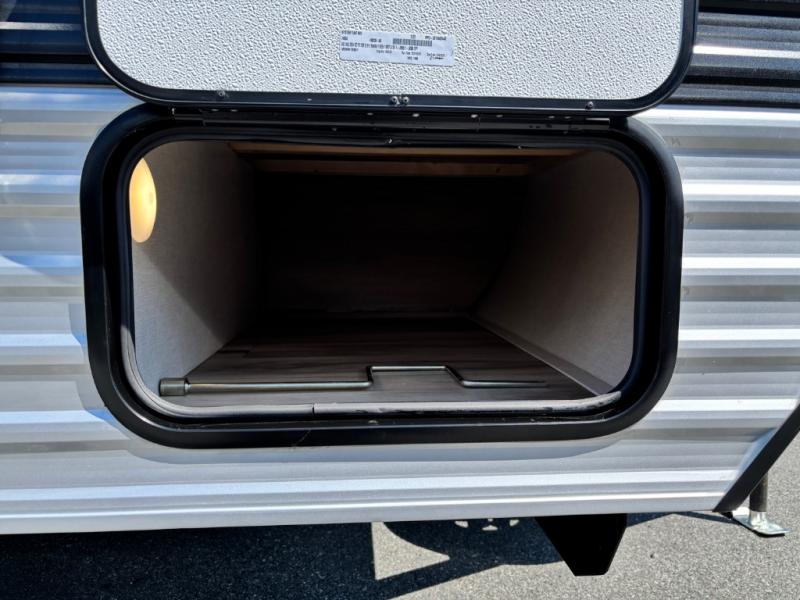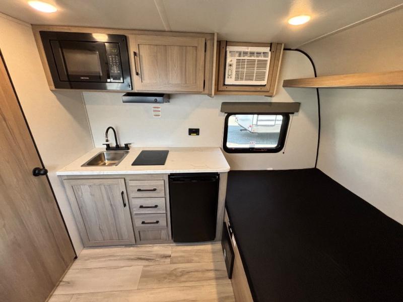 This compact travel trailer lets you camp in comfort at the location of your choice! Since there is a front queen bed, you won't have to sleep on an air mattress, and the shelf above the bed will be perfect for your belongings. Bunk beds provide additional sleeping space for your guests or little ones, and the private bath includes a shower and toilet so you won't have to use the camp's facilities at night. This model includes an induction cooktop and microwave oven to cook meals, plus a 3.2 cu. ft. 110V refrigerator for food storage. And the 8' power awning outdoors provides a place for you to sit in your camp chairs after dinner!
