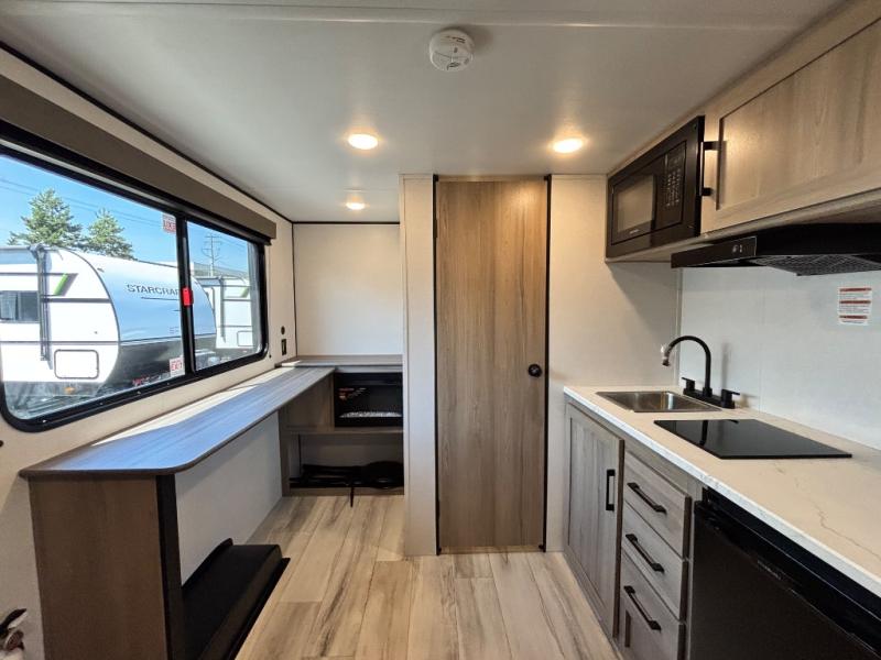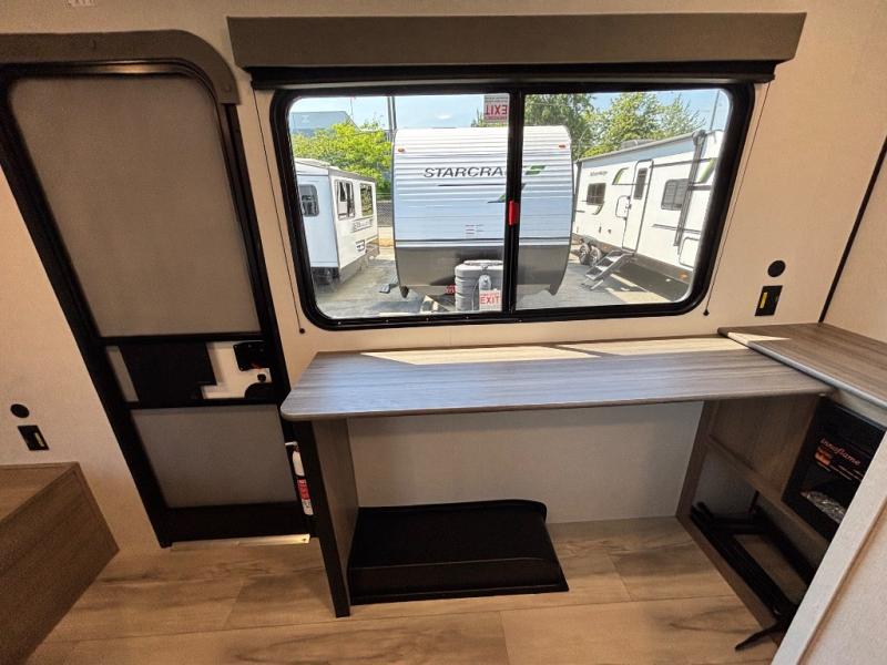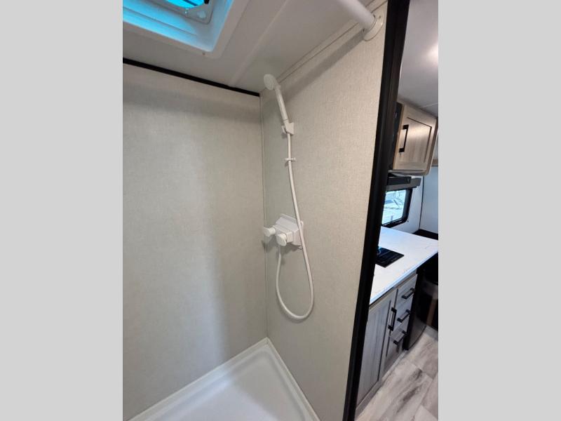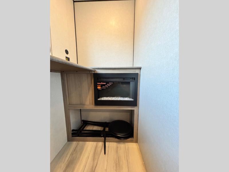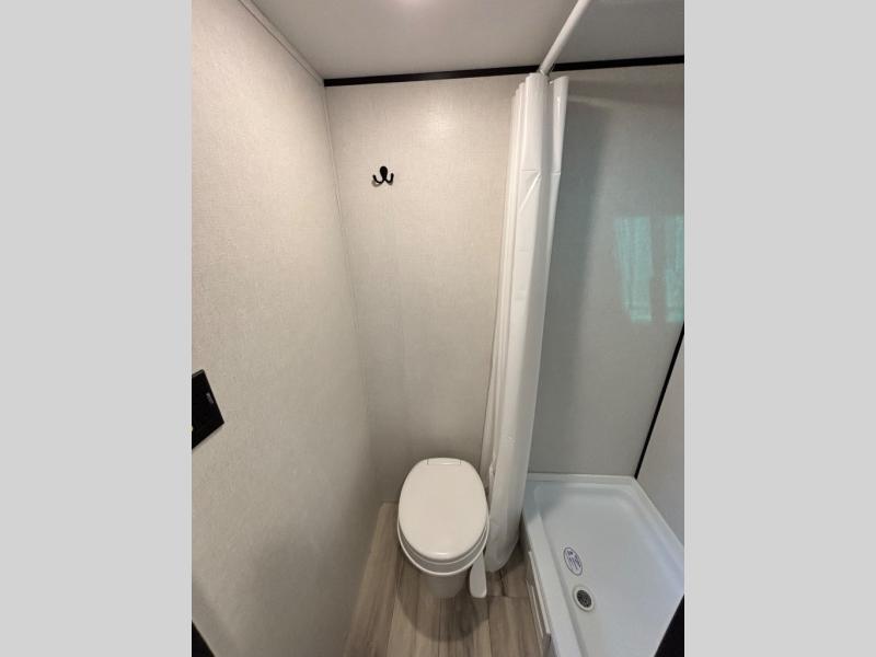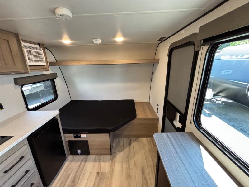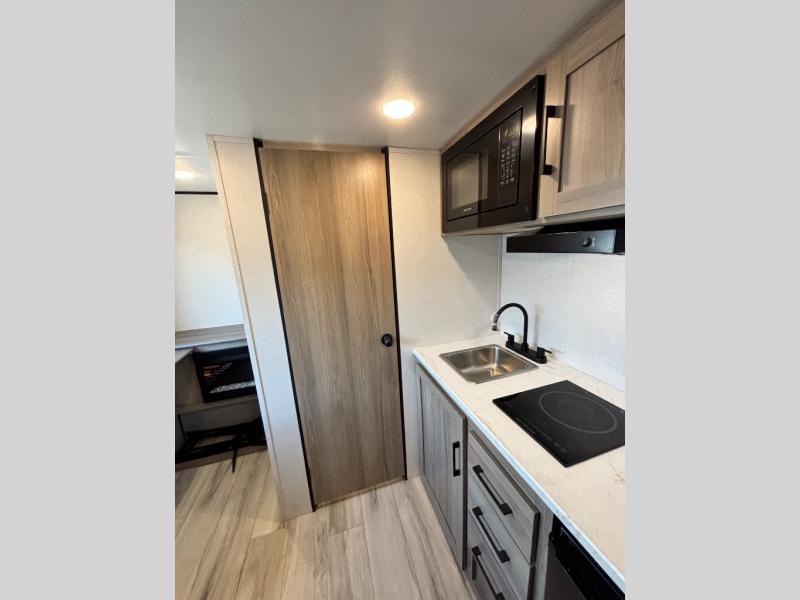 This compact travel trailer lets you camp in comfort at the location of your choice! Since there is a front queen bed, you won't have to sleep on an air mattress, and the shelf above the bed will be perfect for your belongings. Bunk beds provide additional sleeping space for your guests or little ones, and the private bath includes a shower and toilet so you won't have to use the camp's facilities at night. This model includes an induction cooktop and microwave oven to cook meals, plus a 3.2 cu. ft. 110V refrigerator for food storage. And the 8' power awning outdoors provides a place for you to sit in your camp chairs after dinner!