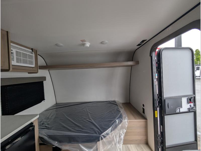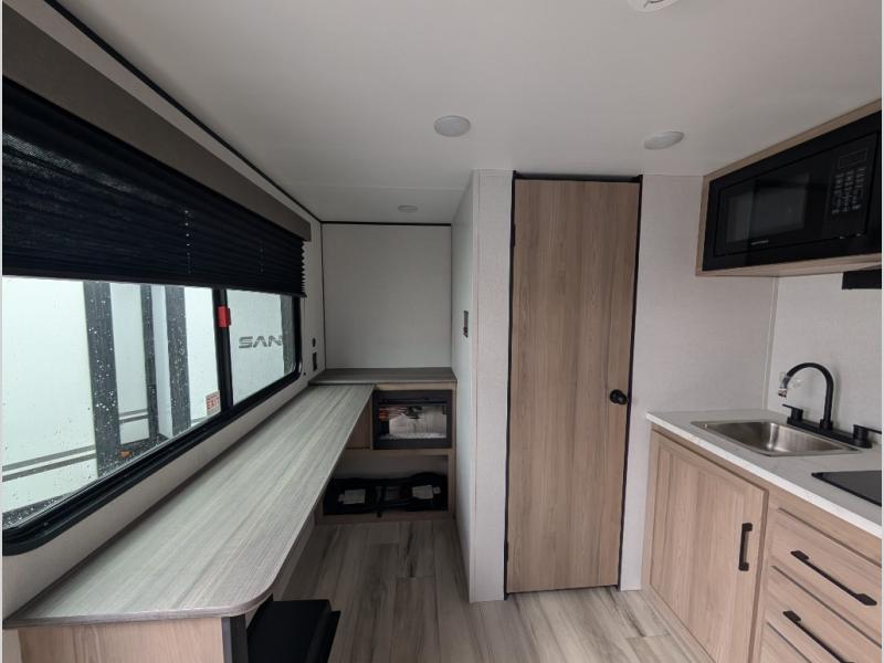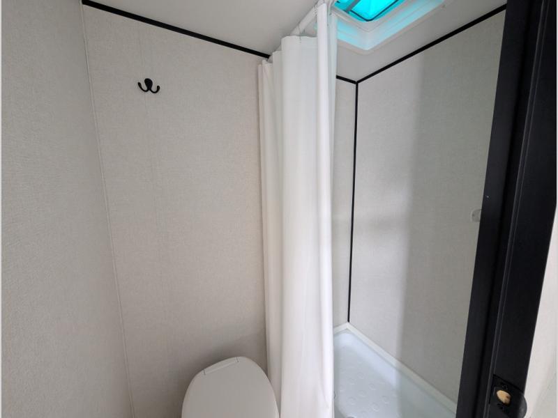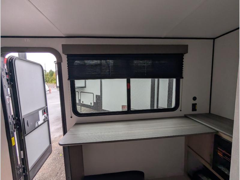 This travel trailer is perfect for a couple. The beautifully appointed bathroom is fully equipped for your needs, providing a serene space to unwind. The cozy fireplace creates a warm and welcoming atmosphere, perfect for relaxing with loved ones. The stylish bar with stools is great for socializing and enjoying meals. In the kitchen, the convenient microwave enables quick and easy meal preparation, while the spacious refrigerator keeps your food and drinks fresh. The ample overhead cabinets provide plenty of storage space, and the single burner cooktop gives you the freedom to cook your favorite homemade dishes. The plush queen bed is the perfect spot to rest and recharge, and the practical shelf provides additional storage for your favorite books, decorations, or personal items. The practical exterior features include a durable exterior awning that provides shade and protection from the elements, while the spacious exterior storage offers ample space for your outdoor gear and equipment.