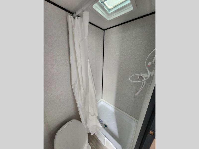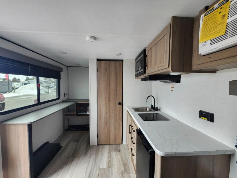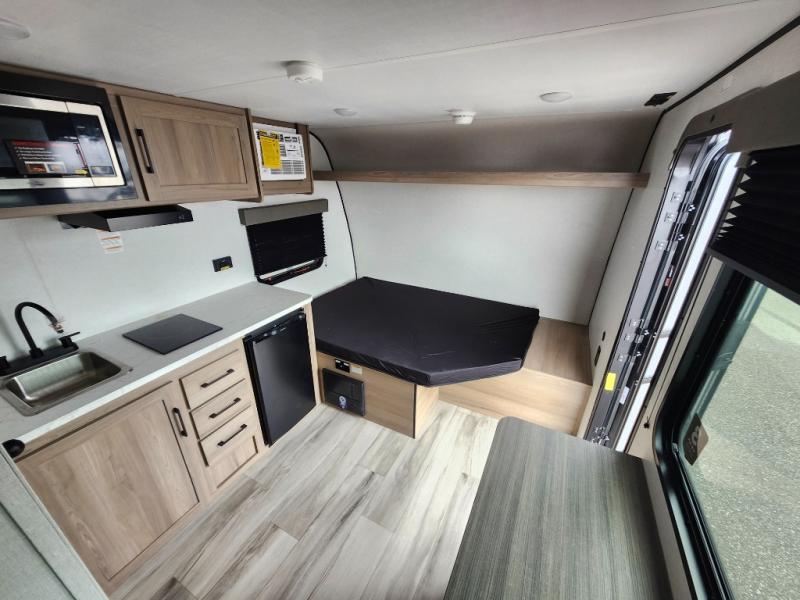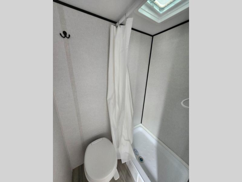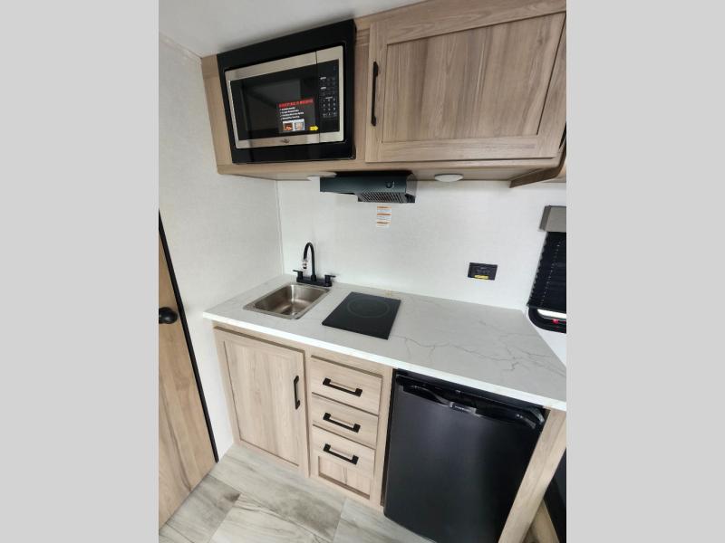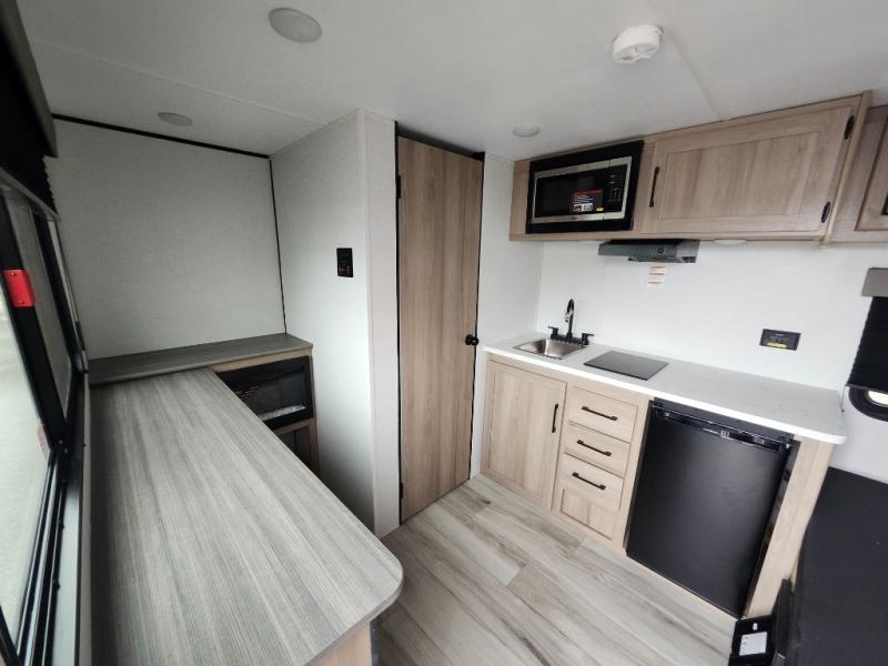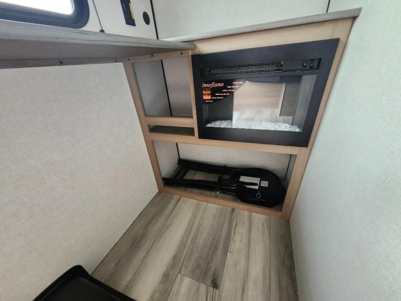 This travel trailer is perfect for a couple. The beautifully appointed bathroom is fully equipped for your needs, providing a serene space to unwind. The cozy fireplace creates a warm and welcoming atmosphere, perfect for relaxing with loved ones. The stylish bar with stools is great for socializing and enjoying meals. In the kitchen, the convenient microwave enables quick and easy meal preparation, while the spacious refrigerator keeps your food and drinks fresh. The ample overhead cabinets provide plenty of storage space, and the single burner cooktop gives you the freedom to cook your favorite homemade dishes. The plush queen bed is the perfect spot to rest and recharge, and the practical shelf provides additional storage for your favorite books, decorations, or personal items. The practical exterior features include a durable exterior awning that provides shade and protection from the elements, while the spacious exterior storage offers ample space for your outdoor gear and equipment.