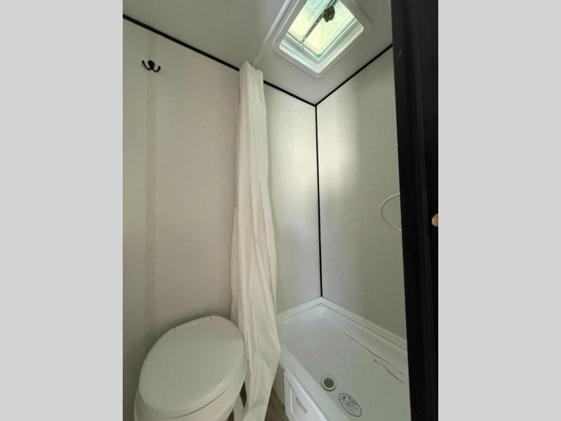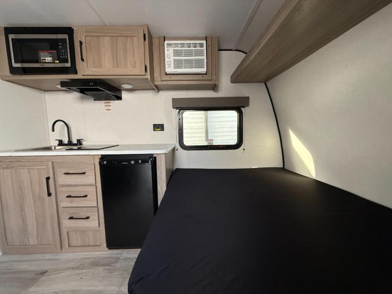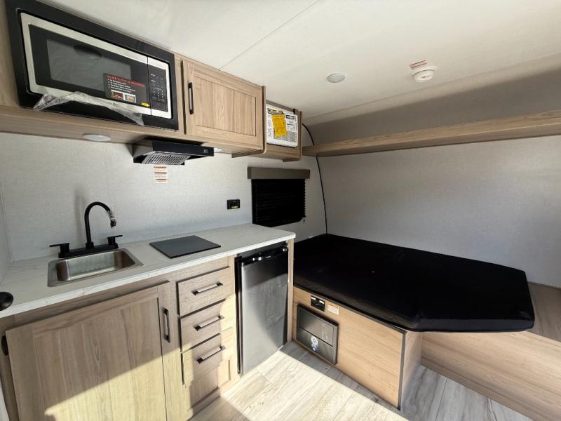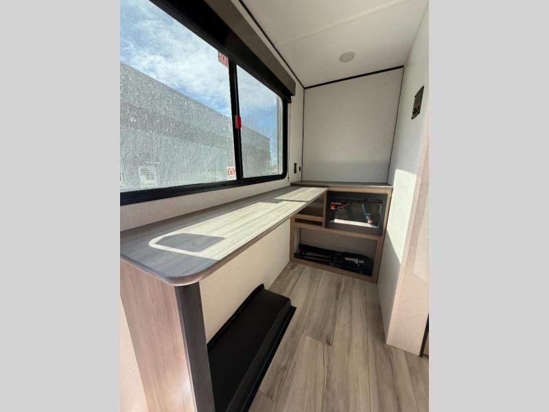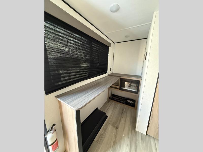 This travel trailer is perfect for a couple. The beautifully appointed bathroom is fully equipped for your needs, providing a serene space to unwind. The cozy fireplace creates a warm and welcoming atmosphere, perfect for relaxing with loved ones. The stylish bar with stools is great for socializing and enjoying meals. In the kitchen, the convenient microwave enables quick and easy meal preparation, while the spacious refrigerator keeps your food and drinks fresh. The ample overhead cabinets provide plenty of storage space, and the single burner cooktop gives you the freedom to cook your favorite homemade dishes. The plush queen bed is the perfect spot to rest and recharge, and the practical shelf provides additional storage for your favorite books, decorations, or personal items. The practical exterior features include a durable exterior awning that provides shade and protection from the elements, while the spacious exterior storage offers ample space for your outdoor gear and equipment.