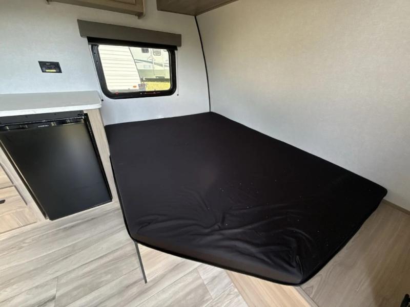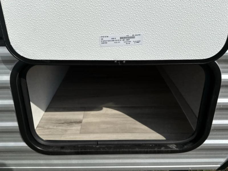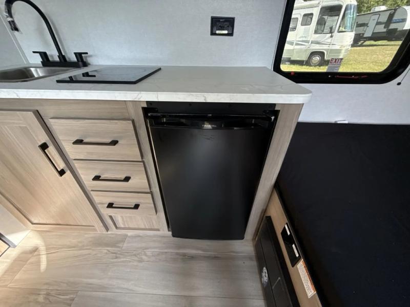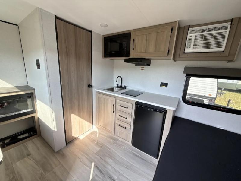 This travel trailer is perfect for a couple. The beautifully appointed bathroom is fully equipped for your needs, providing a serene space to unwind. The cozy fireplace creates a warm and welcoming atmosphere, perfect for relaxing with loved ones. The stylish bar with stools is great for socializing and enjoying meals. In the kitchen, the convenient microwave enables quick and easy meal preparation, while the spacious refrigerator keeps your food and drinks fresh. The ample overhead cabinets provide plenty of storage space, and the single burner cooktop gives you the freedom to cook your favorite homemade dishes. The plush queen bed is the perfect spot to rest and recharge, and the practical shelf provides additional storage for your favorite books, decorations, or personal items. The practical exterior features include a durable exterior awning that provides shade and protection from the elements, while the spacious exterior storage offers ample space for your outdoor gear and equipment.