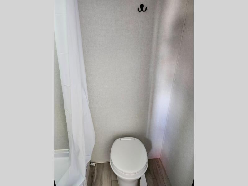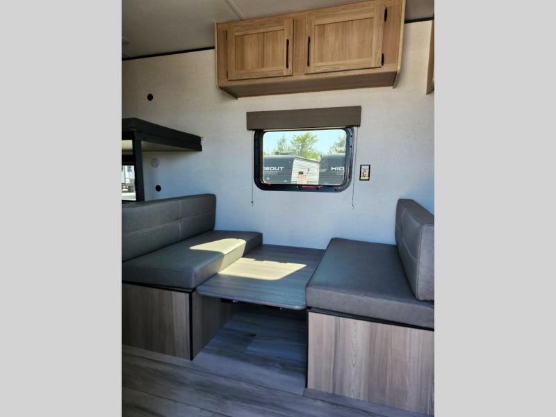 After making dinner on the two burner cooktop or inside the microwave, you can dine at the booth dinette or outside under the 8' power awning if you brought along your camping chairs. Either way you will be comfortable and the dinette may even sleep one person if needed. After playing outdoors all day, everyone can return to get cleaned up in the private toilet and shower room then fall asleep on the queen bed up front or the bunk beds in the rear. And everyone can wake up the next morning to do it over again.