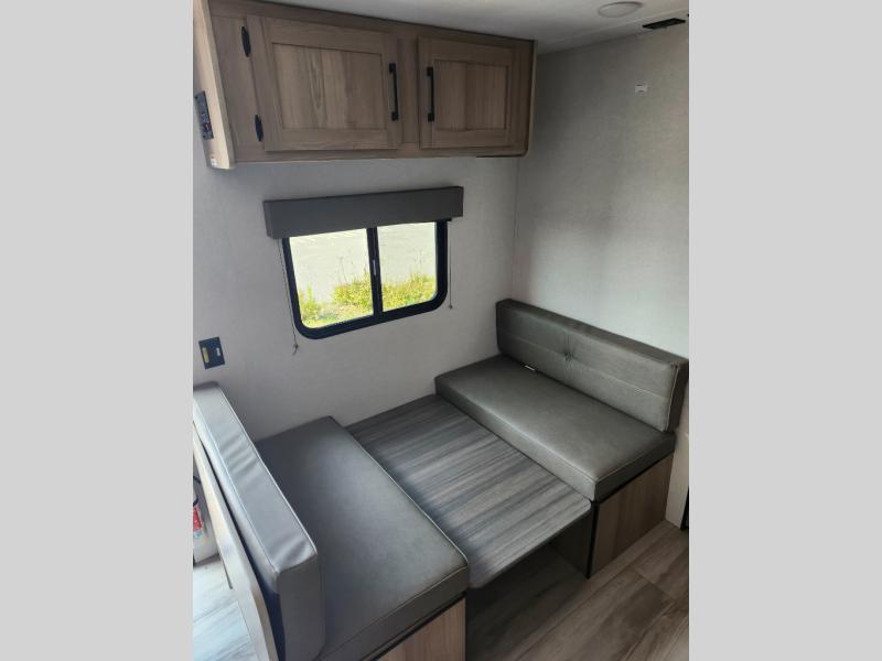 After making dinner on the two burner cooktop or microwave, you can dine at the booth dinette or outside under the 8' power awning if you brought along your camping chairs. Either way you will be comfortable and the dinette can even be converted to sleep one person if needed. After playing outdoors all day, everyone can return to get cleaned up in the full rear bath including a shower. There is even a linen closet and space for some clothes that hang. You may then fall asleep on the queen bed up front or the dinette once converted so you can start enjoying the outdoors again the next day.