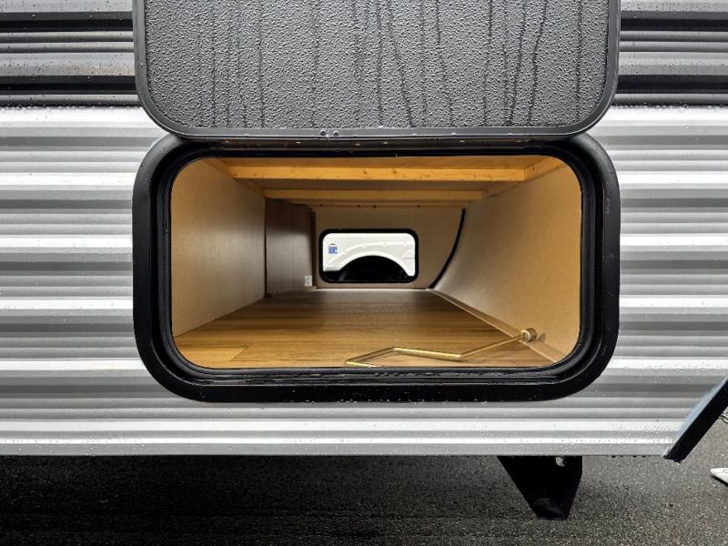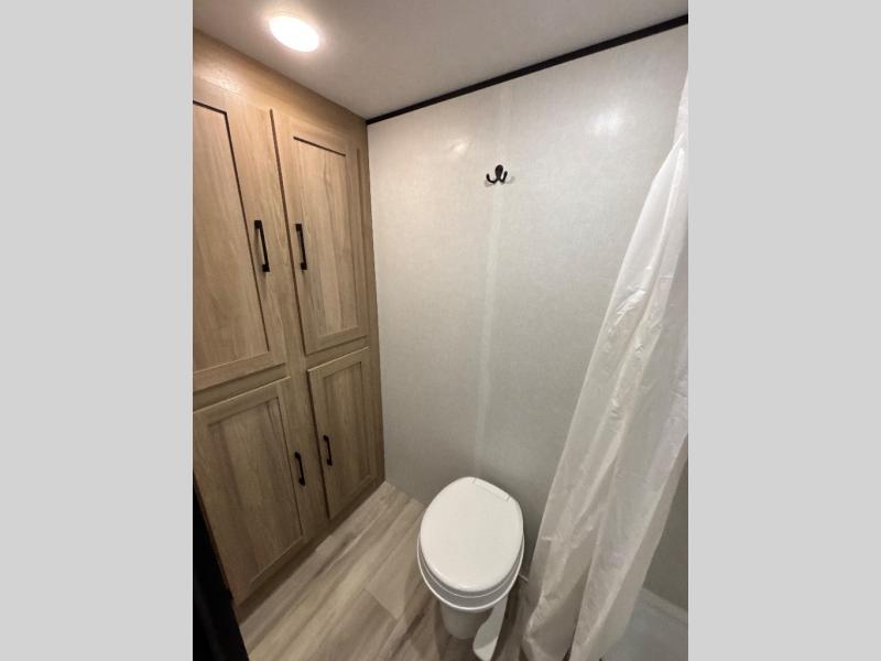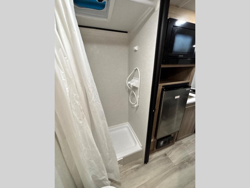 After making dinner on the two burner cooktop or microwave, you can dine at the booth dinette or outside under the 8' power awning if you brought along your camping chairs. Either way you will be comfortable and the dinette can even be converted to sleep one person if needed. After playing outdoors all day, everyone can return to get cleaned up in the full rear bath including a shower. There is even a linen closet and space for some clothes that hang. You may then fall asleep on the queen bed up front or the dinette once converted so you can start enjoying the outdoors again the next day.