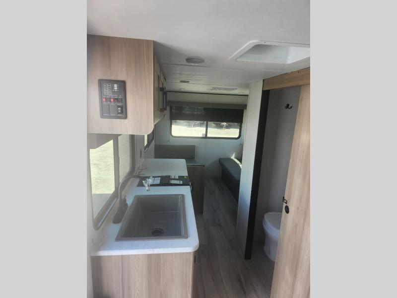 With any Coleman travel trailer, you will experience Keystone's quality throughout, plus enjoy lightweight towing to the campground or RV park. There is a walkable roof, tinted safety glass windows, and a power awning outdoors for an inviting space to relax. The friction hinge entry door is another convenience you'll appreciate, and there is Furrion backup camera prep if you want the option to make parking easier. Inside, you'll find blackout night shades, a 6' 8" ceiling height, bedside outlets, and many more comforts.